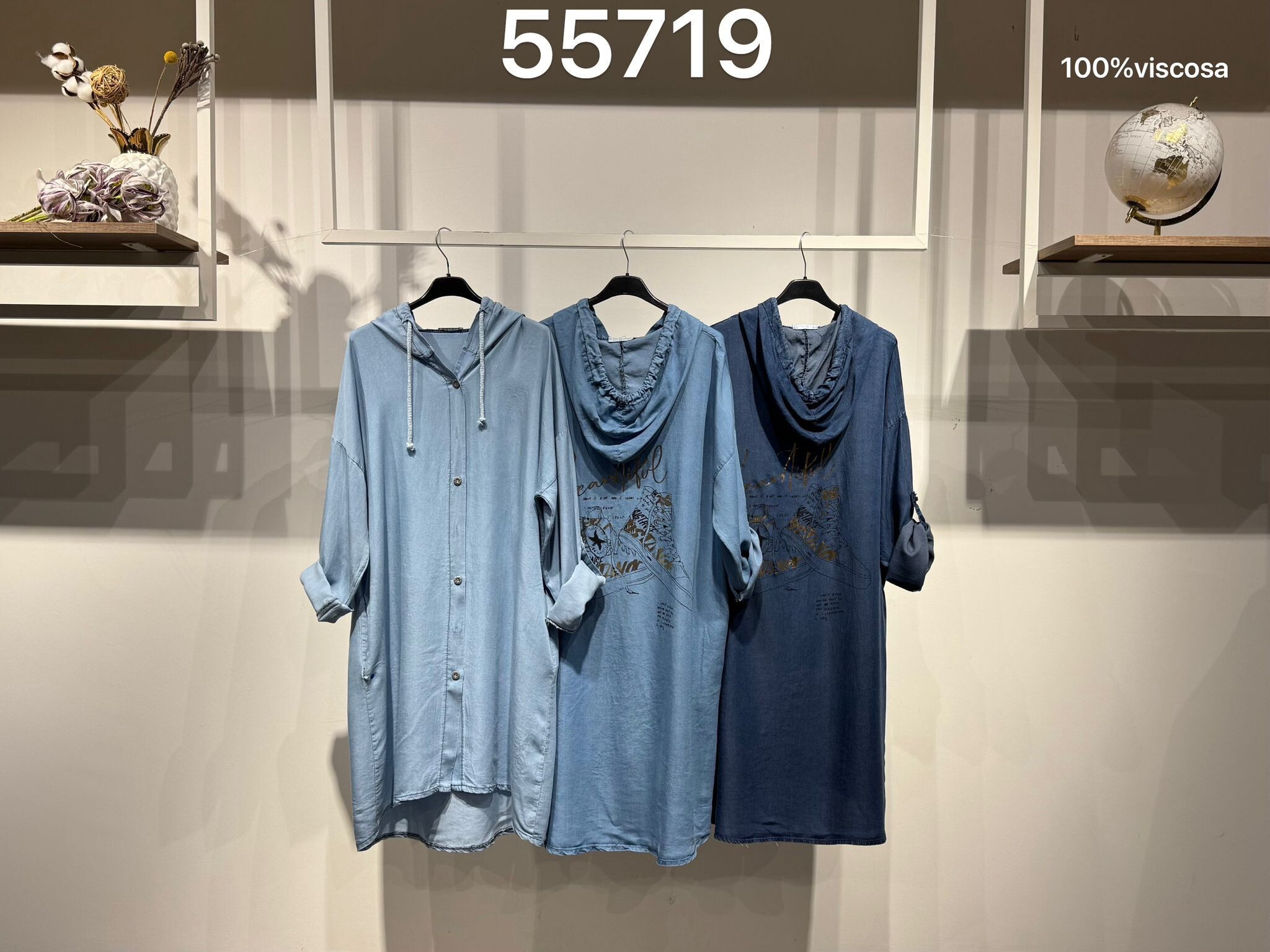 Dámský džínový kardigan s kapucí z odlehčené džínoviny. Kardigan je na knoflíky, má regulaci na rukávu na knoflík a na zadní straně je stylový potisk tenisek.