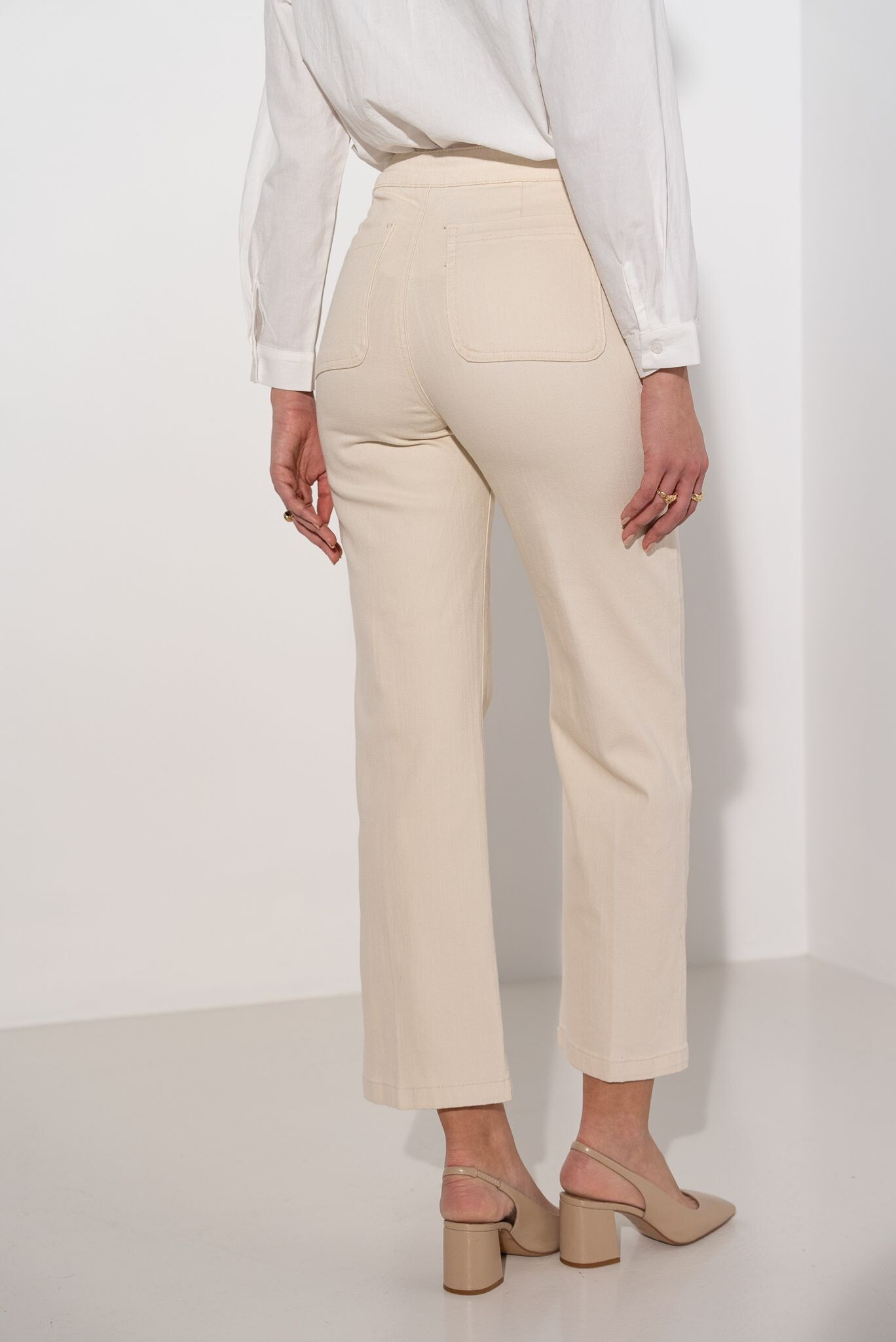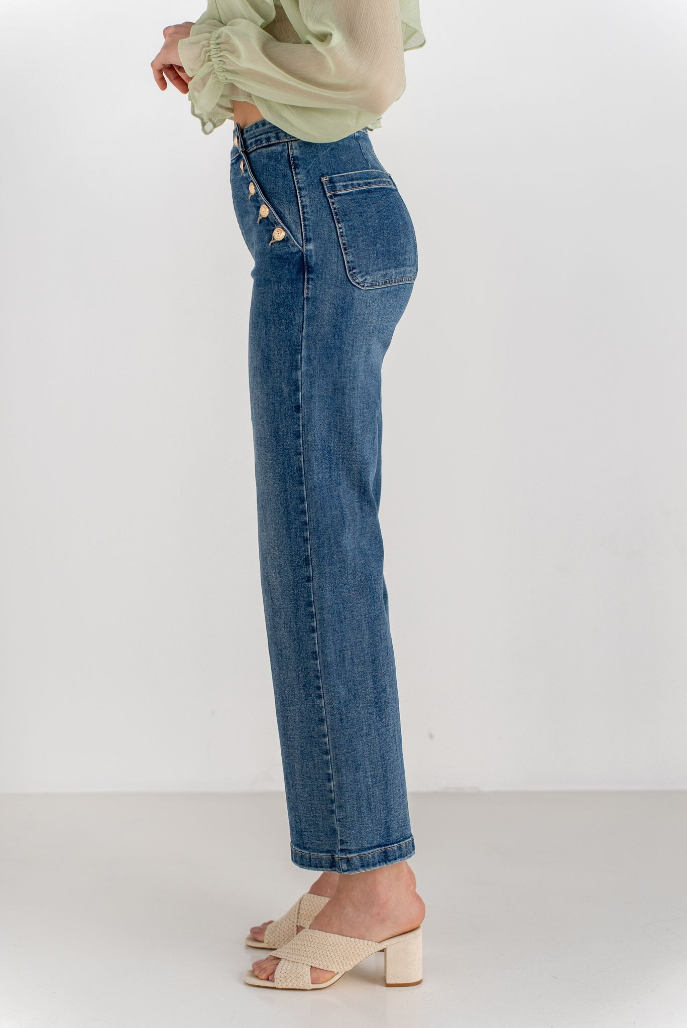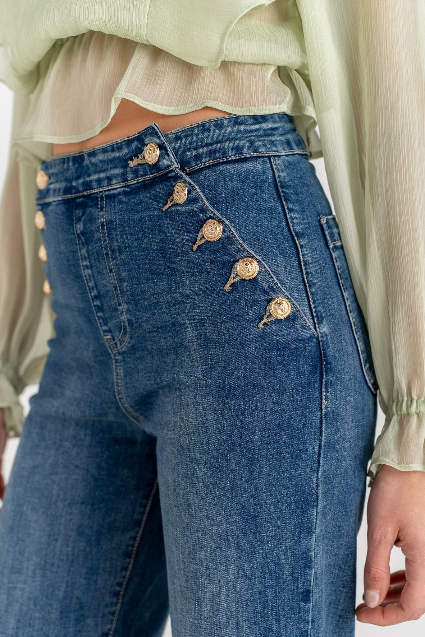 Elegantní džínové kalhoty s rafinovaným zapínáním na knoflíky po stranách. Na zadní straně našité kapsy.