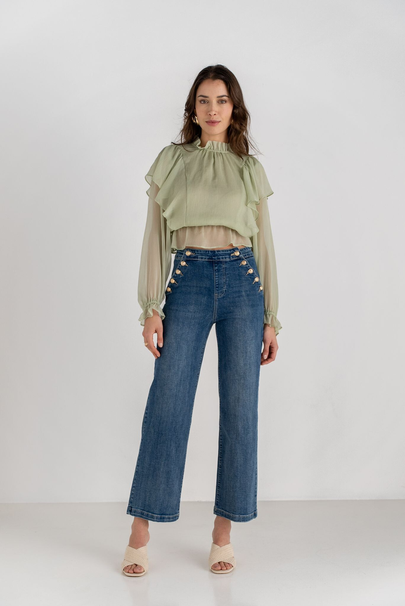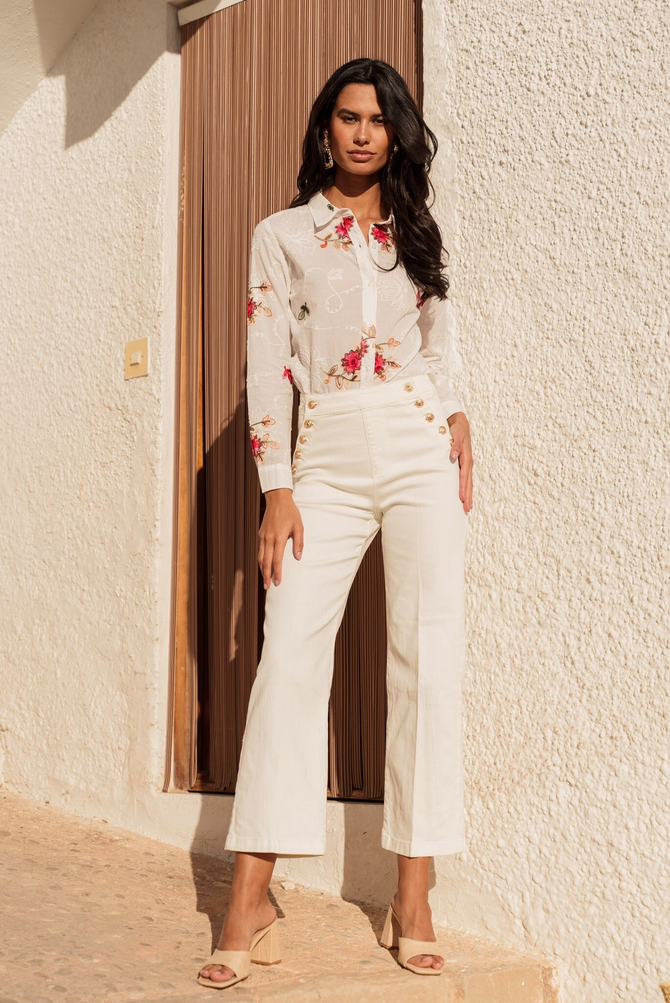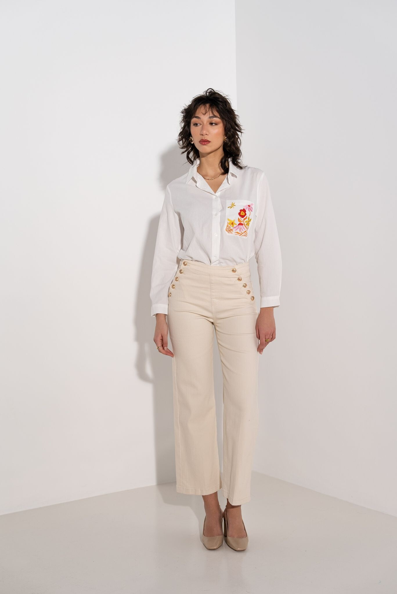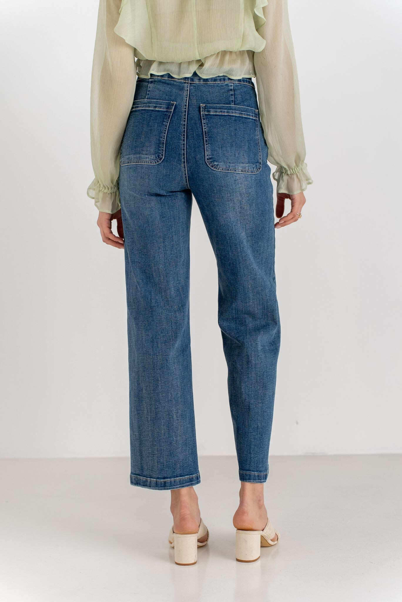 Elegantní džínové kalhoty s rafinovaným zapínáním na knoflíky po stranách. Na zadní straně našité kapsy.
