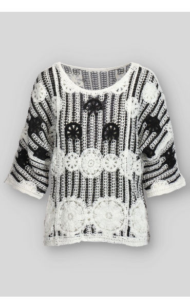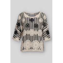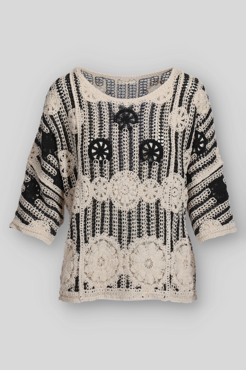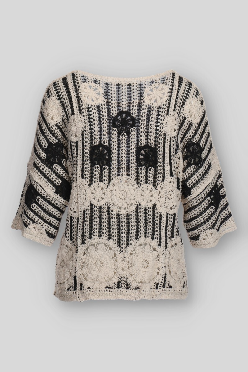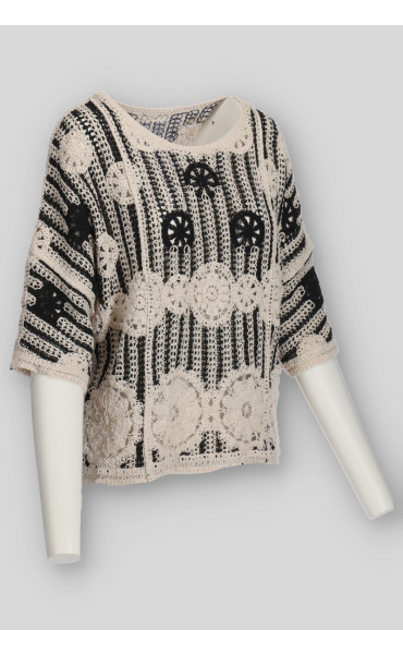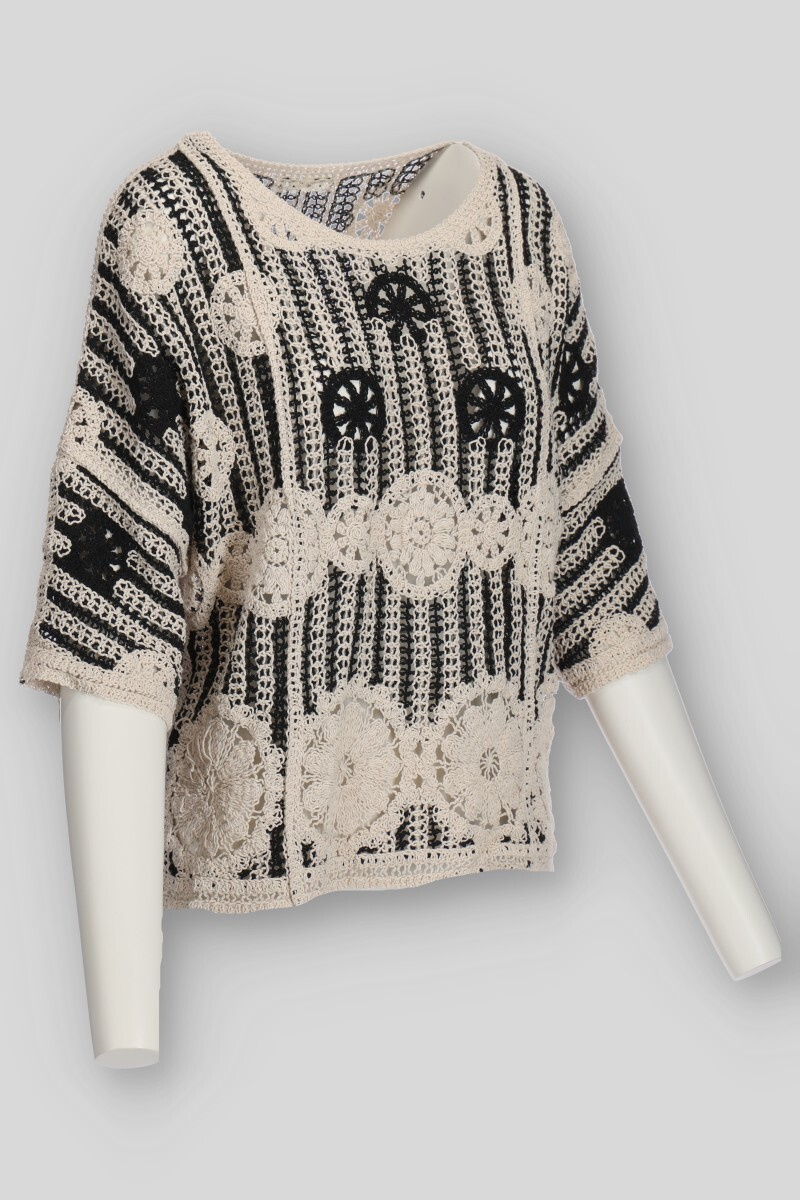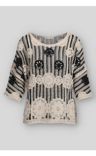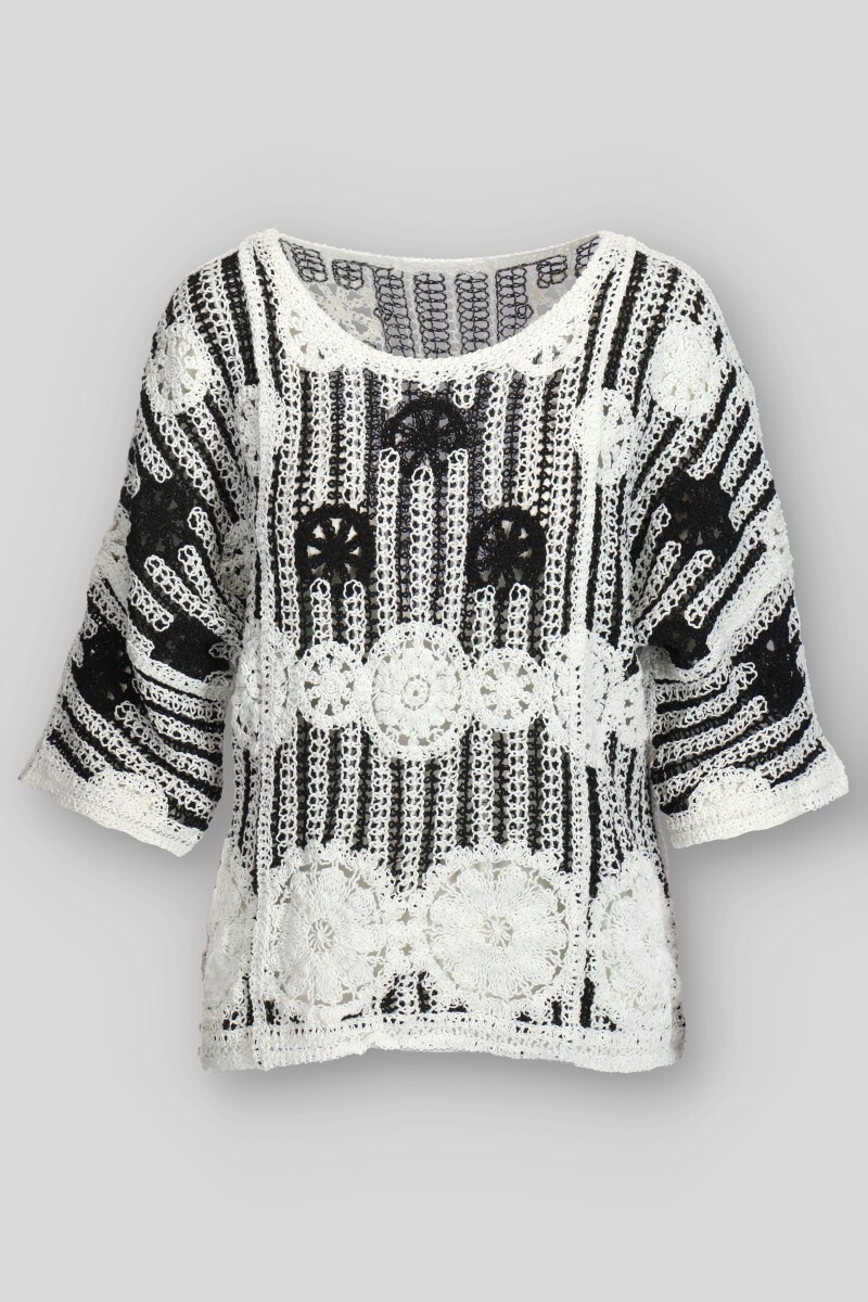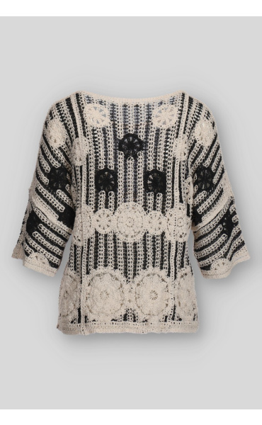 Elegantní háčkovaná halenka v BOHO stylu s raglánovým 3/4 rukávem a kulatým výstřihem.