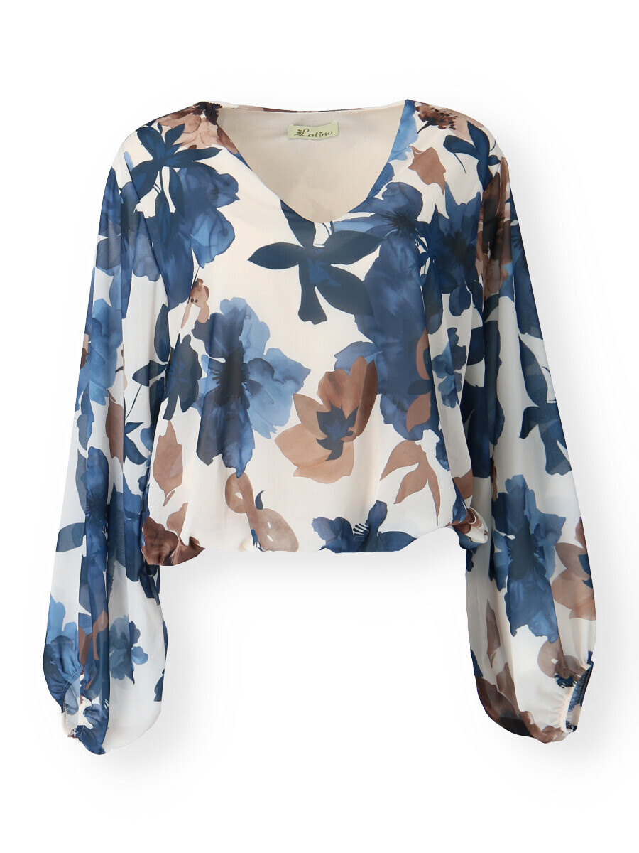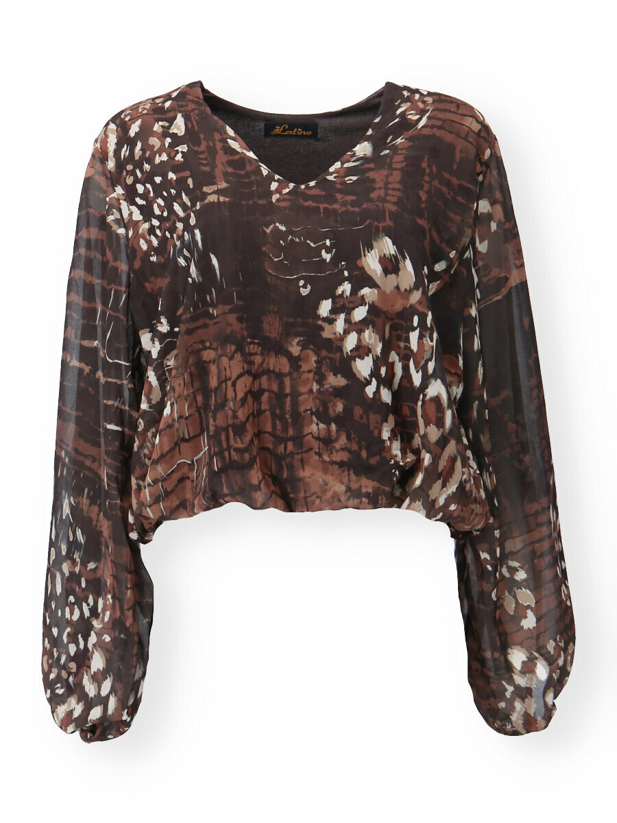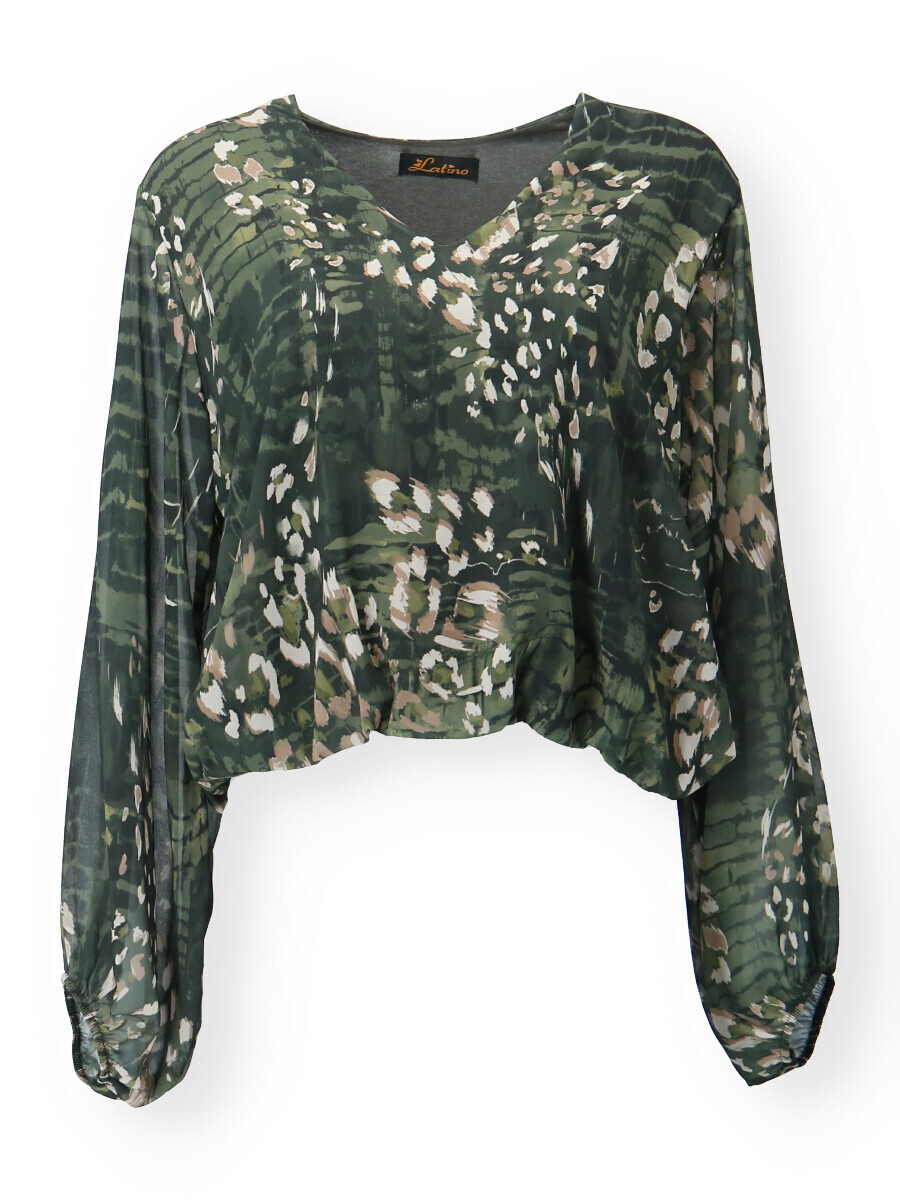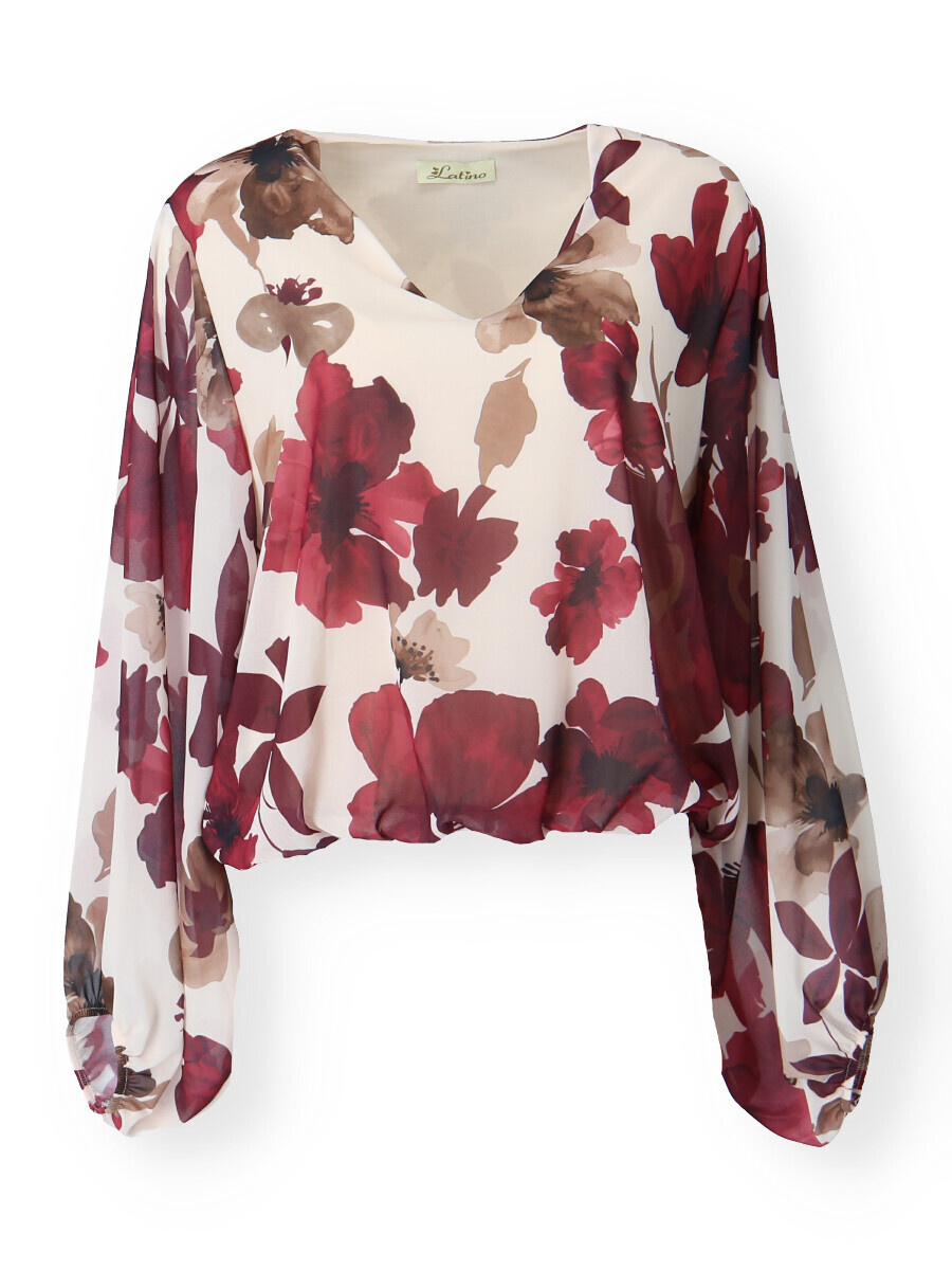 Dámská elegantní halenka s dlouhým šifónovým rukávem zakončeným gumičkou. Halenka je v pase do gumy, má véčkový výstřih a podšívku.