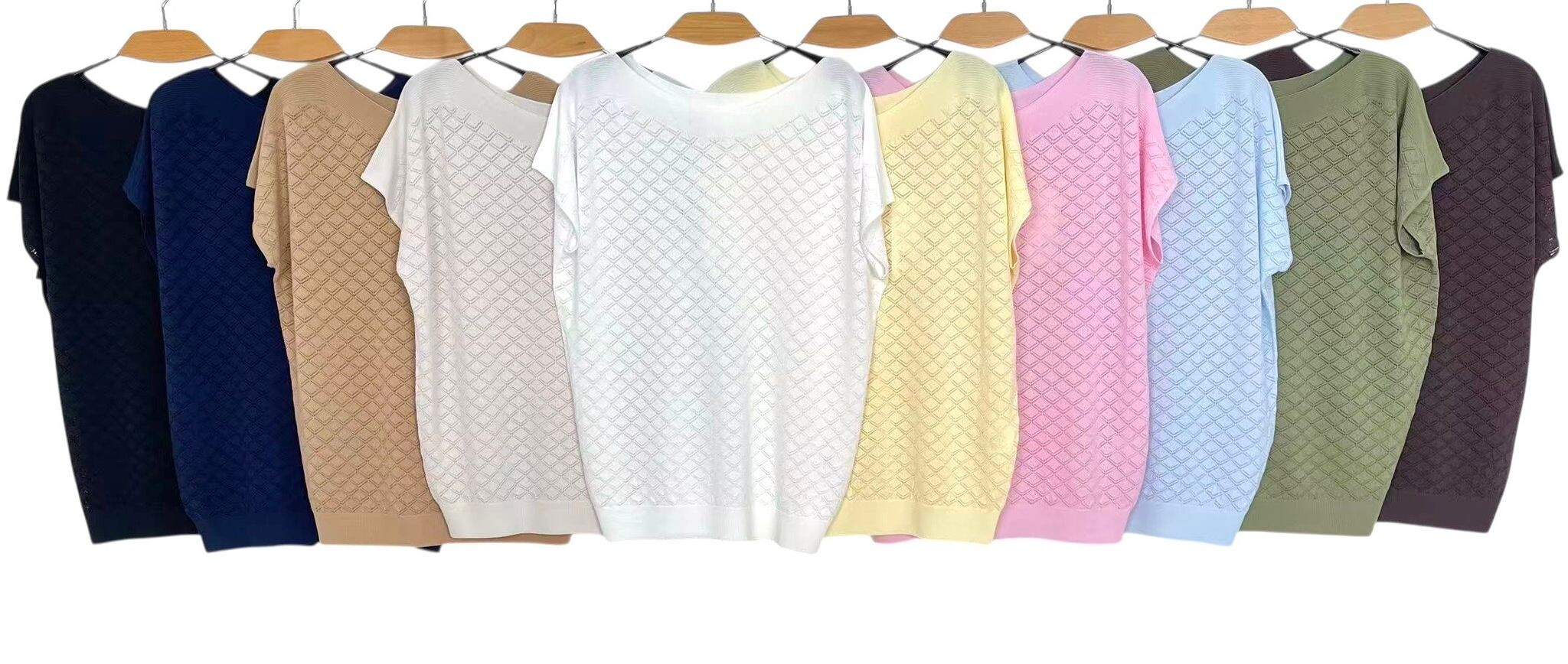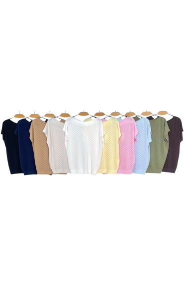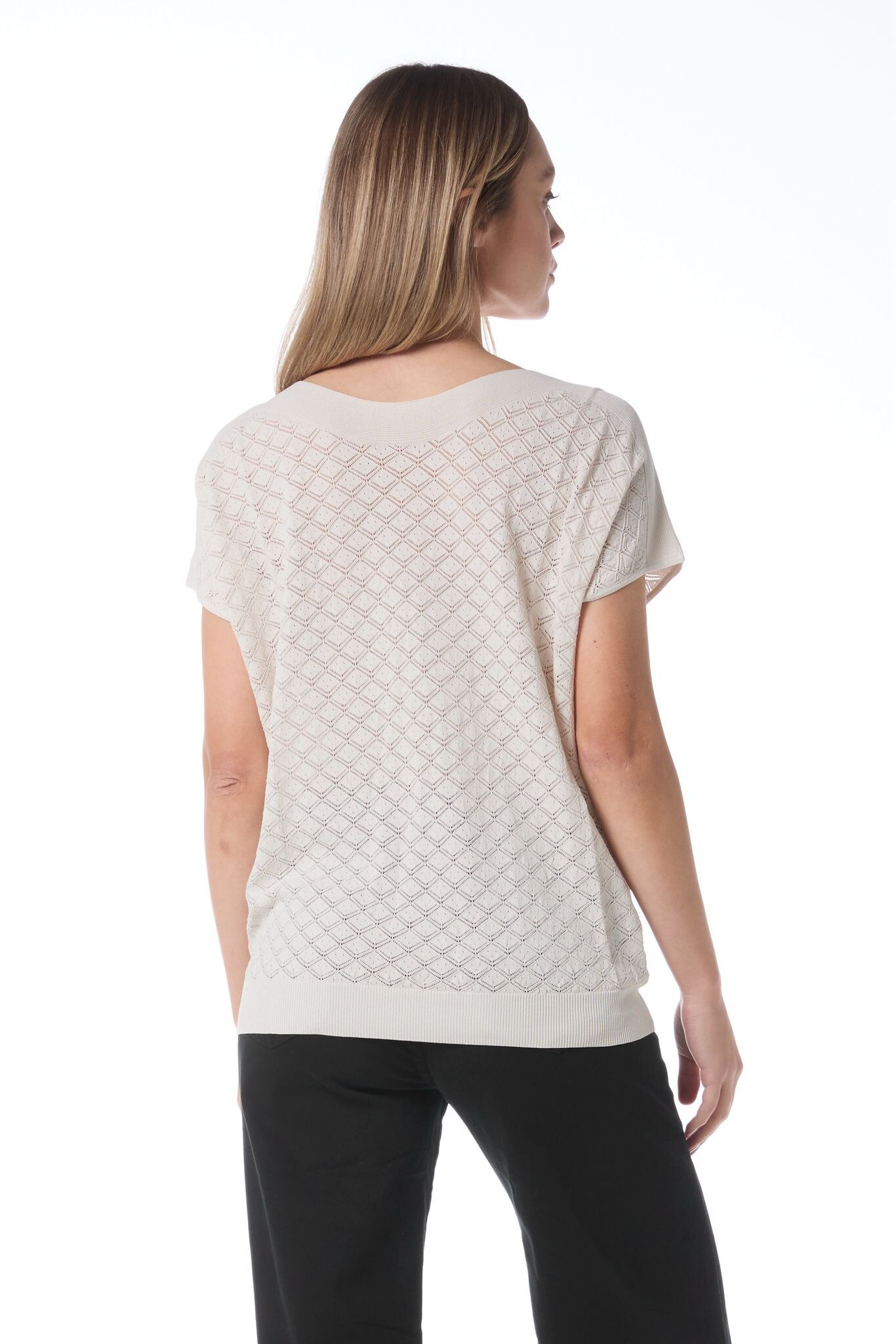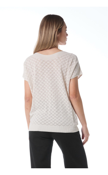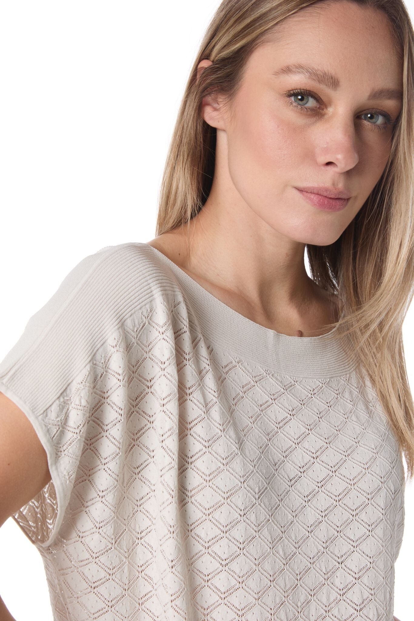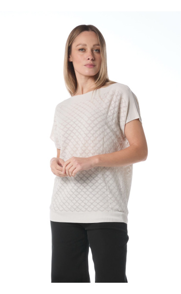 Elegantní halenka s krátkým rukávem volnějšího střihu. Halenka má lodičkový výstřih, krátký rukáv a je jemného dírkovaného úpletu.
