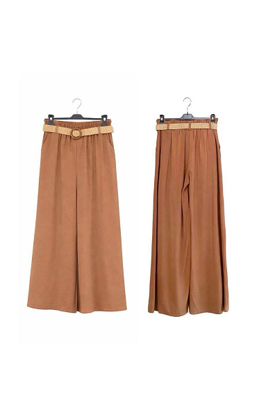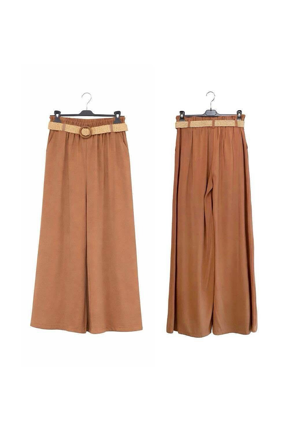 Dámské kalhoty s širokými nohavicemi WIDE-LEG střihu. Kalhoty jsou v pase do gumy, doplněny stylovým páskem, po stranách mají všité kapsy.