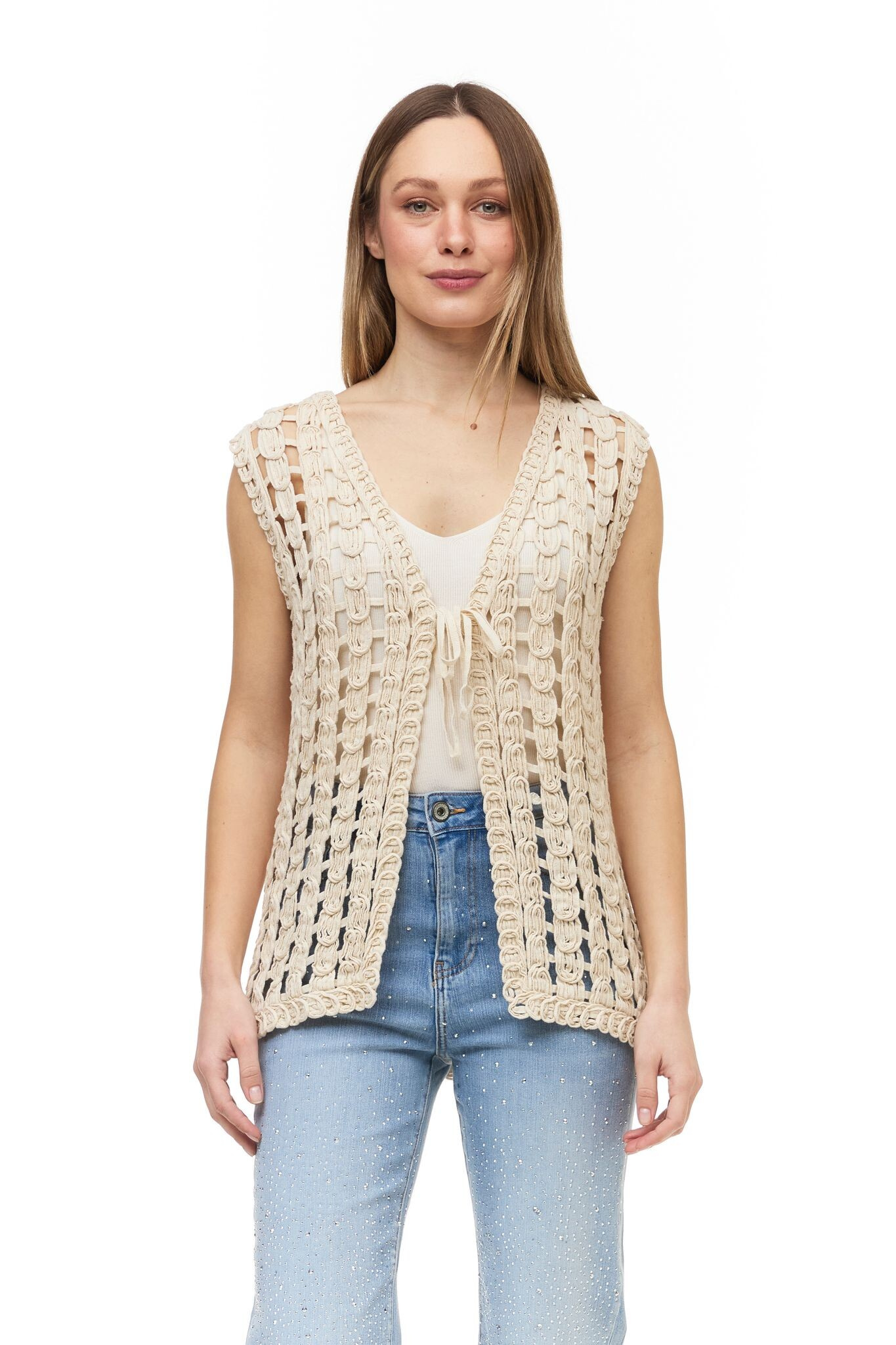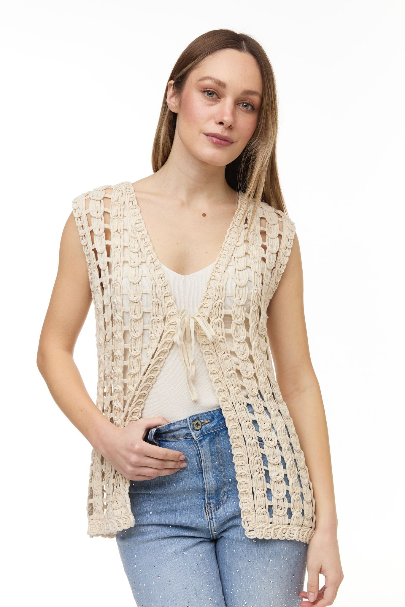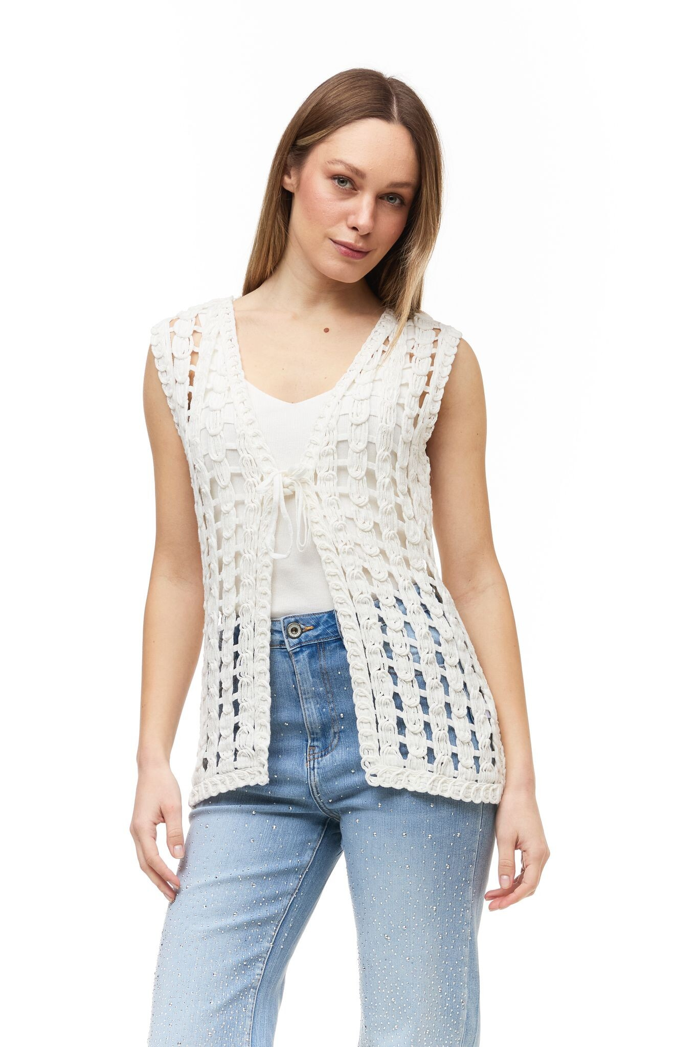 Dámská trendy háčkovaná vestička v BOHO stylu. Vesta má prodlouženou délku a je doplněna vázáním na šňůrku ve vrchní části. Vyrobeno v Itálii