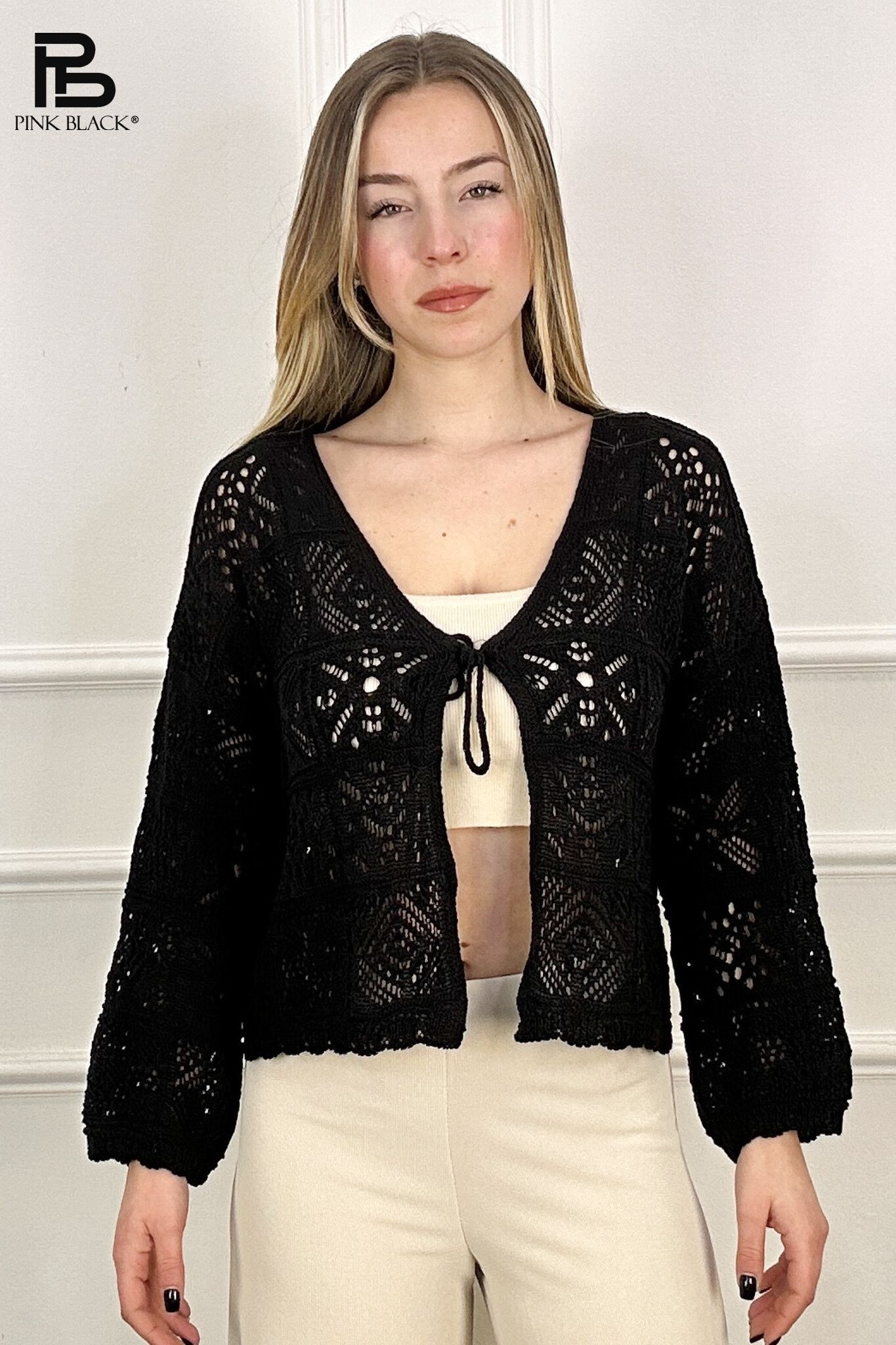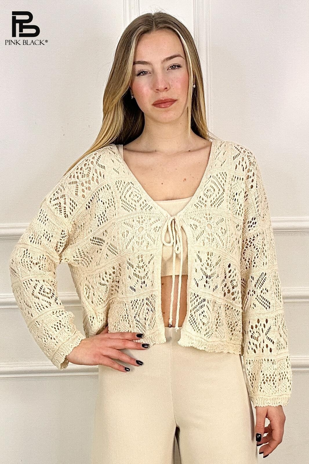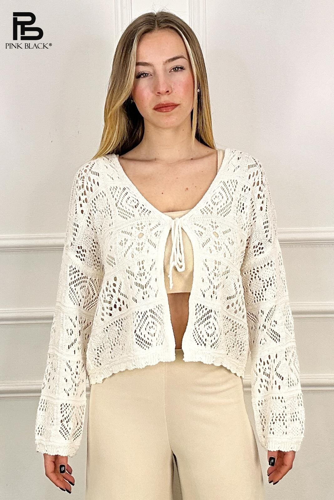 Dámský elegantní háčkovaný kardigan s vázáním. Trendy kousek letošní jarní sezóny.