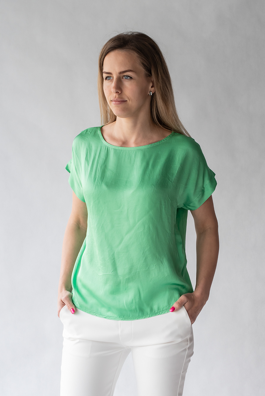 Saténová halenka s krátkým rukávem, pro každodenní pohodlné nošení.