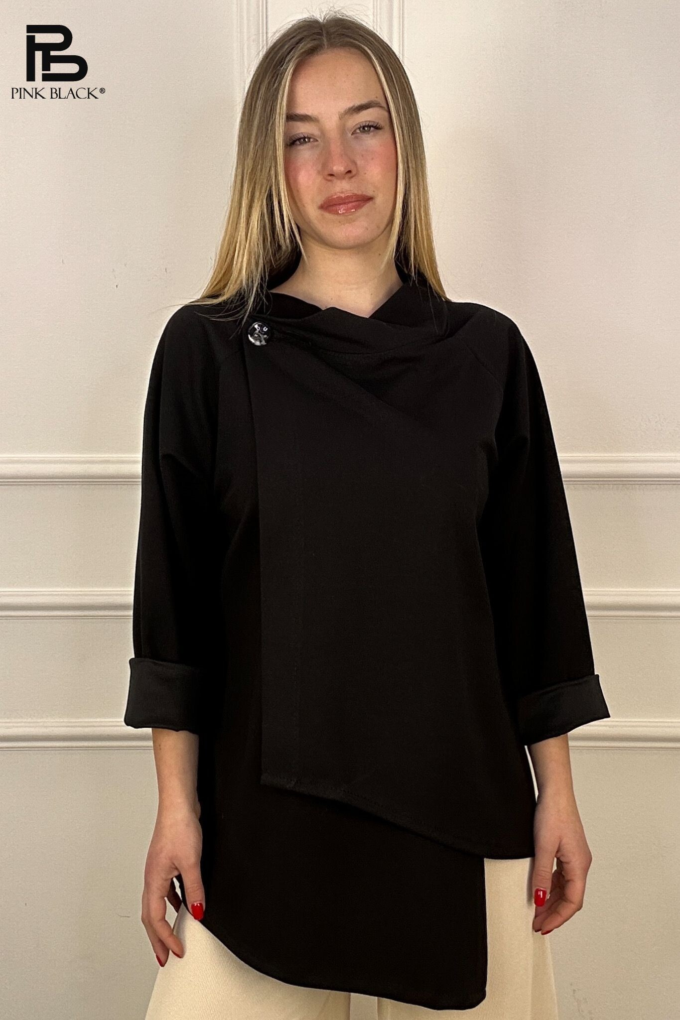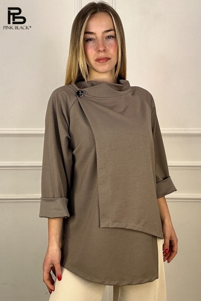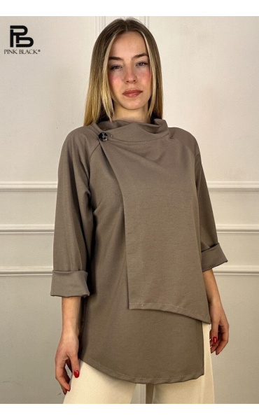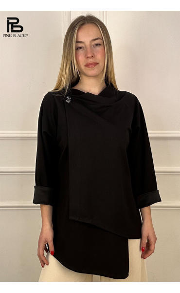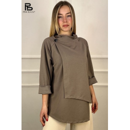 Halenka asymetrická se stojáčkem. Halenka je překládaná se zapínáním na knoflík.