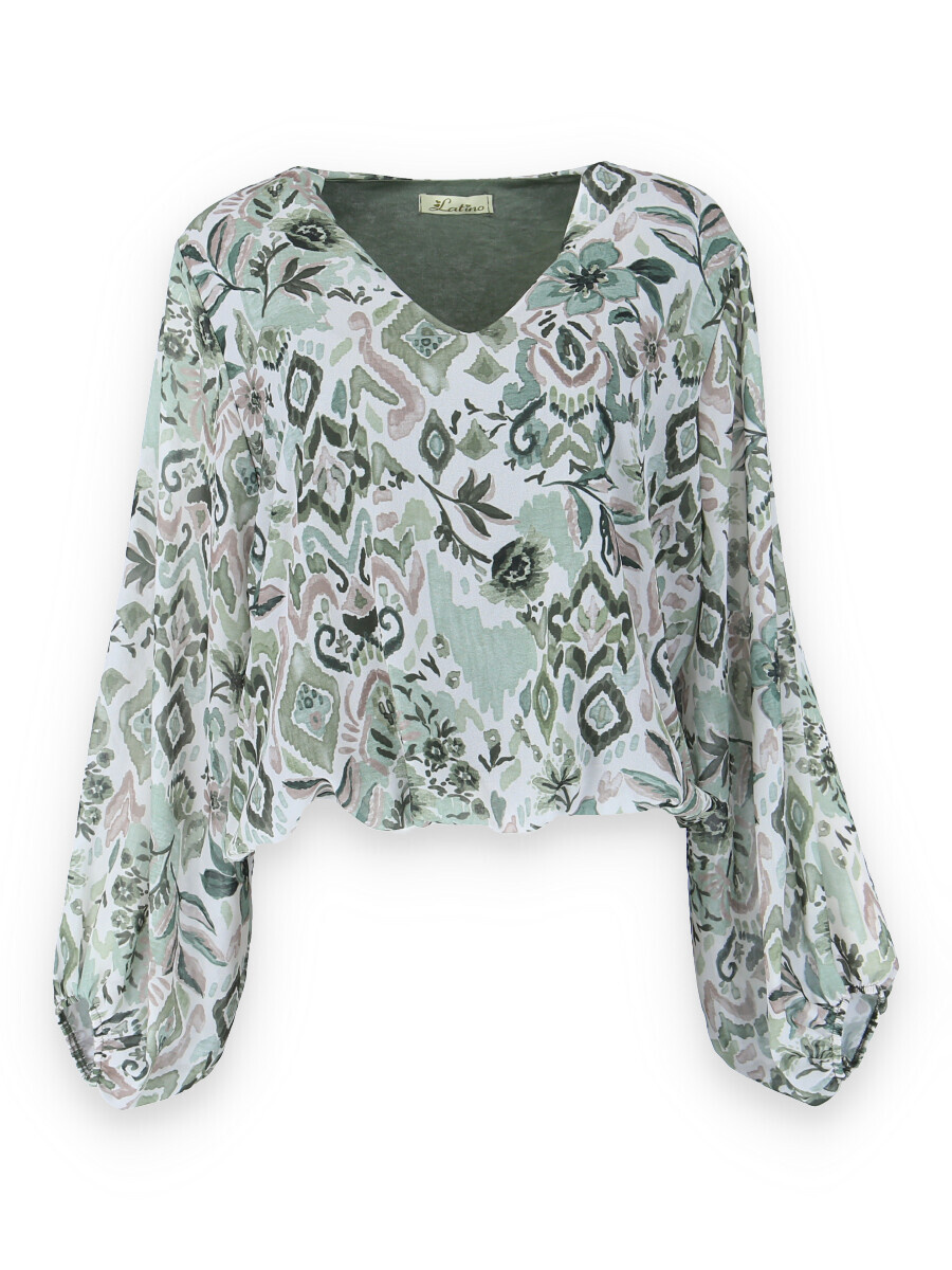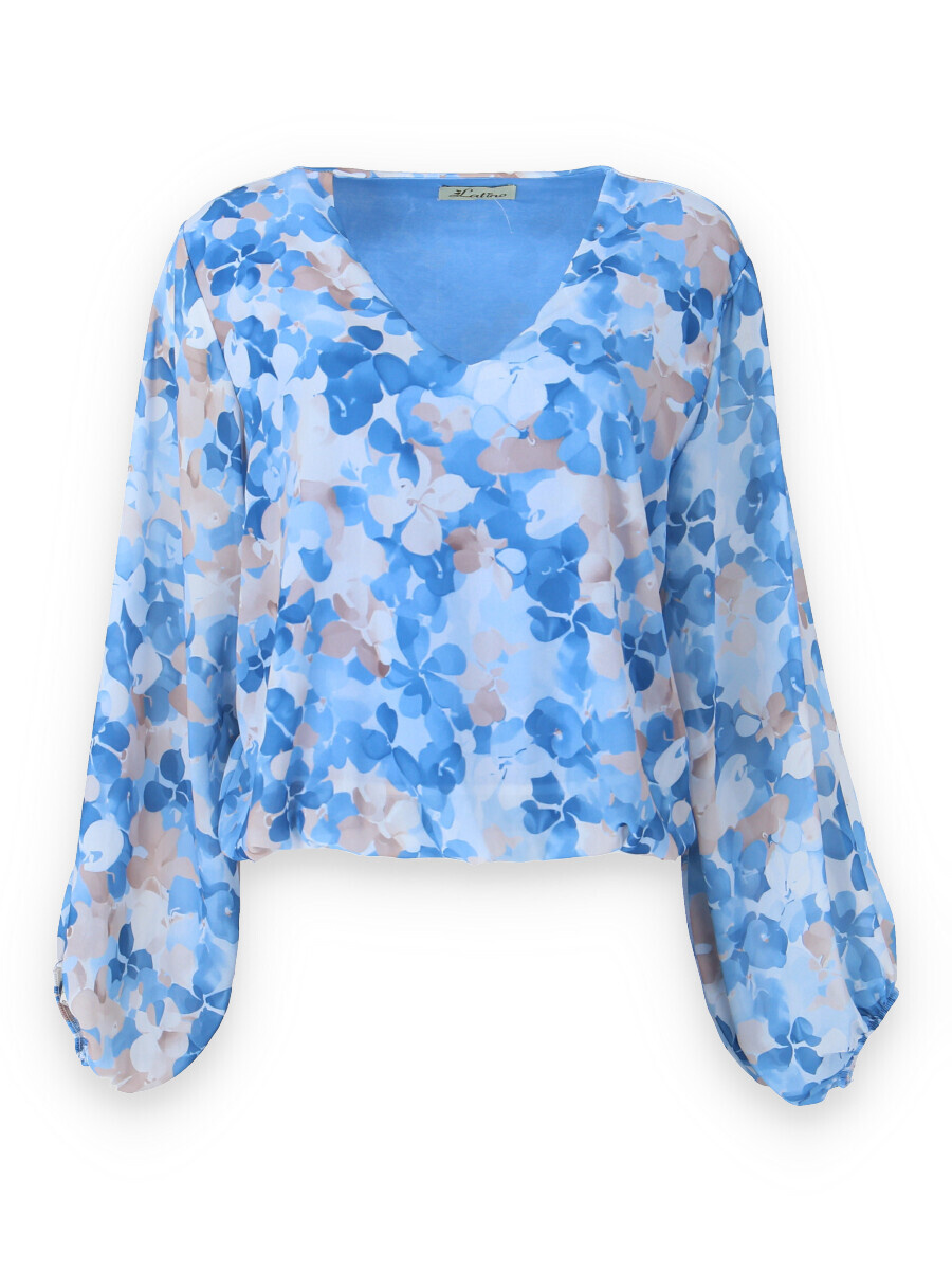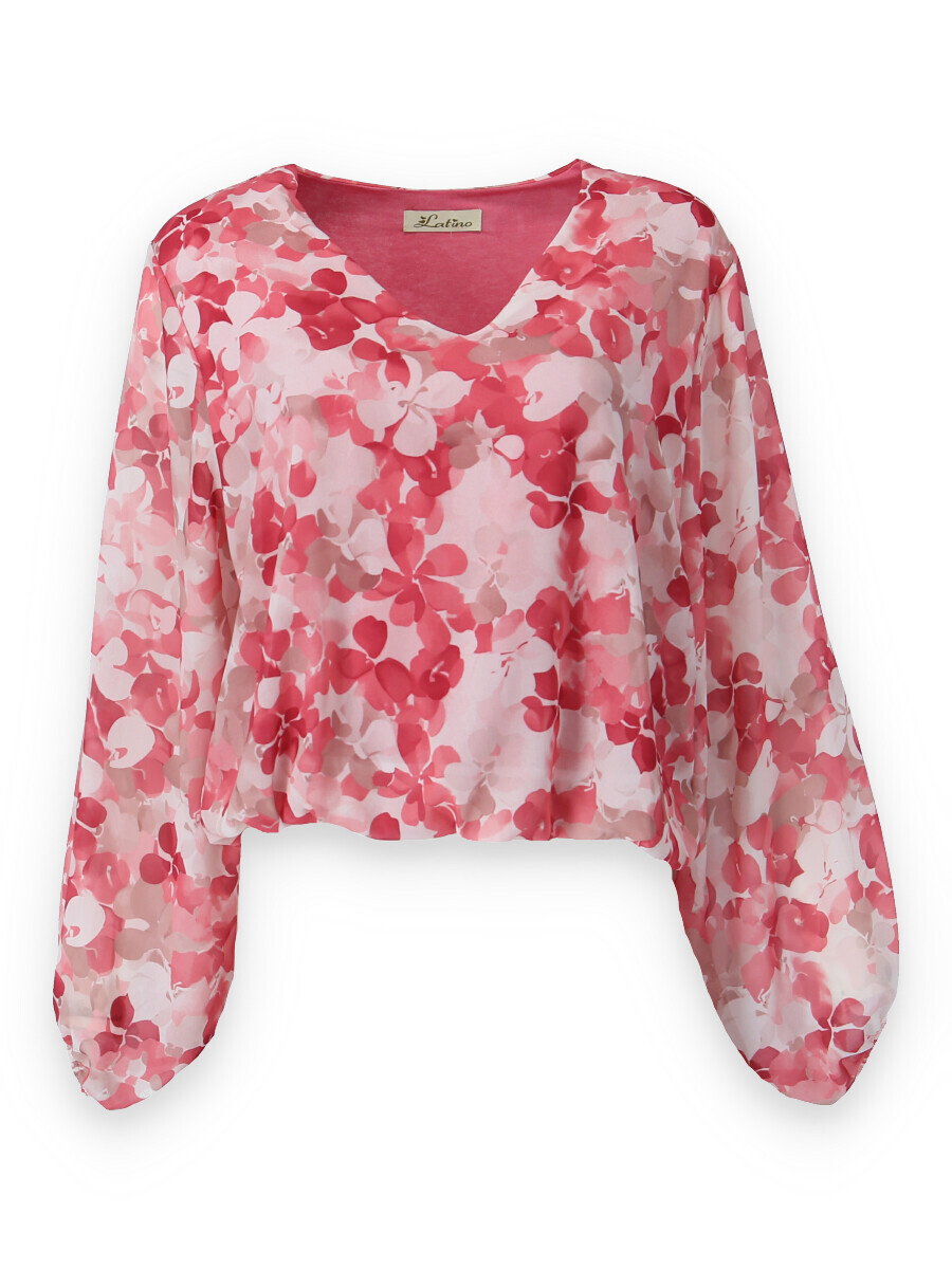 Dámská elegantní halenka s dlouhým šifónovým rukávem zakončeným gumičkou. Halenka je v pase do gumy, má véčkový výstřih a podšívku.