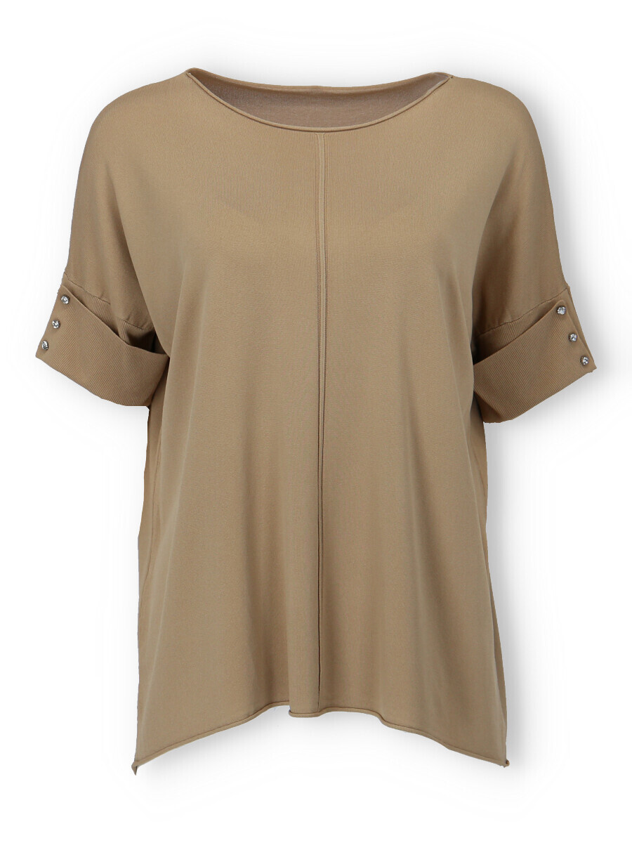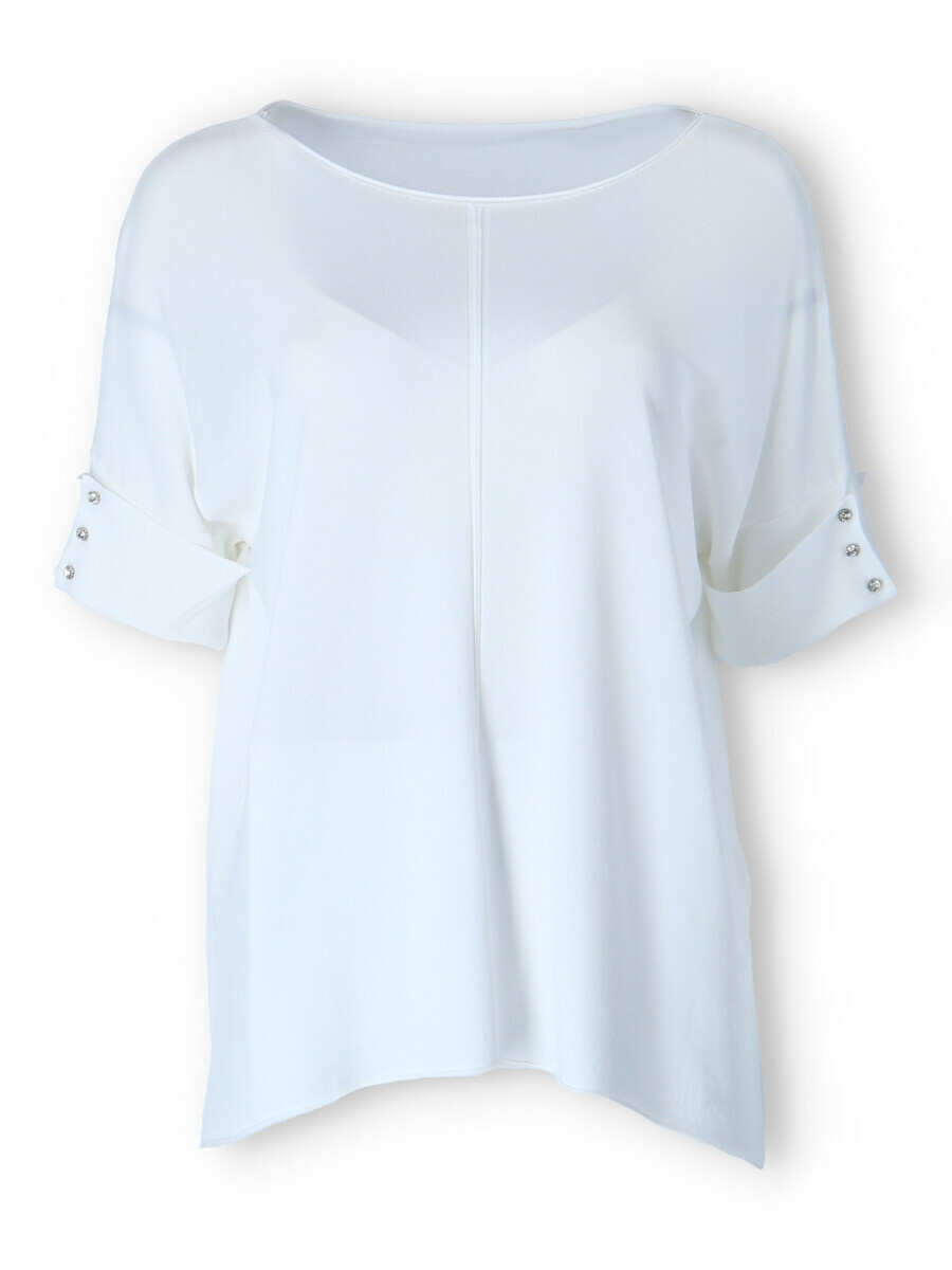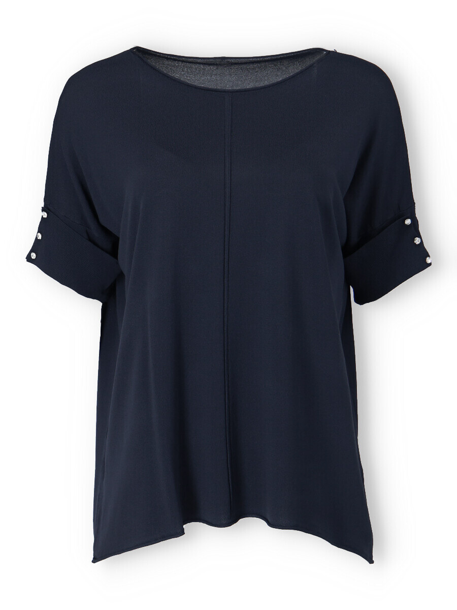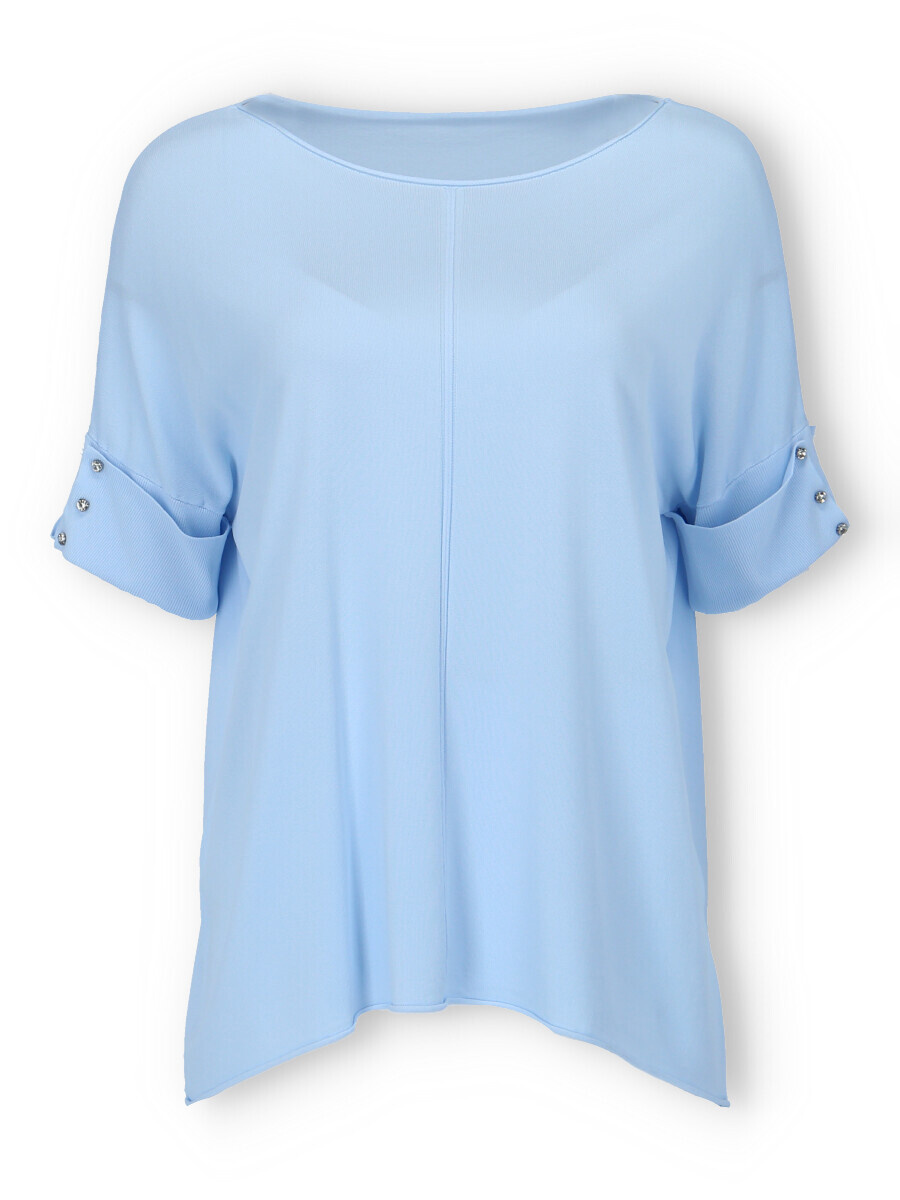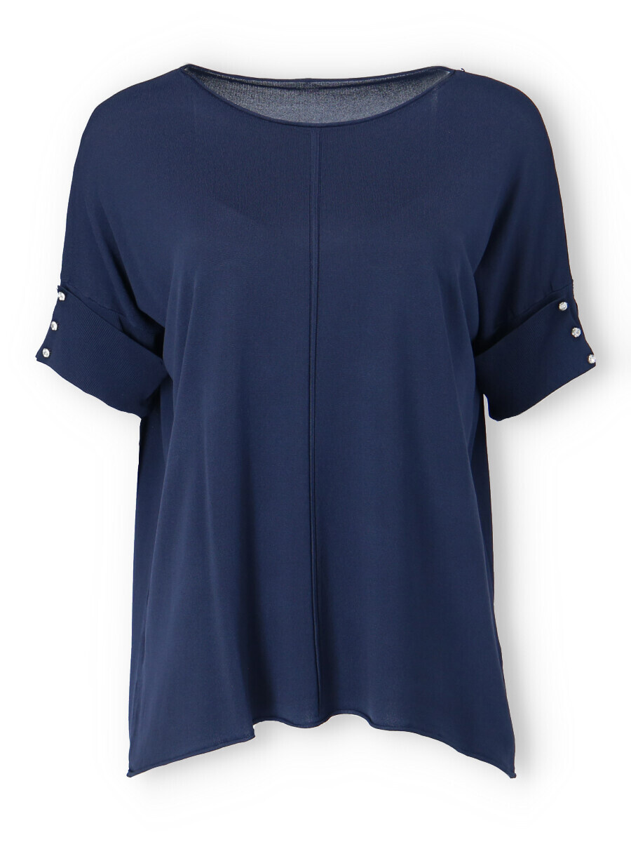 Dámská úpletová halenka s krátkým rukávem. Halenka má na rukávu aplikaci ozdobných knoflíků a má prodlouženou zadní délku.