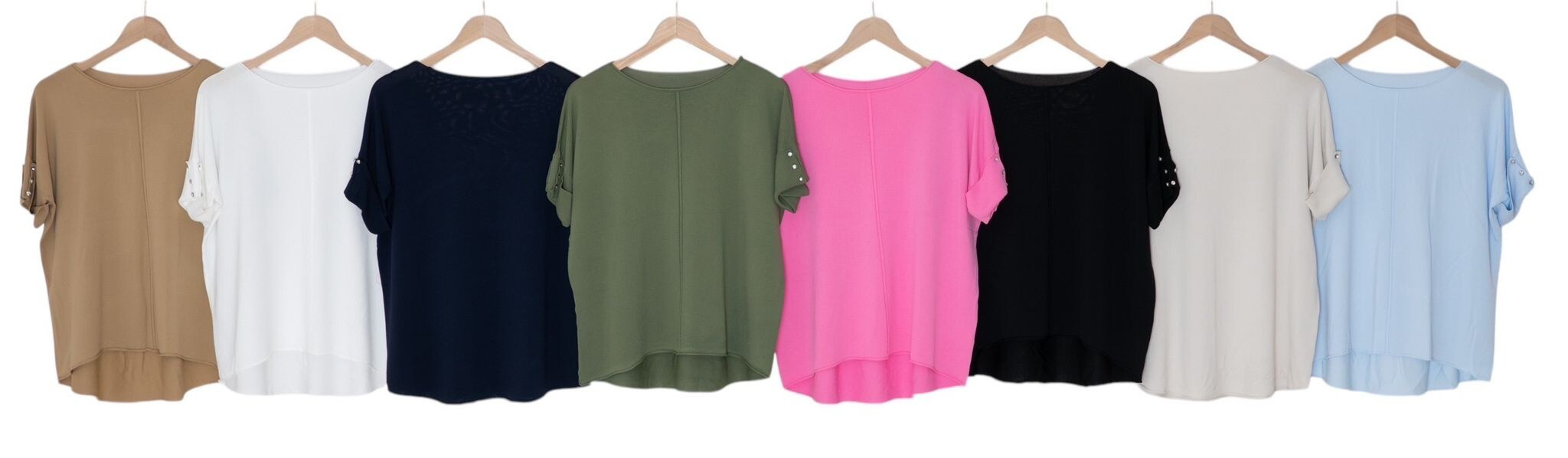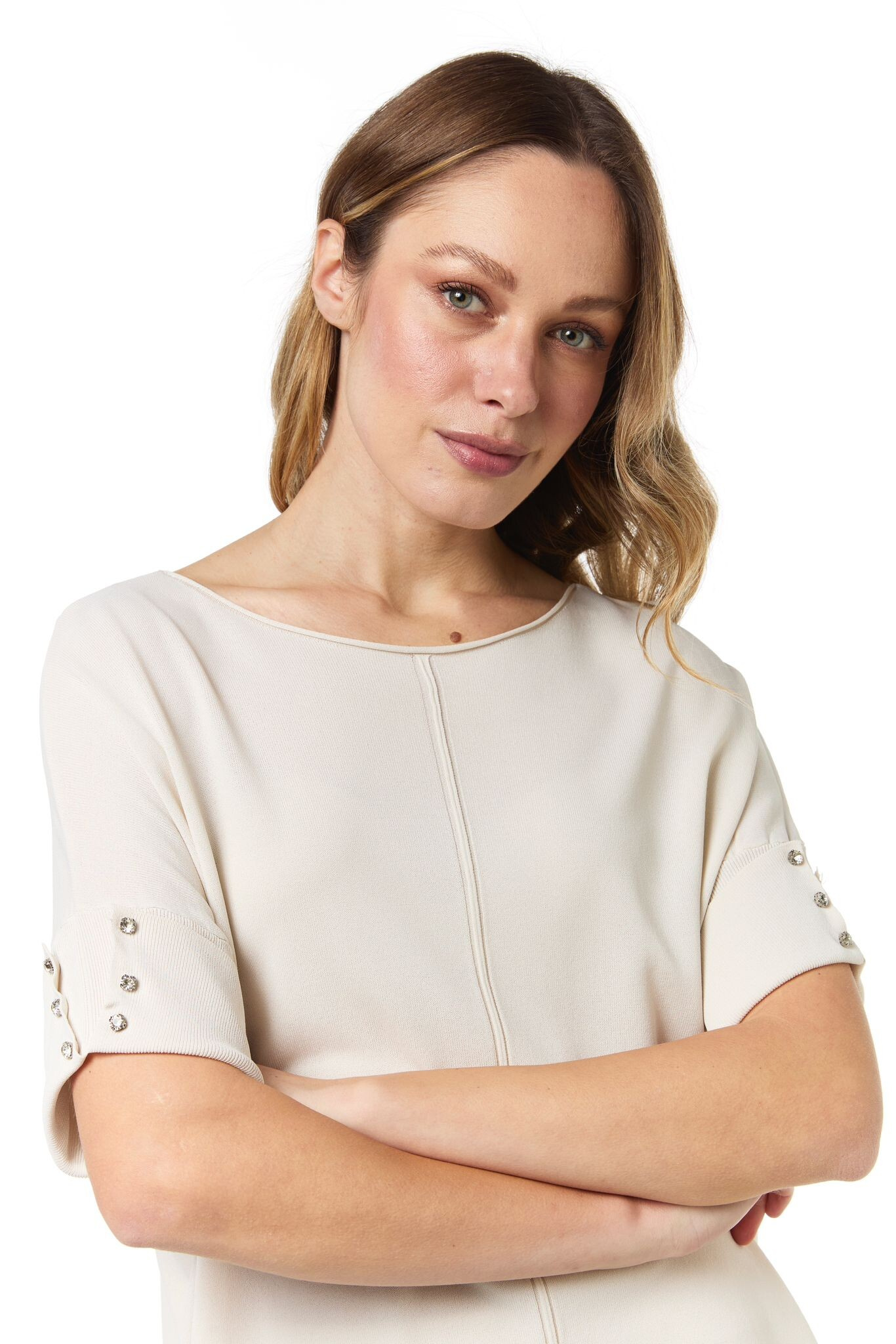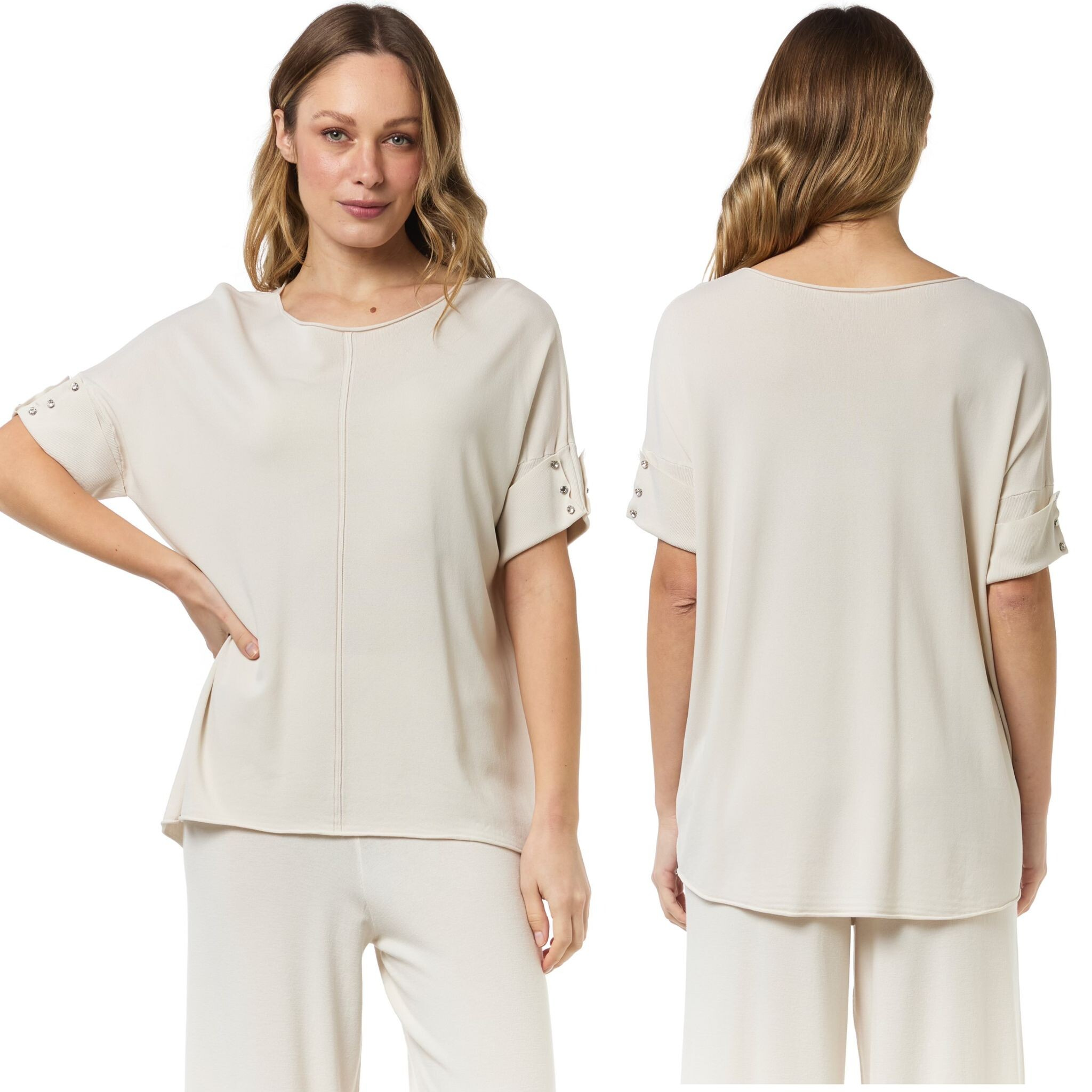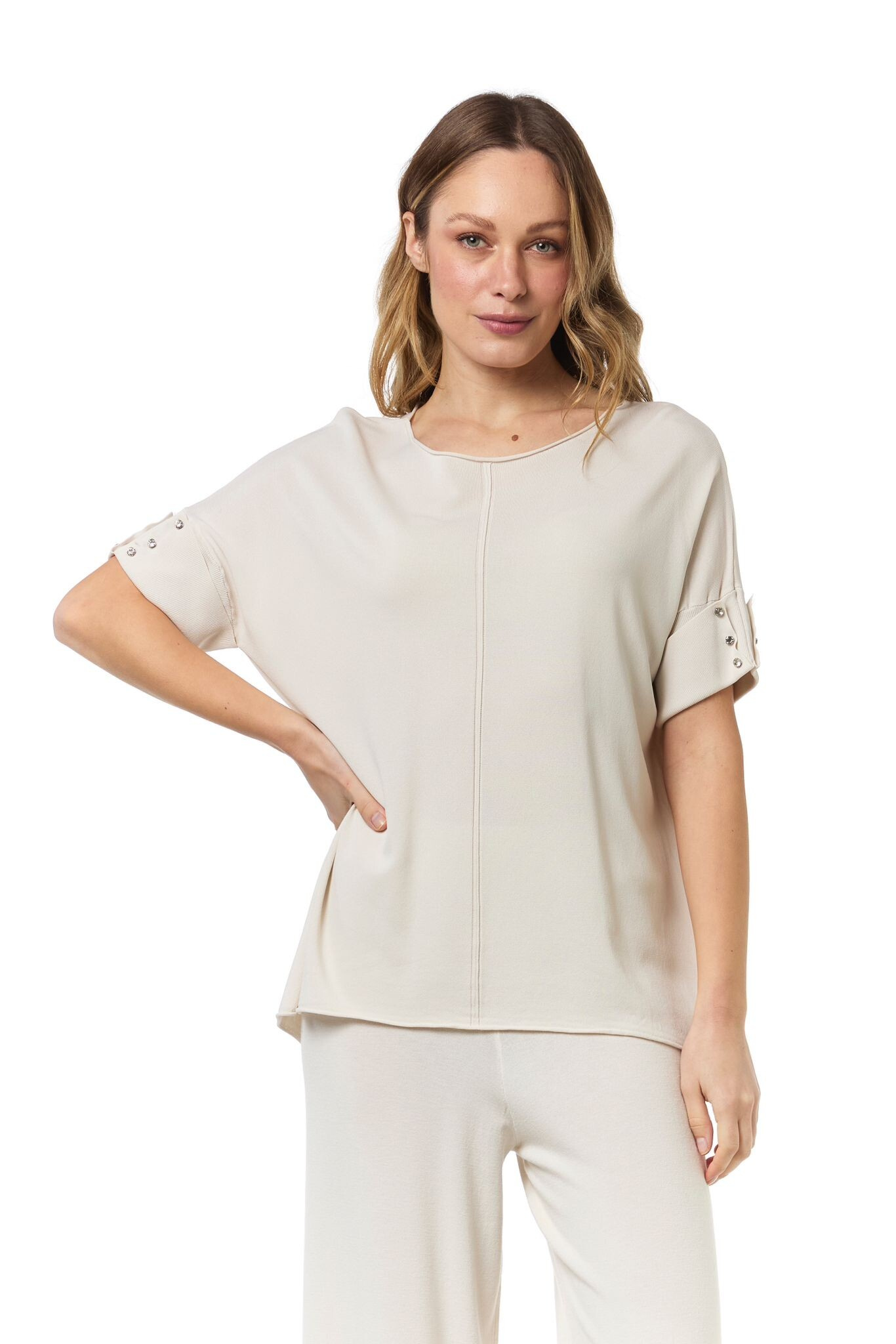 Dámská úpletová halenka s krátkým rukávem. Halenka má na rukávu aplikaci ozdobných knoflíků a má prodlouženou zadní délku.