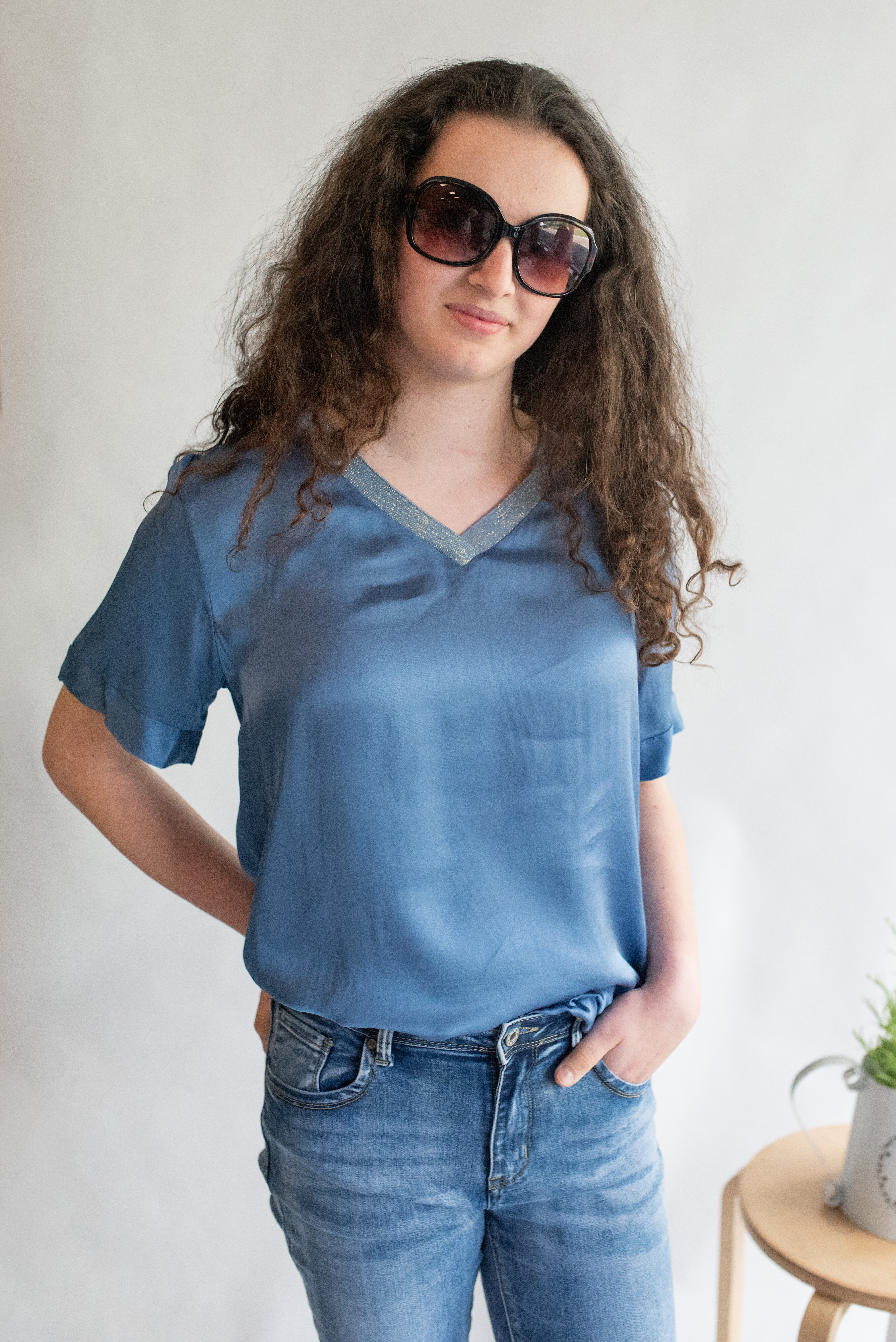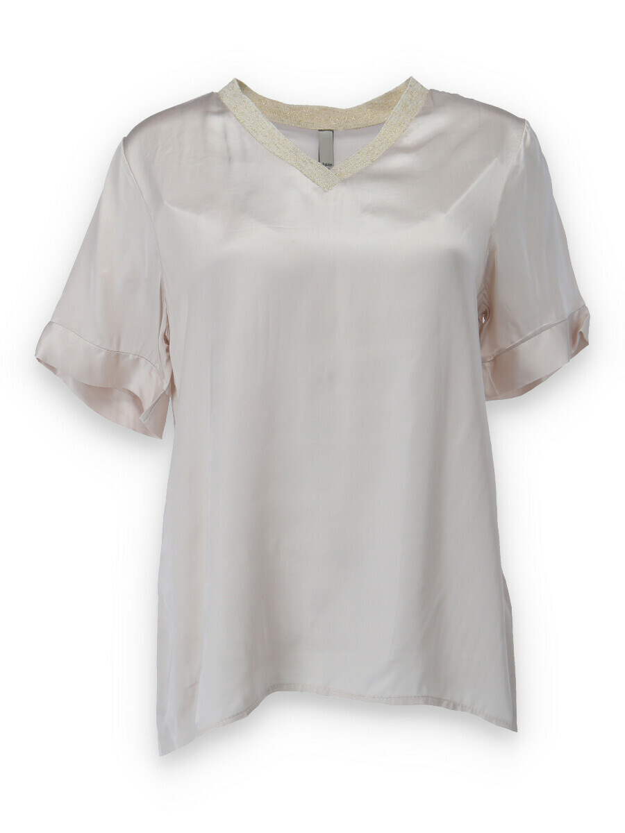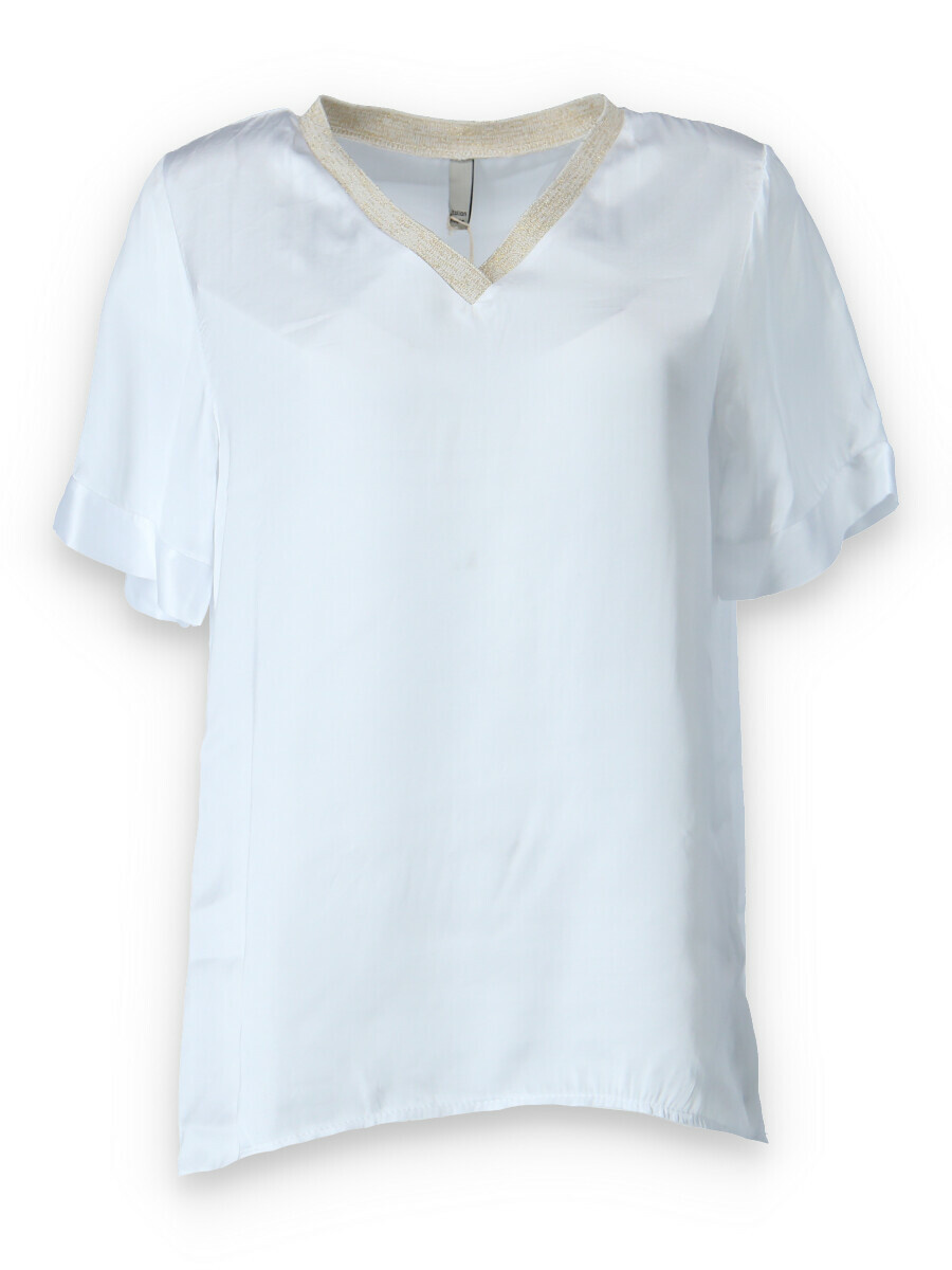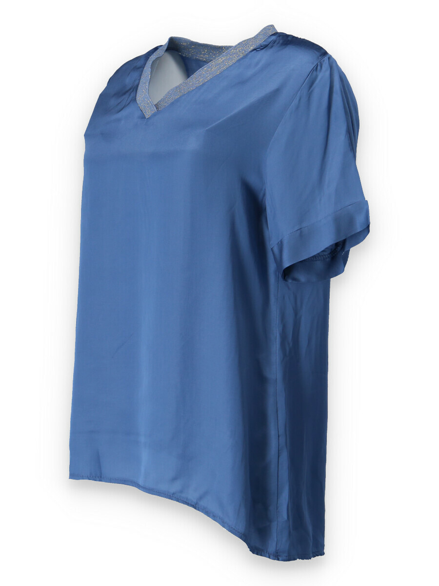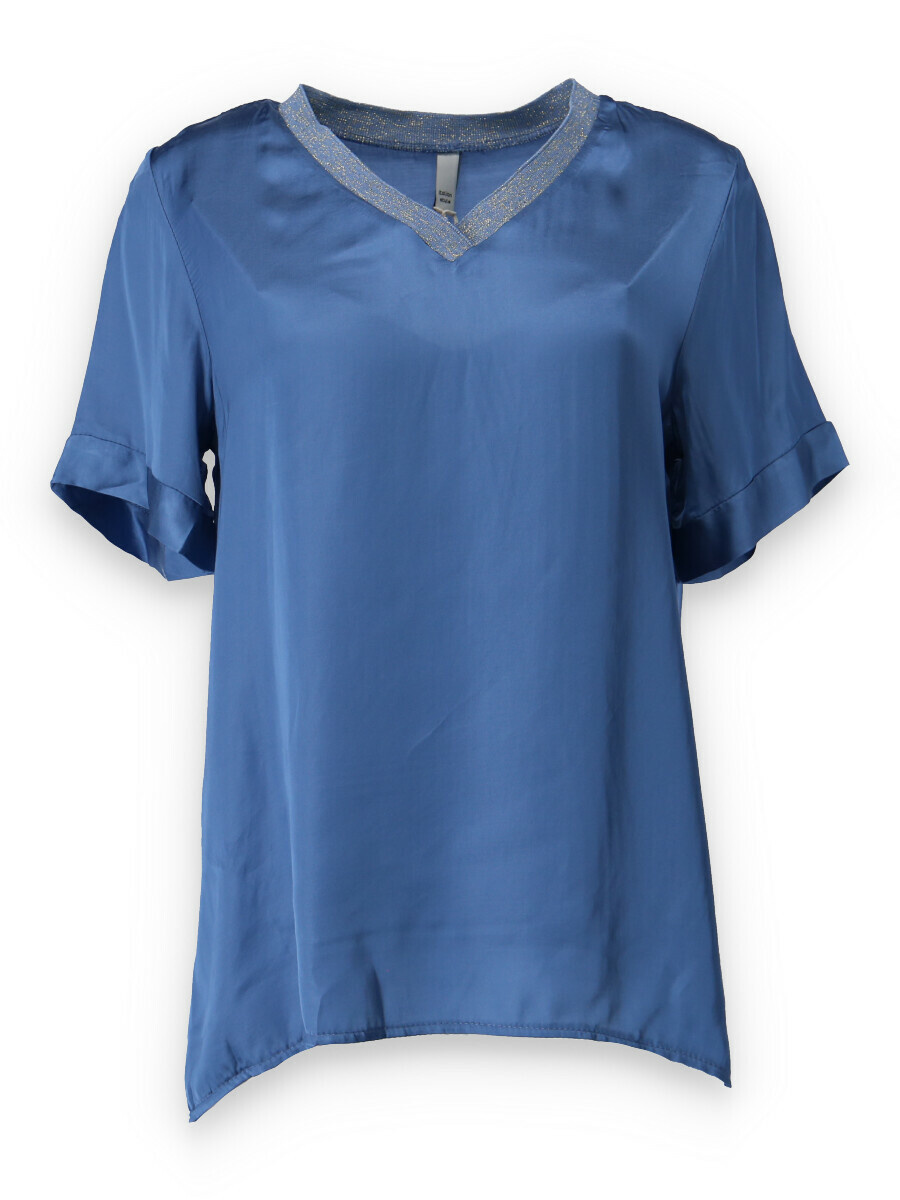 Halenk s kr. rukávem. Halenka má hedvábný lesk a lemovaný výstřih do V, prodloužená zadní délka.