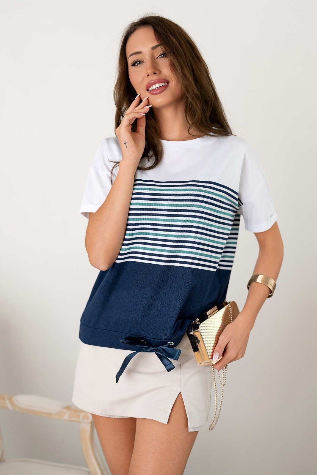 Elegantní a pohodlná halenka s krátkým rukávem z příjemné tkaniny s vázačkou v pase. Módní vzhled a pohodlí v blůze nejvyšší kvality.