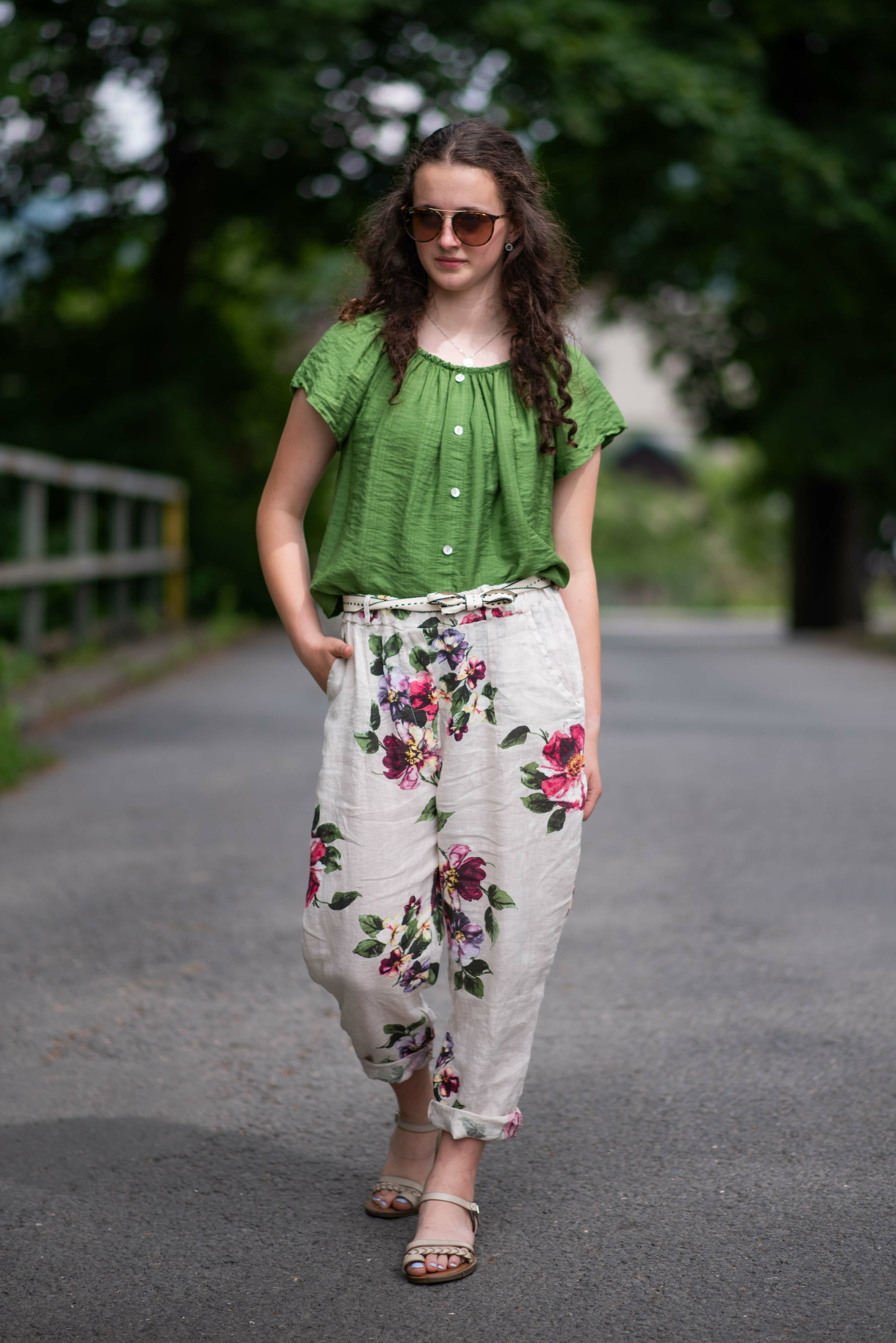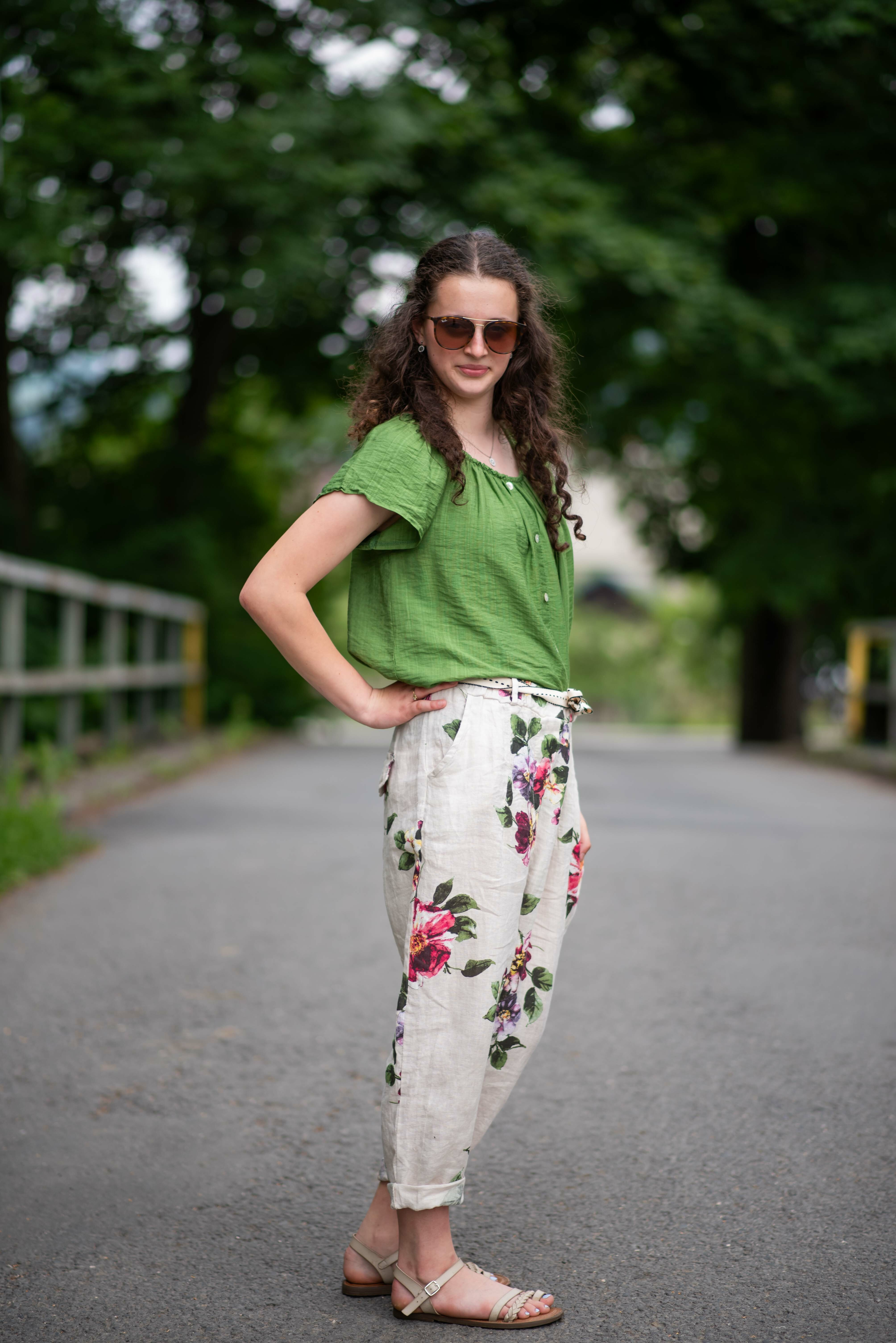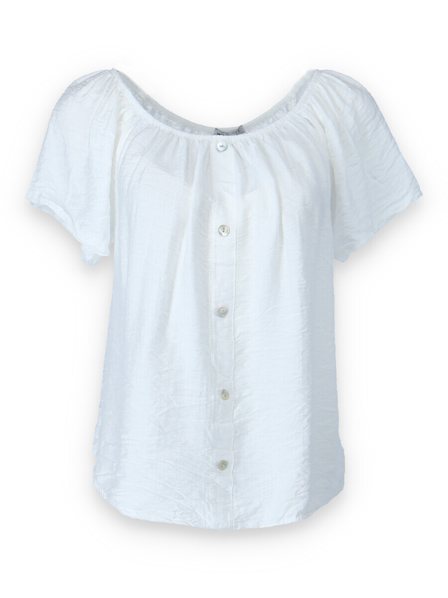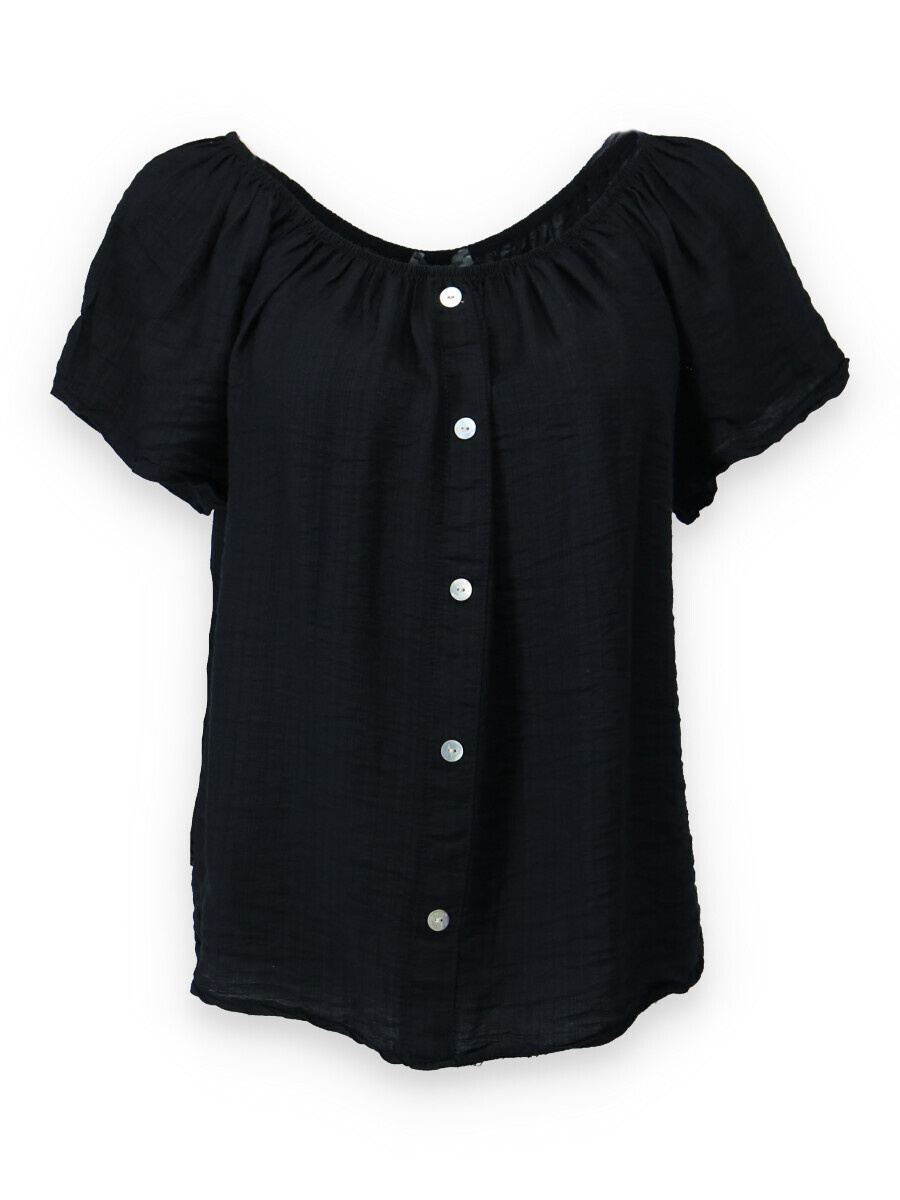 Dámská letní halenka s aplikací knoflíku na přední části. Halenka je lemovaná gumičkou, jde tedy stáhnout i přes ramena, vyrobeno v Itálii