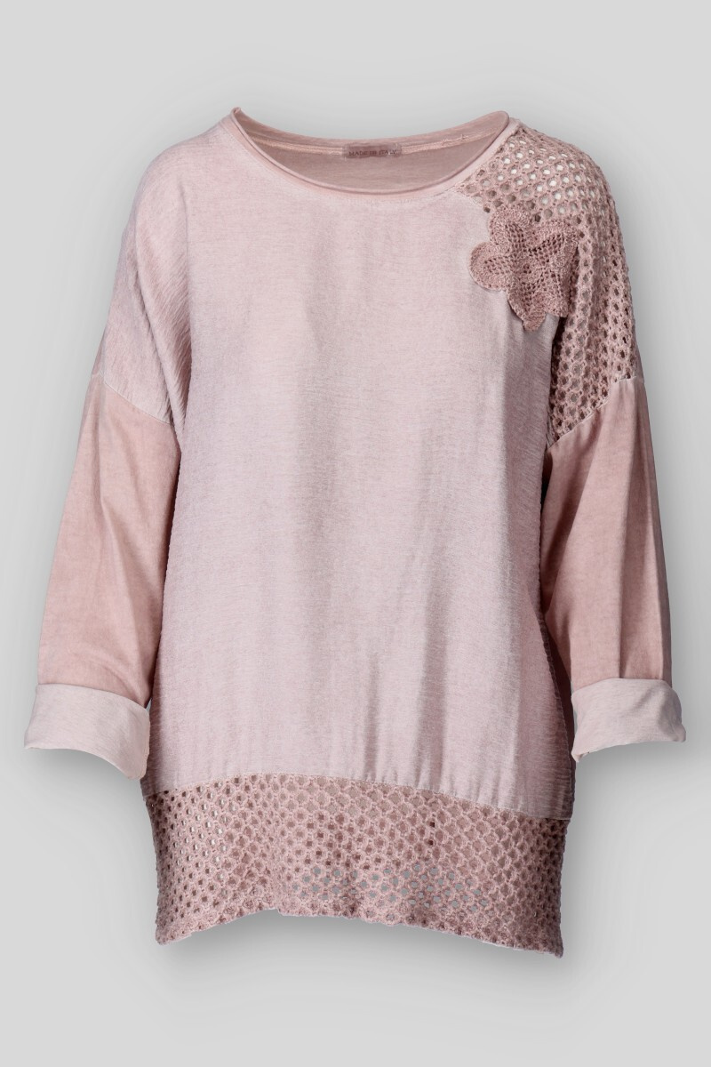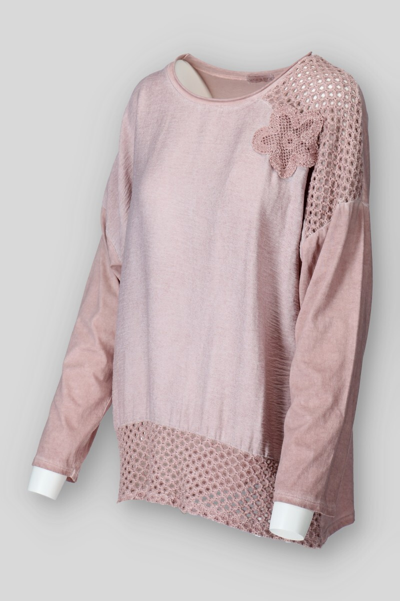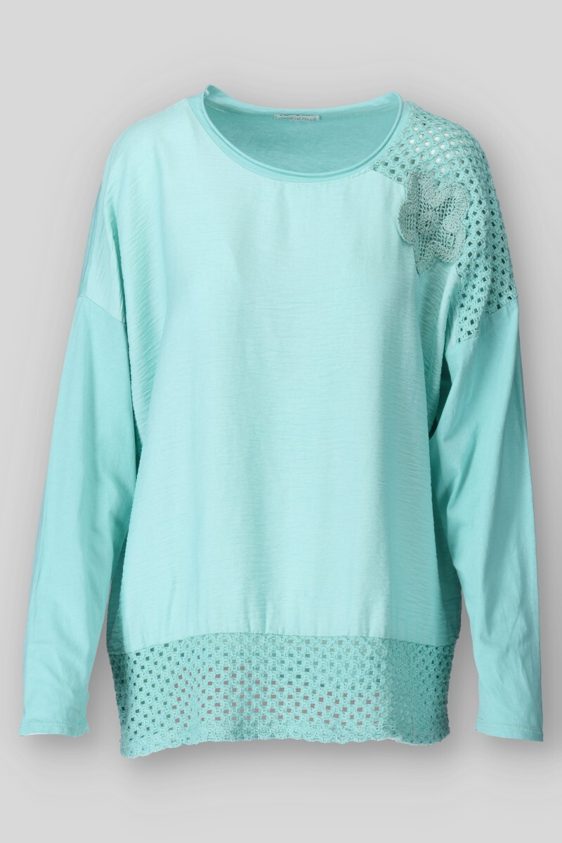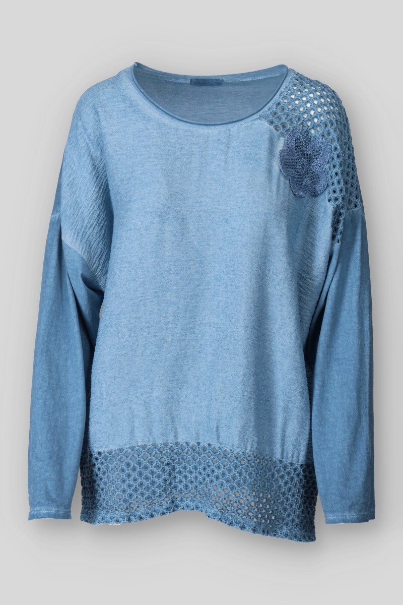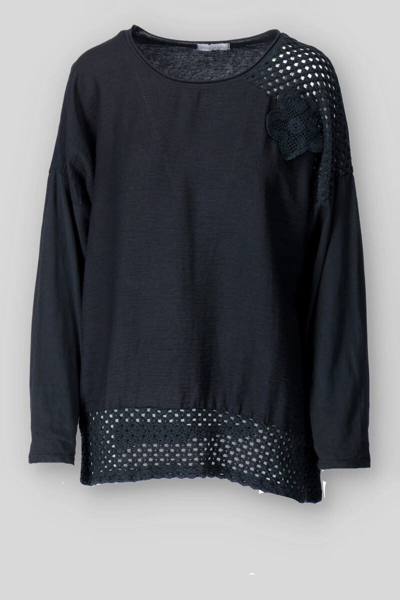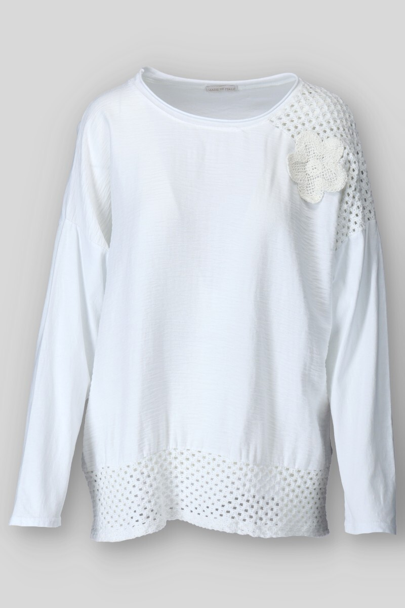 Dámská halenka s aplikací květu. Halenka má kulatý výstřih, dlouhý rukáv a ve spodní části háčkovaný lem a aplikace květu.