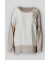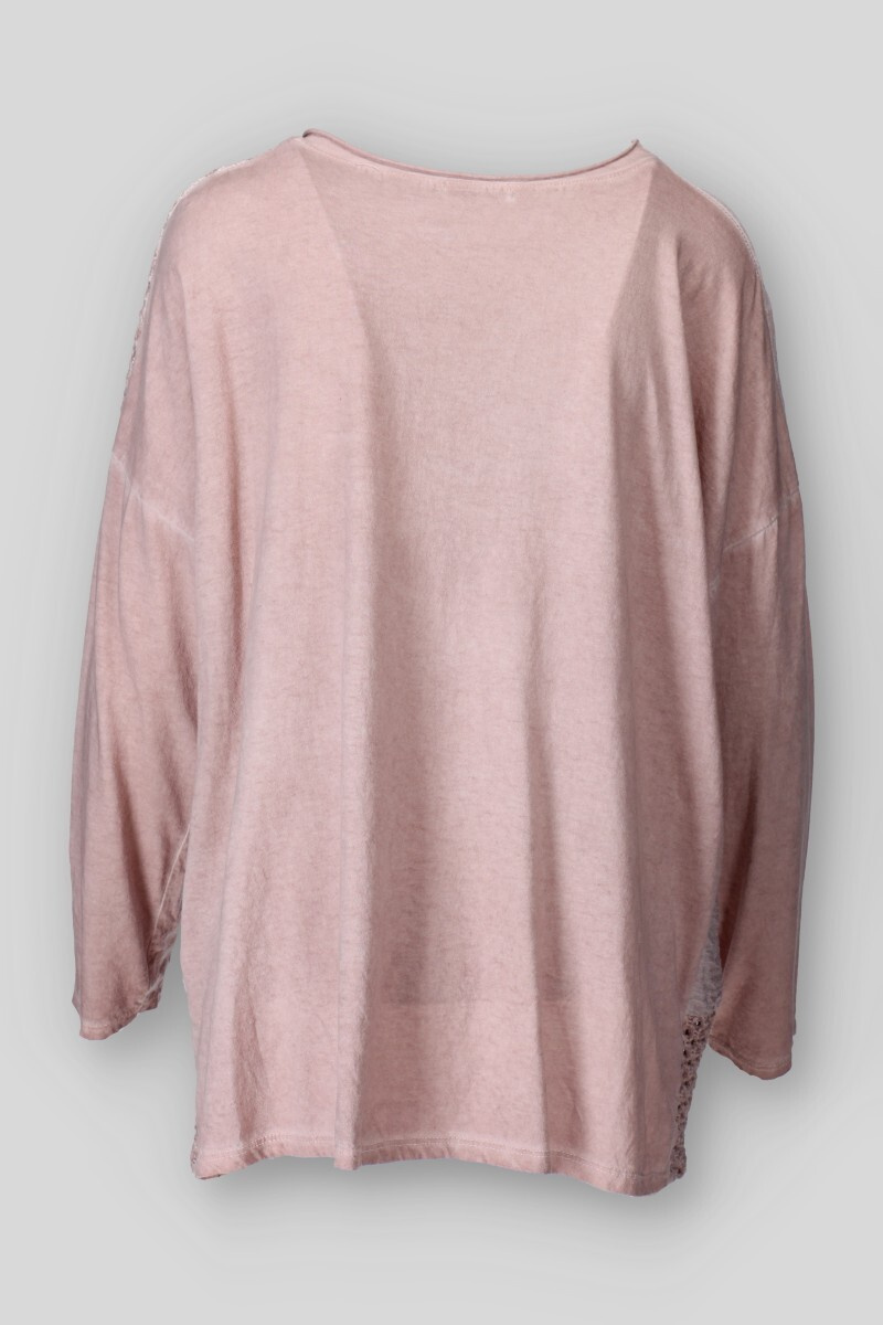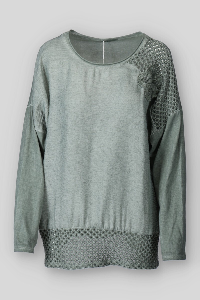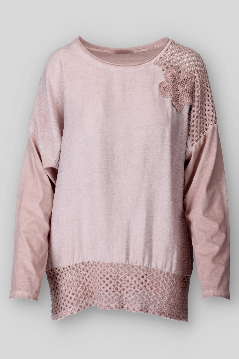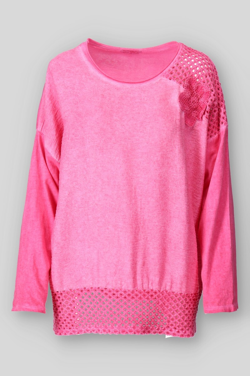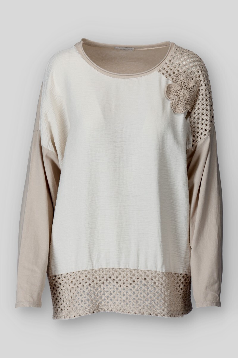Dámská halenka s aplikací květu. Halenka má kulatý výstřih, dlouhý rukáv a ve spodní části háčkovaný lem a aplikace květu.