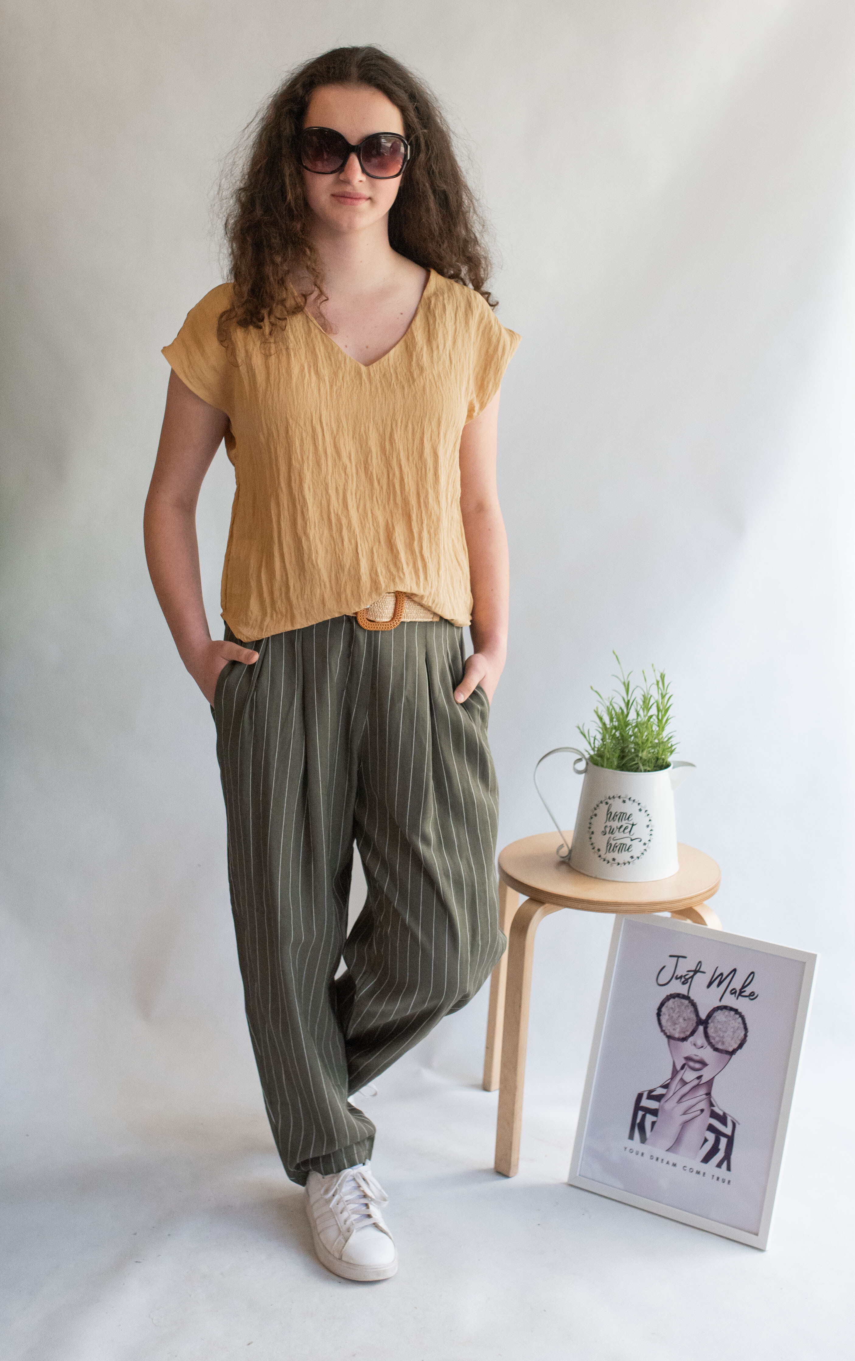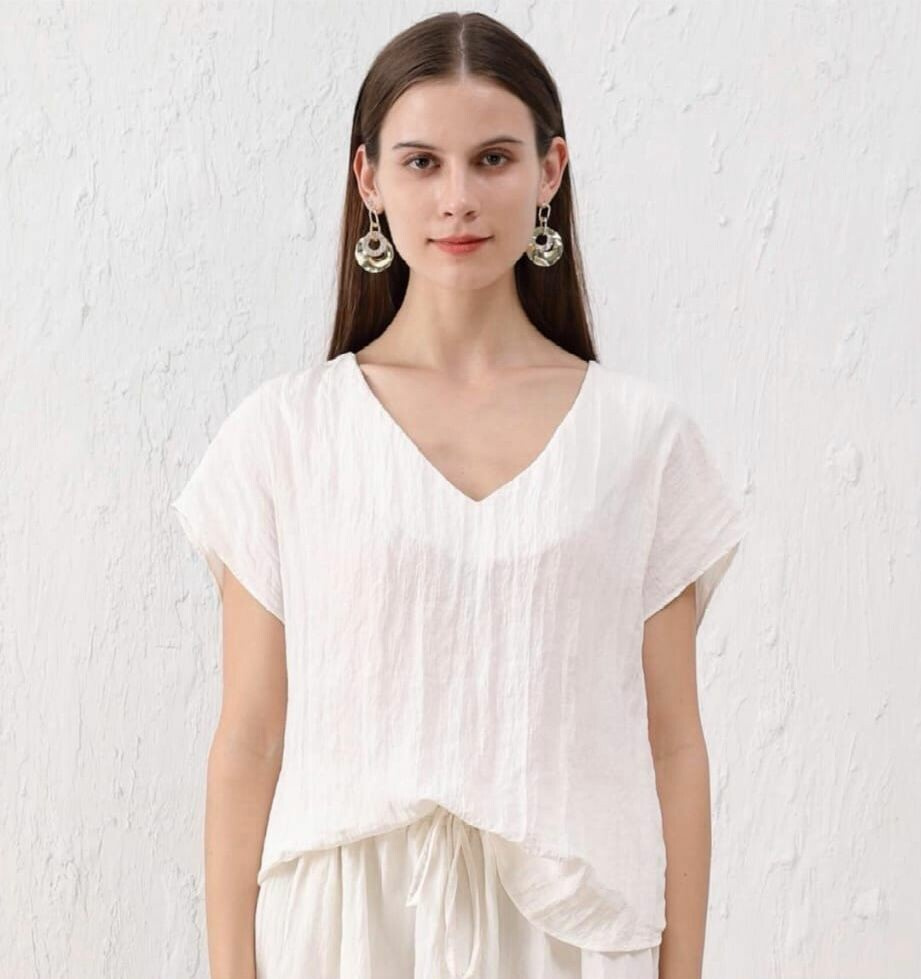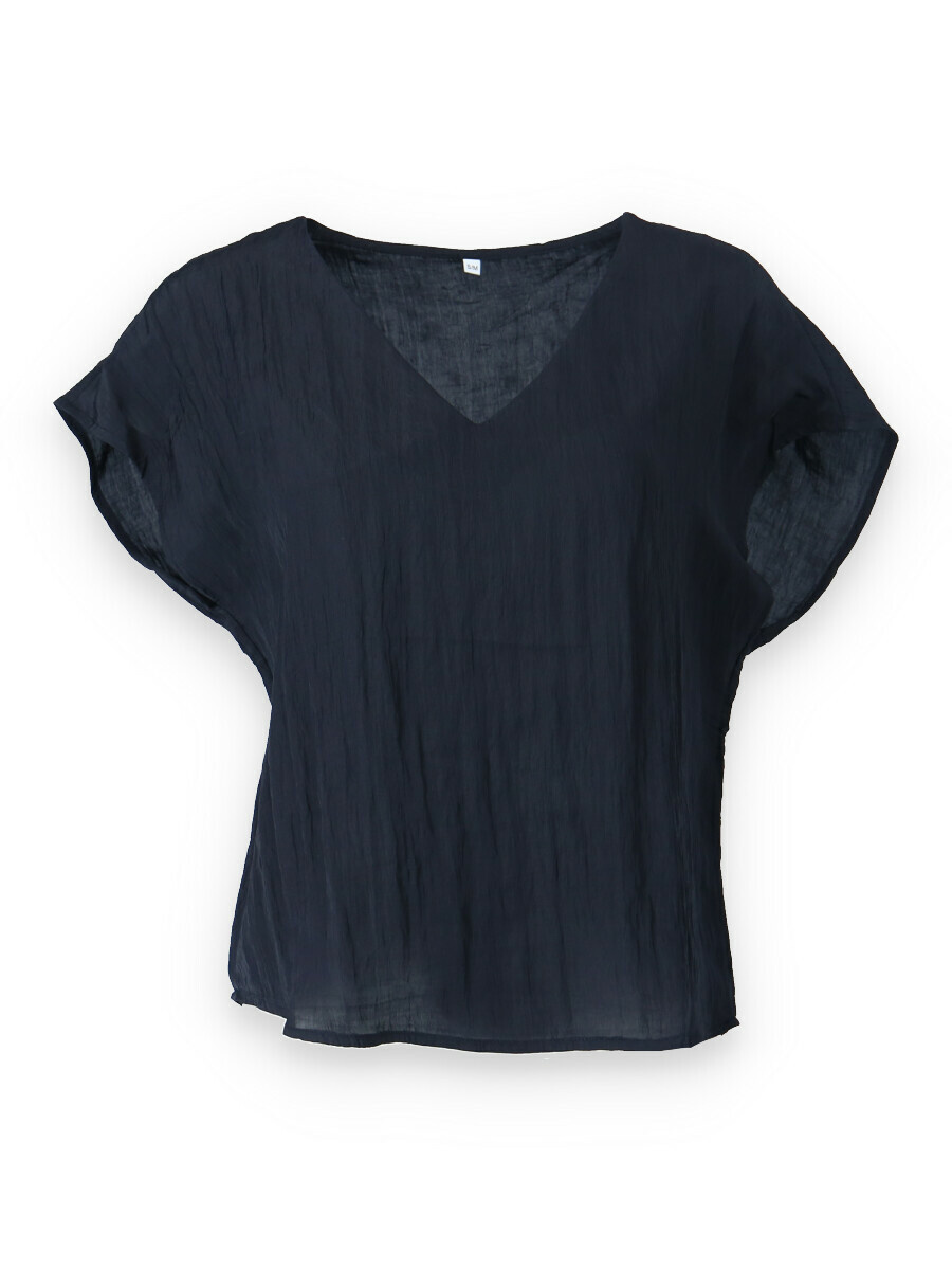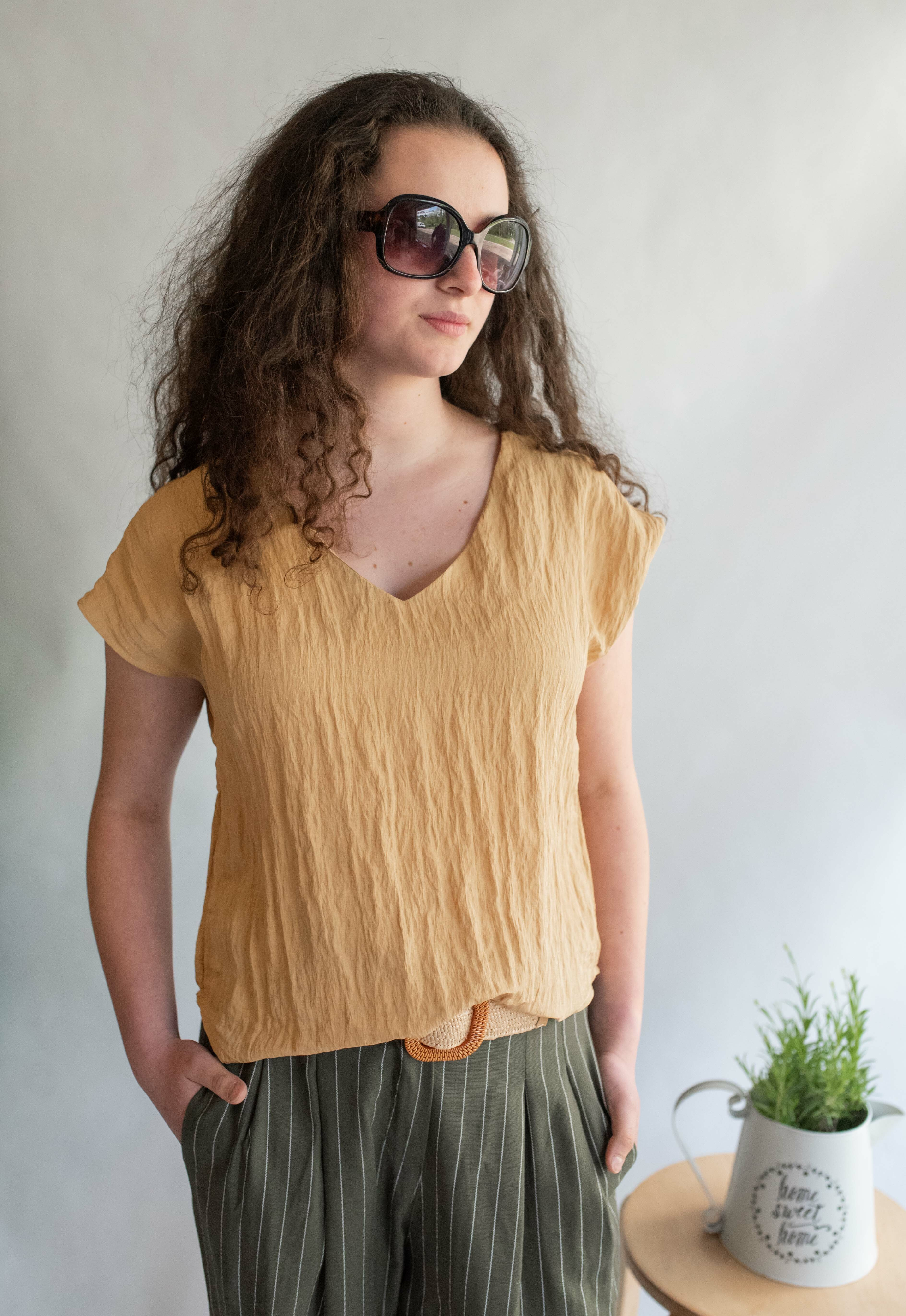 Módní halenka s krátkým rukávem a výstřihem do V. Halenka je z mačkané viskózy.