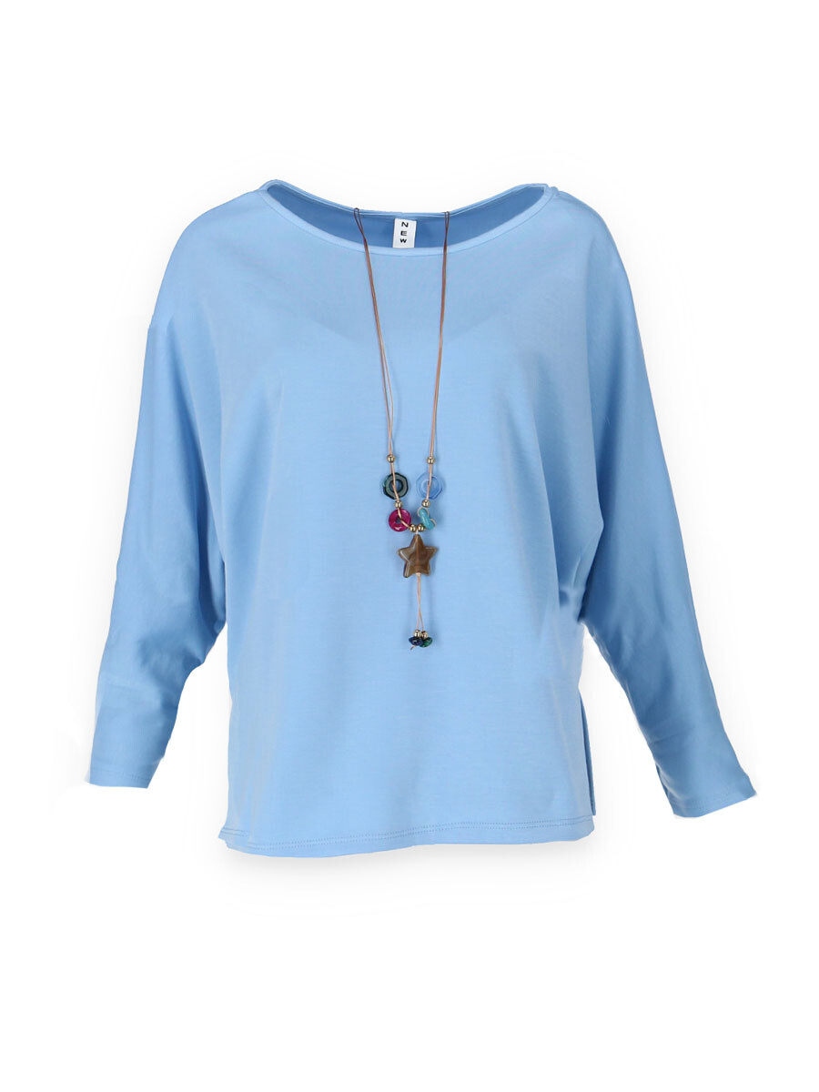 Dámská halenka s raglánovým rukávem, doplněna přívěškem.