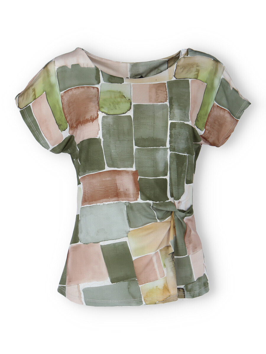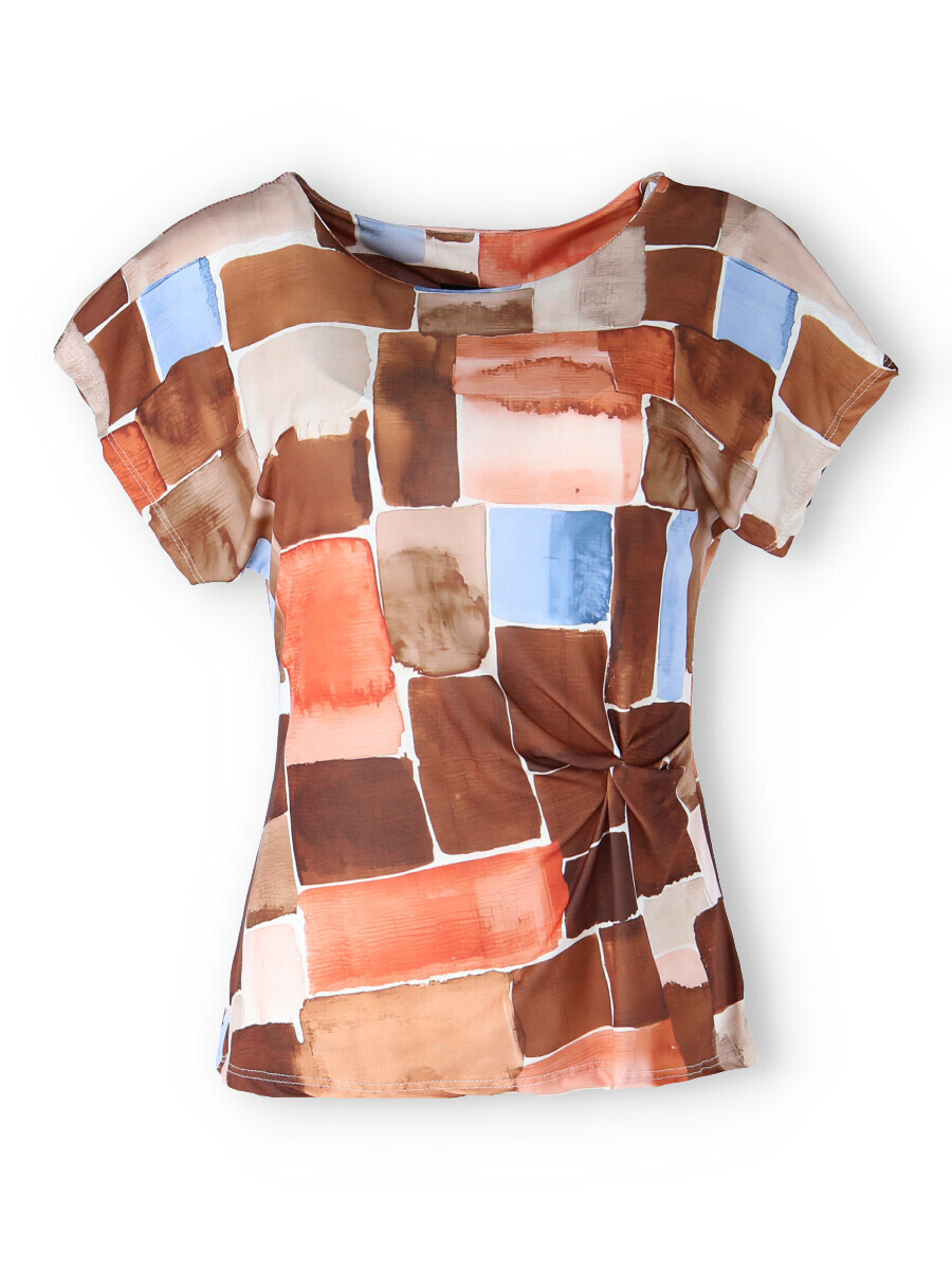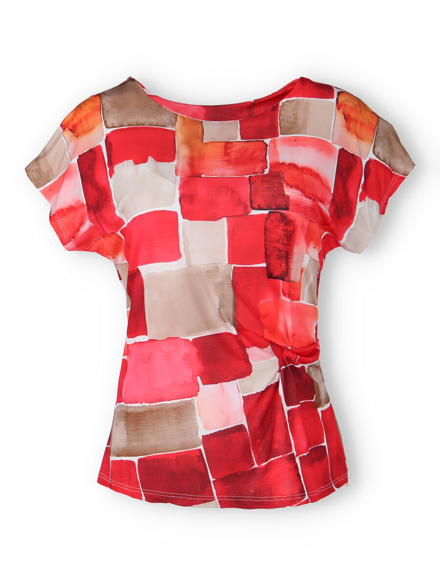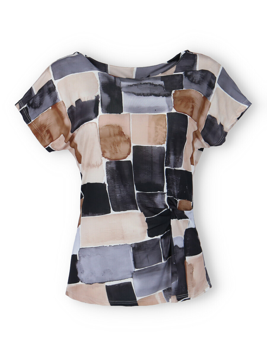 Dámská elegantní halenka s řasením v pase na boku. Halenka má kulatý výstřih a krátký rukáv.