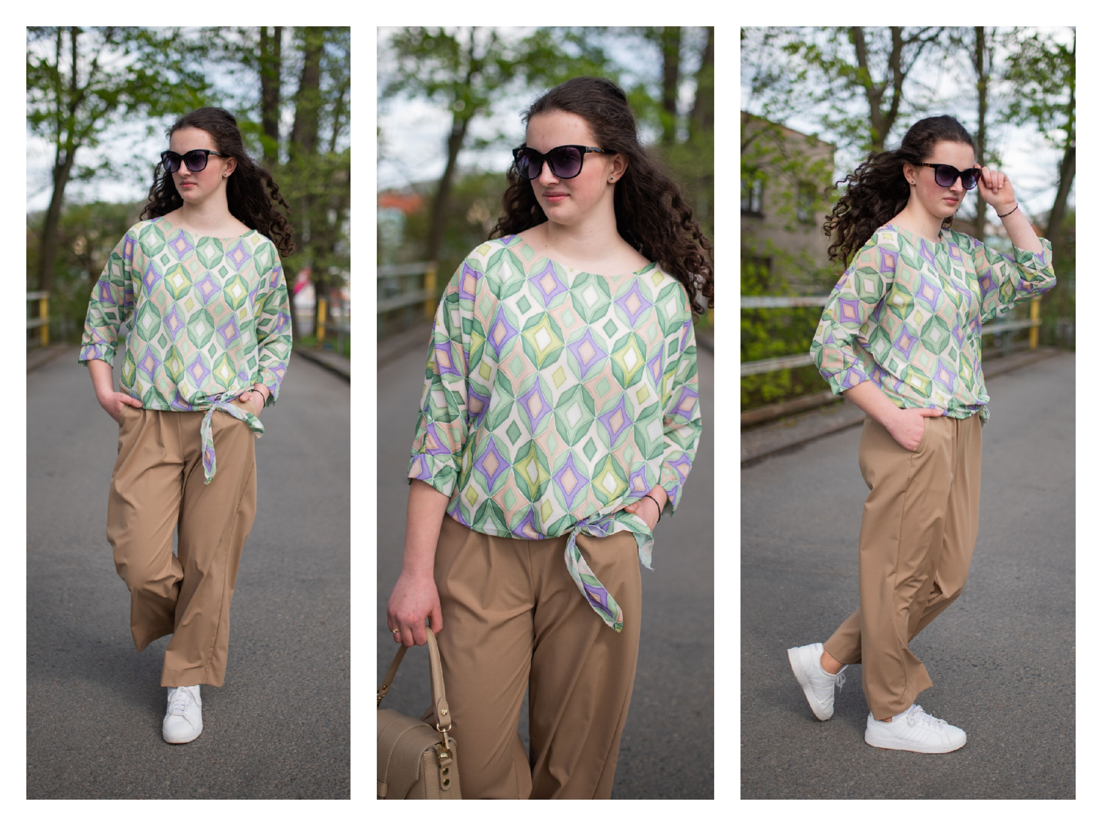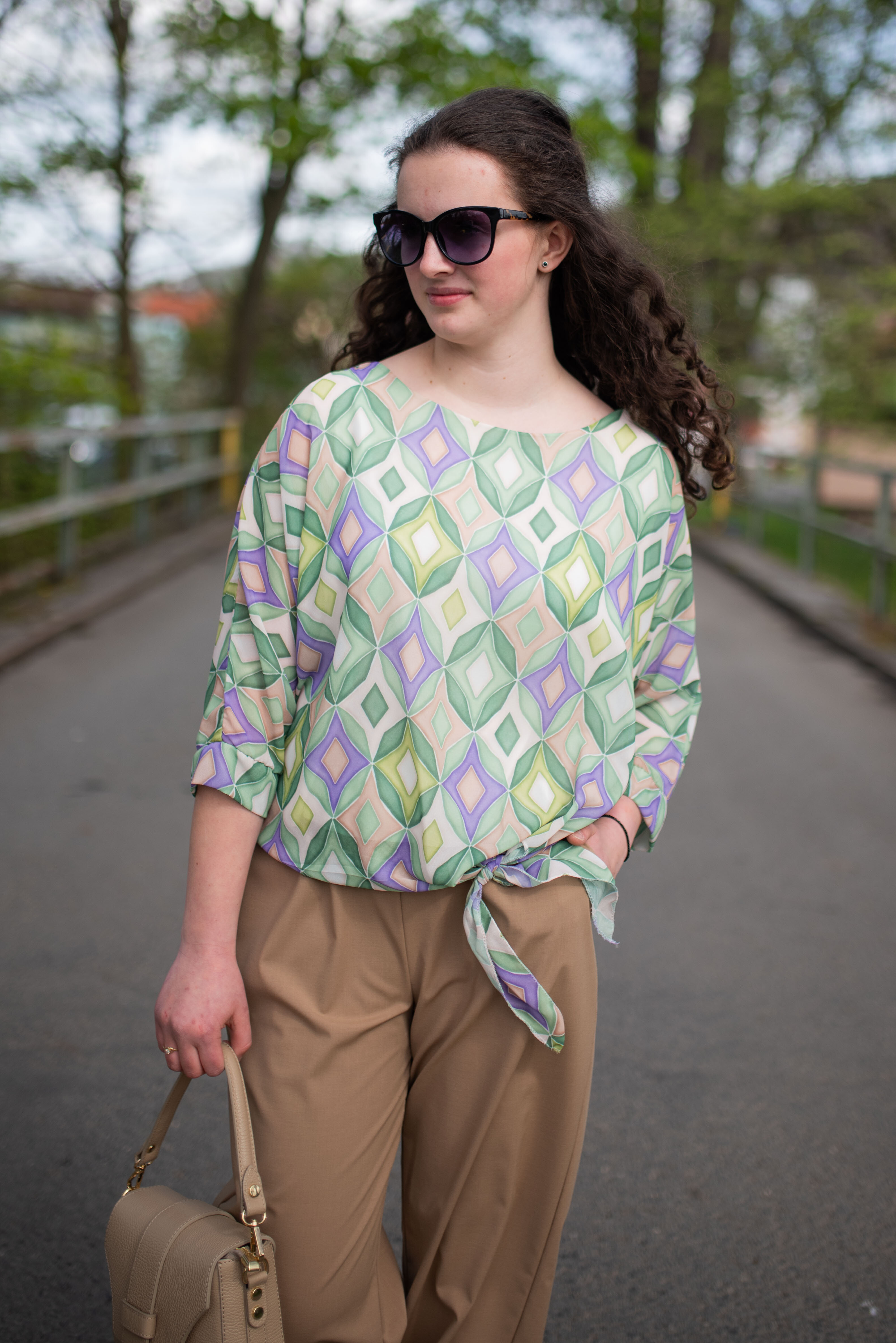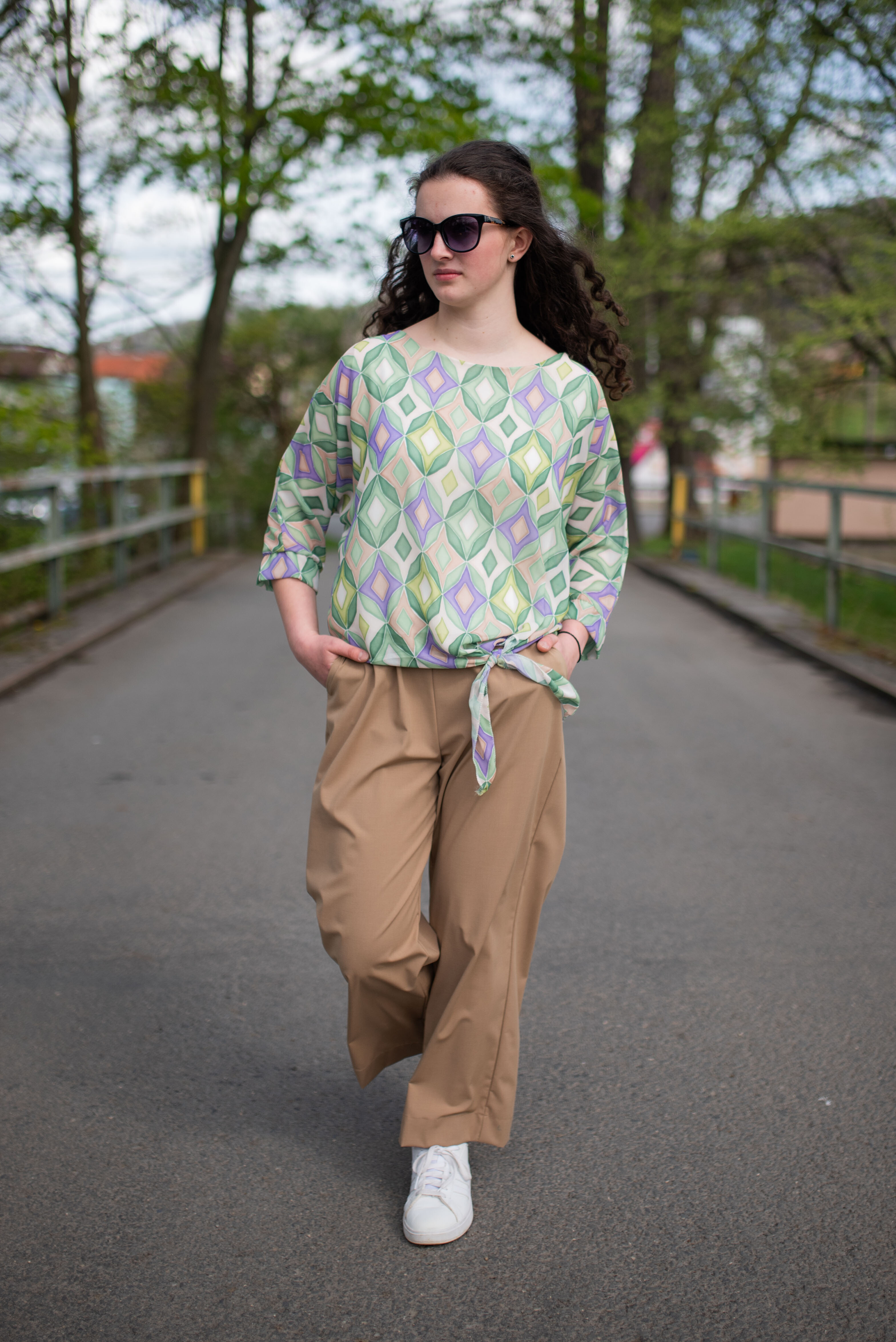Módní halenka s vázáním na boku, lodičkový výstřih, netopýři střih