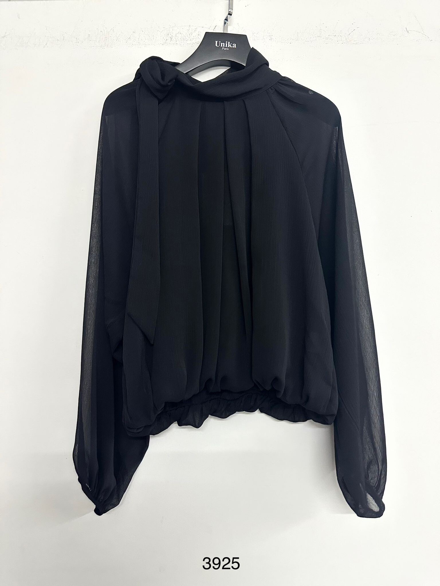 Elegantní halenka s vázáním u krku. Halenka je volnějšího střihu a ve spodní části je zakončena gumičkou.