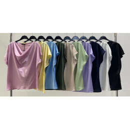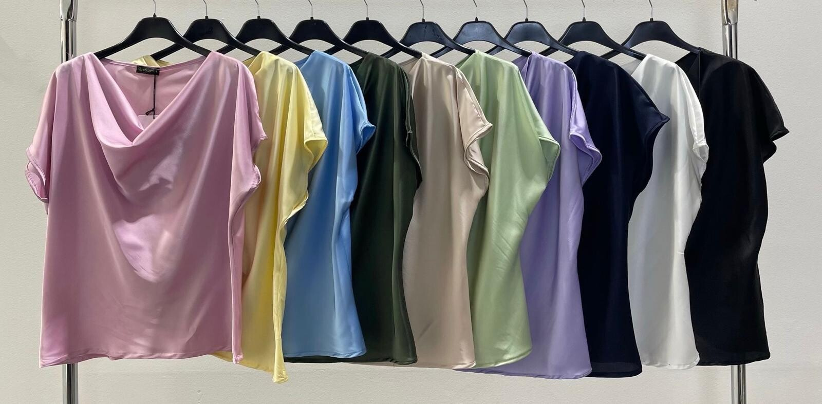 Dámská elegantní saténová halenka volnějšího střihu, s vodou a krátkým rukávem.