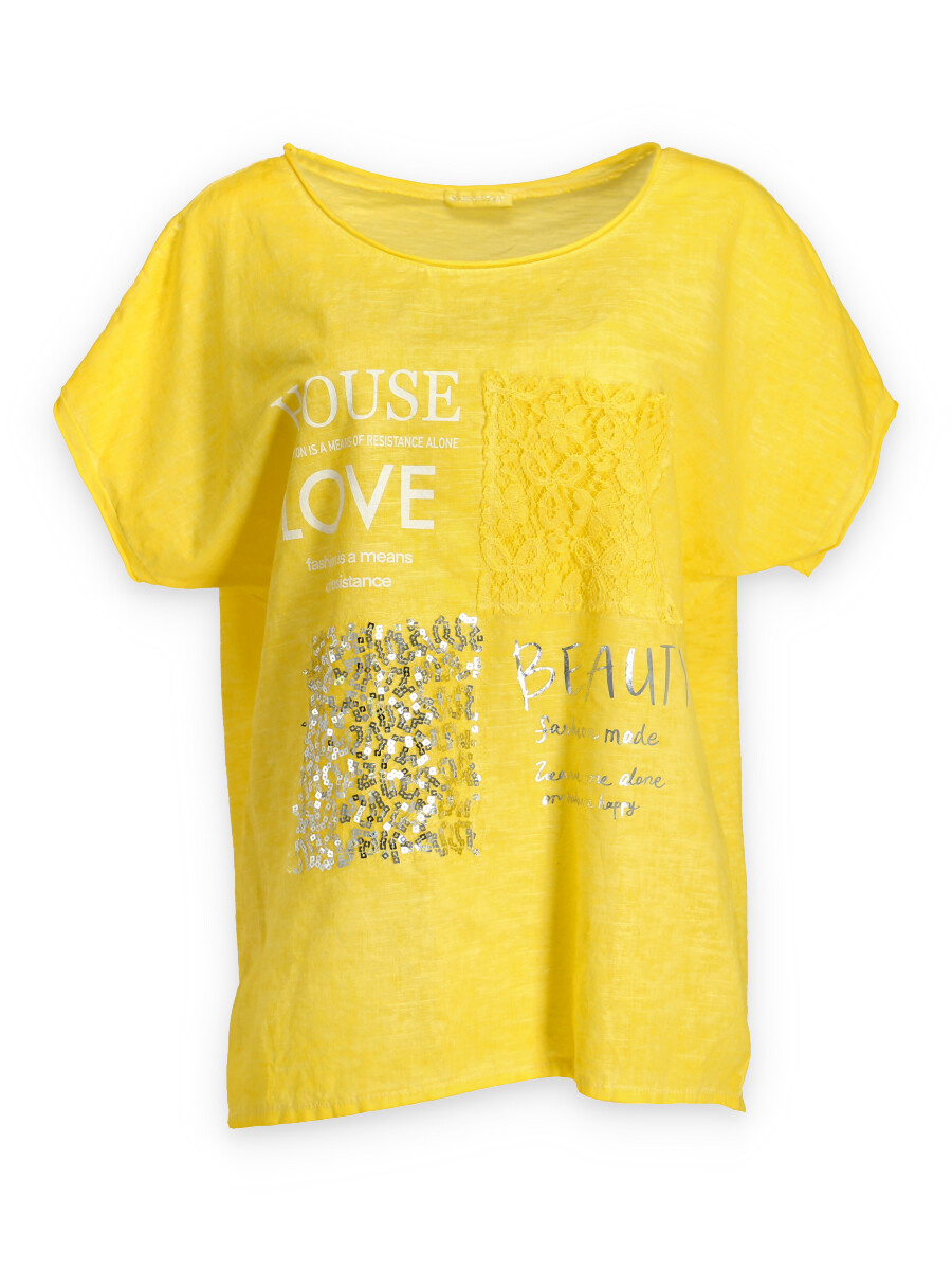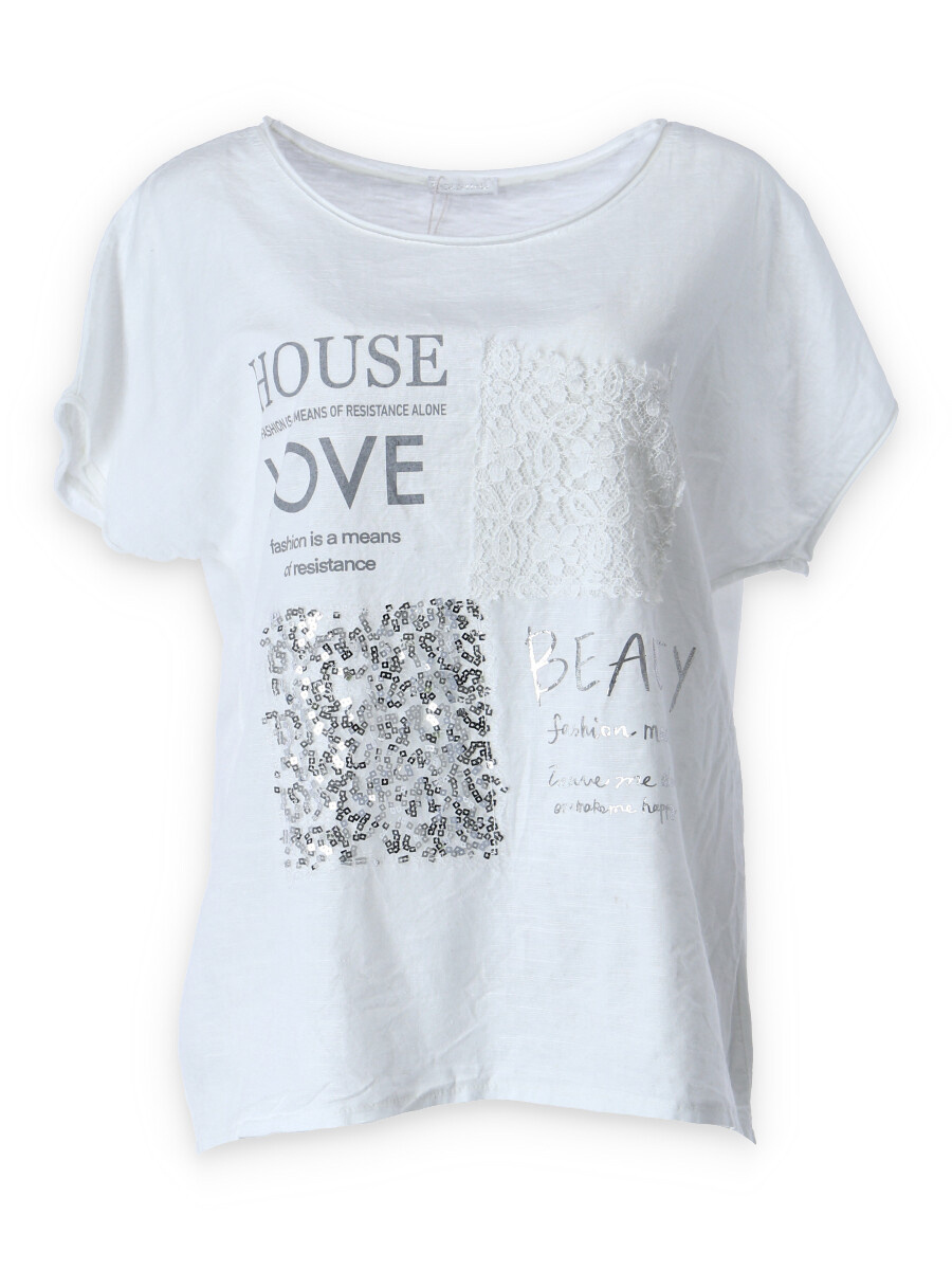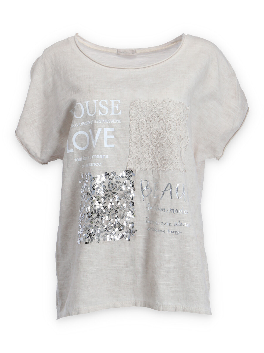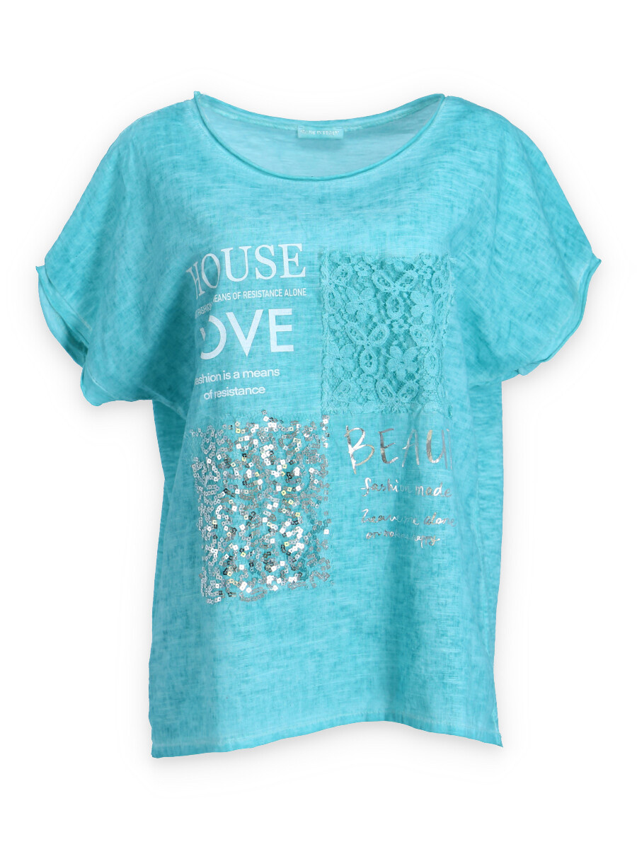 Módní halenka s krátkým rukávem, doplněná potiskem a aplikací.