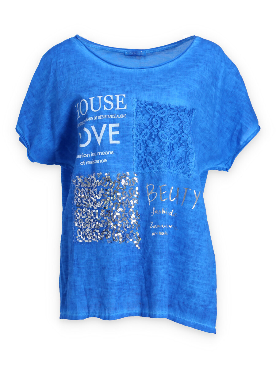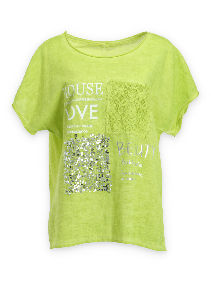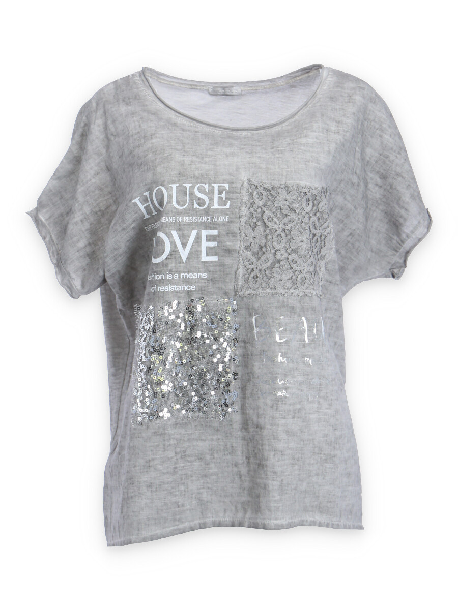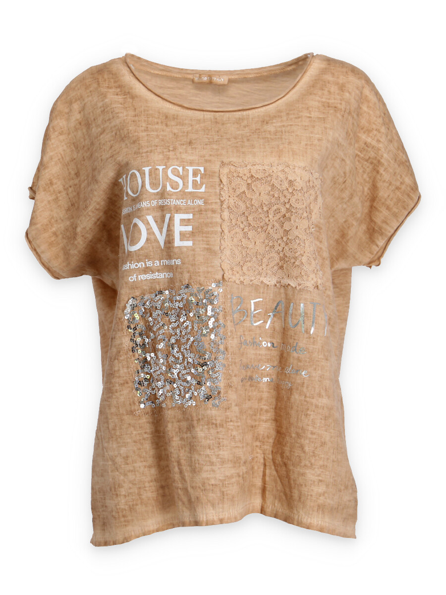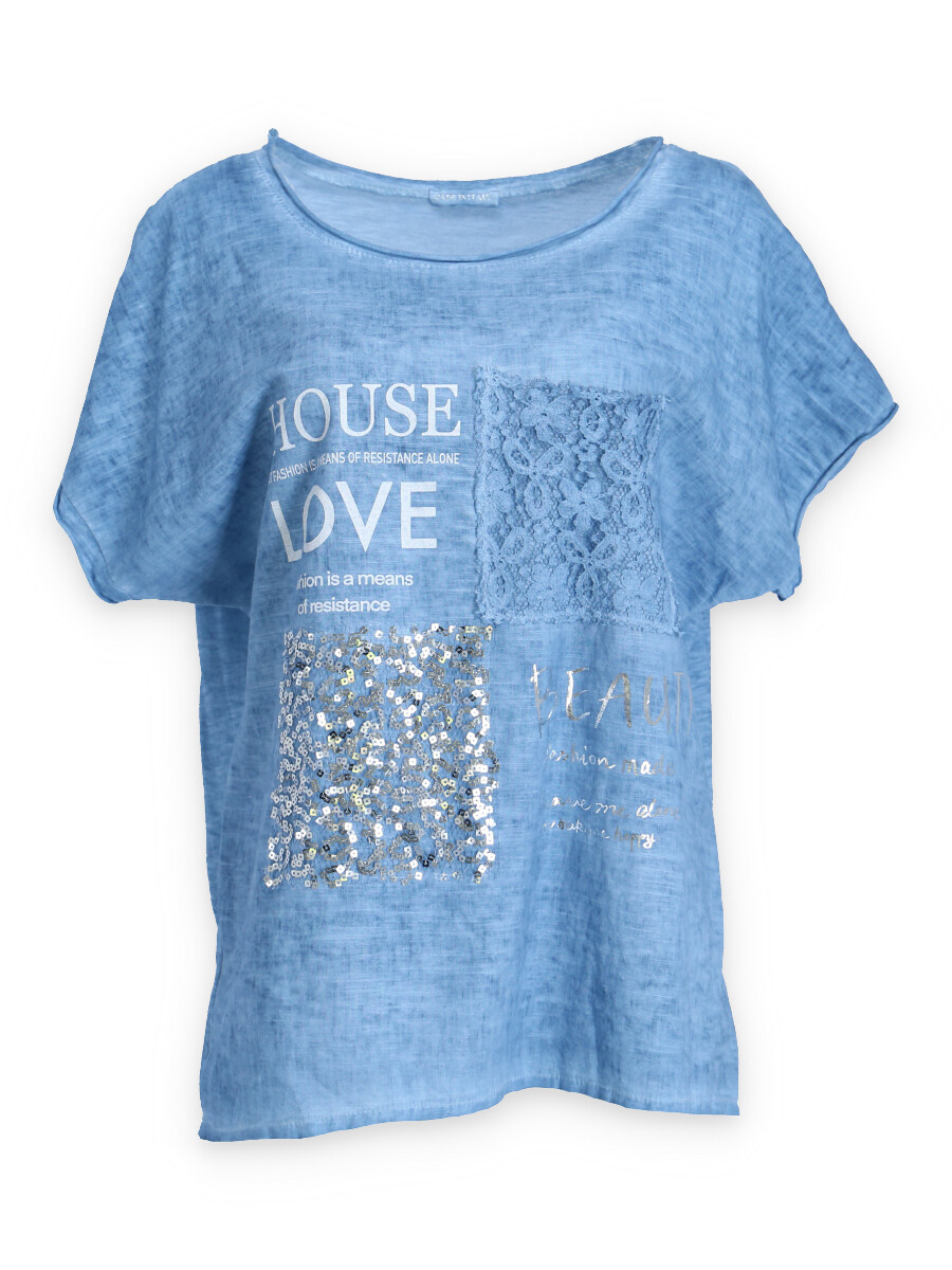 Módní halenka s krátkým rukávem, doplněná potiskem a aplikací.
