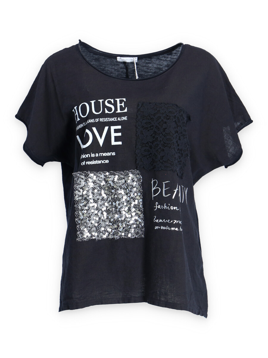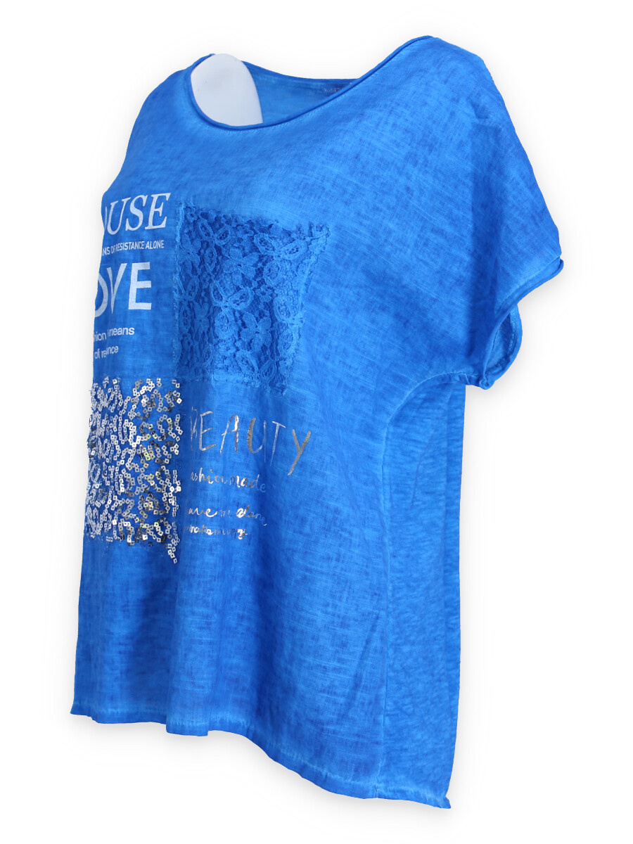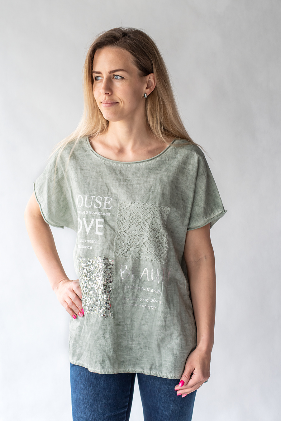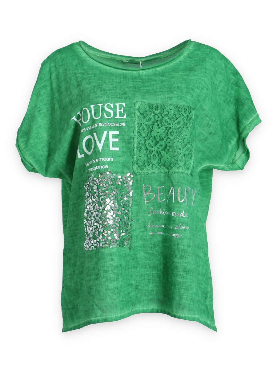 Módní halenka s krátkým rukávem, doplněná potiskem a aplikací.