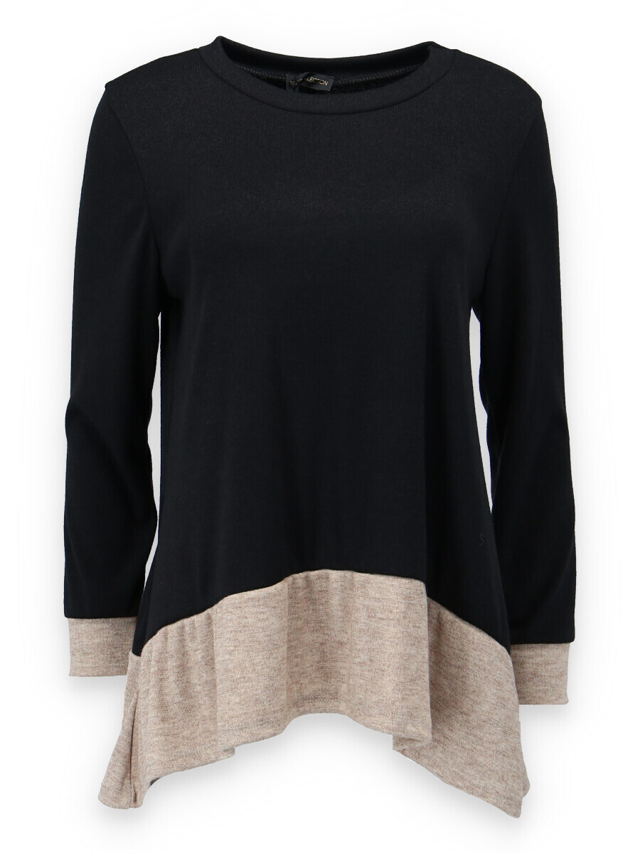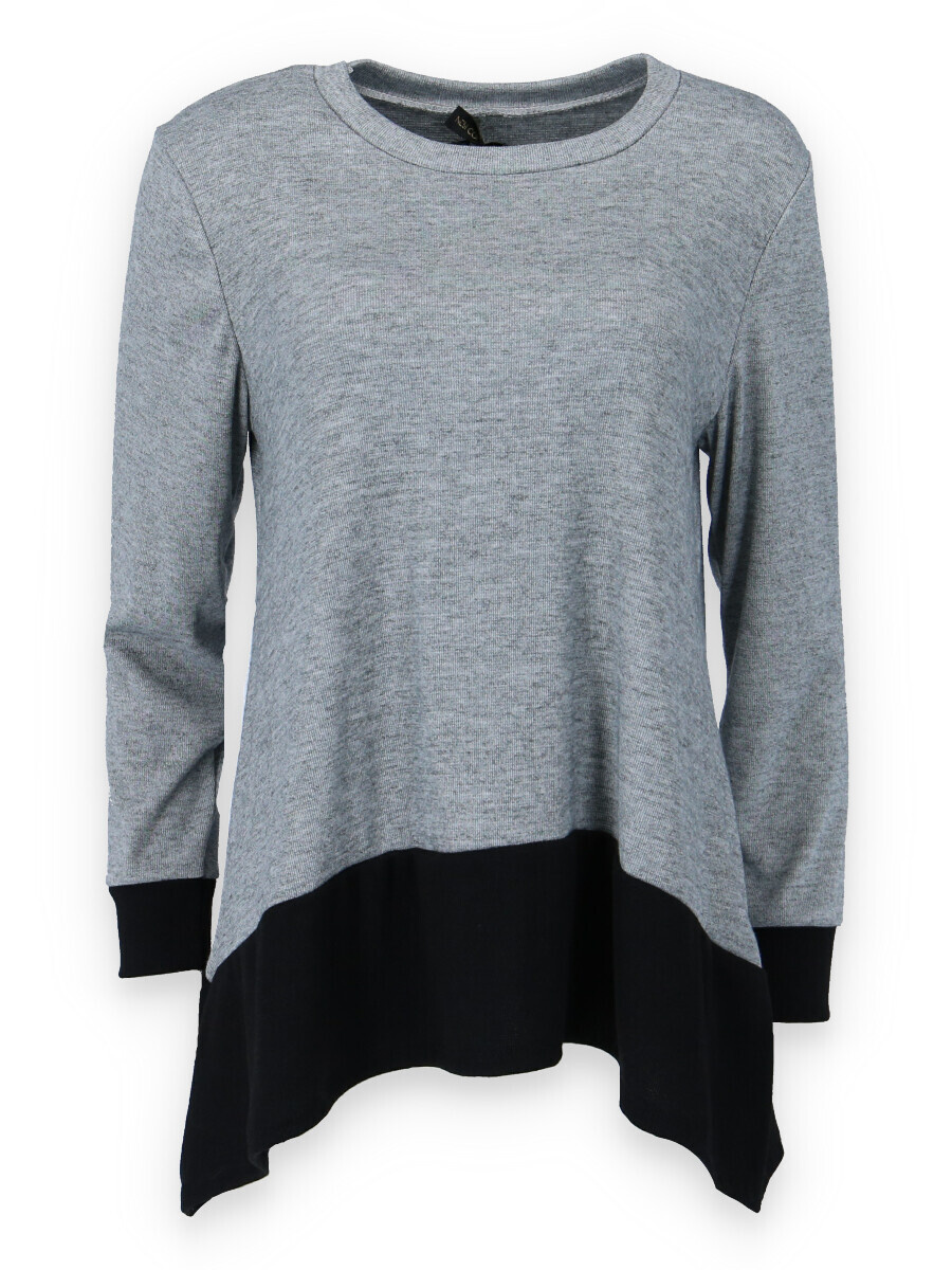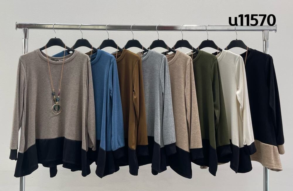Halenka pro každodenní nošení. Halenka je střižená po stranách lehce do cípu a kombinovaná lemem na rukávech a ve spodní části.