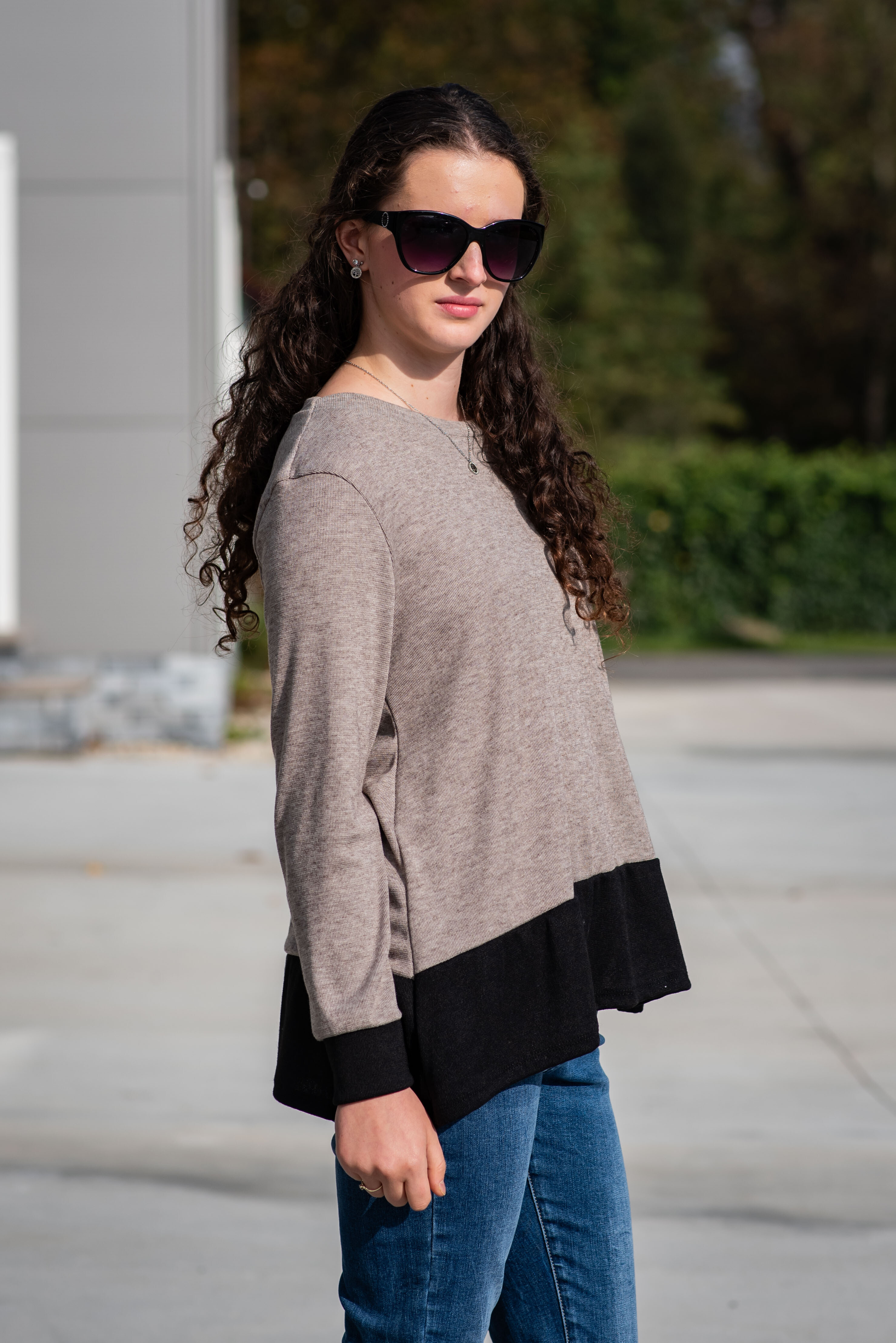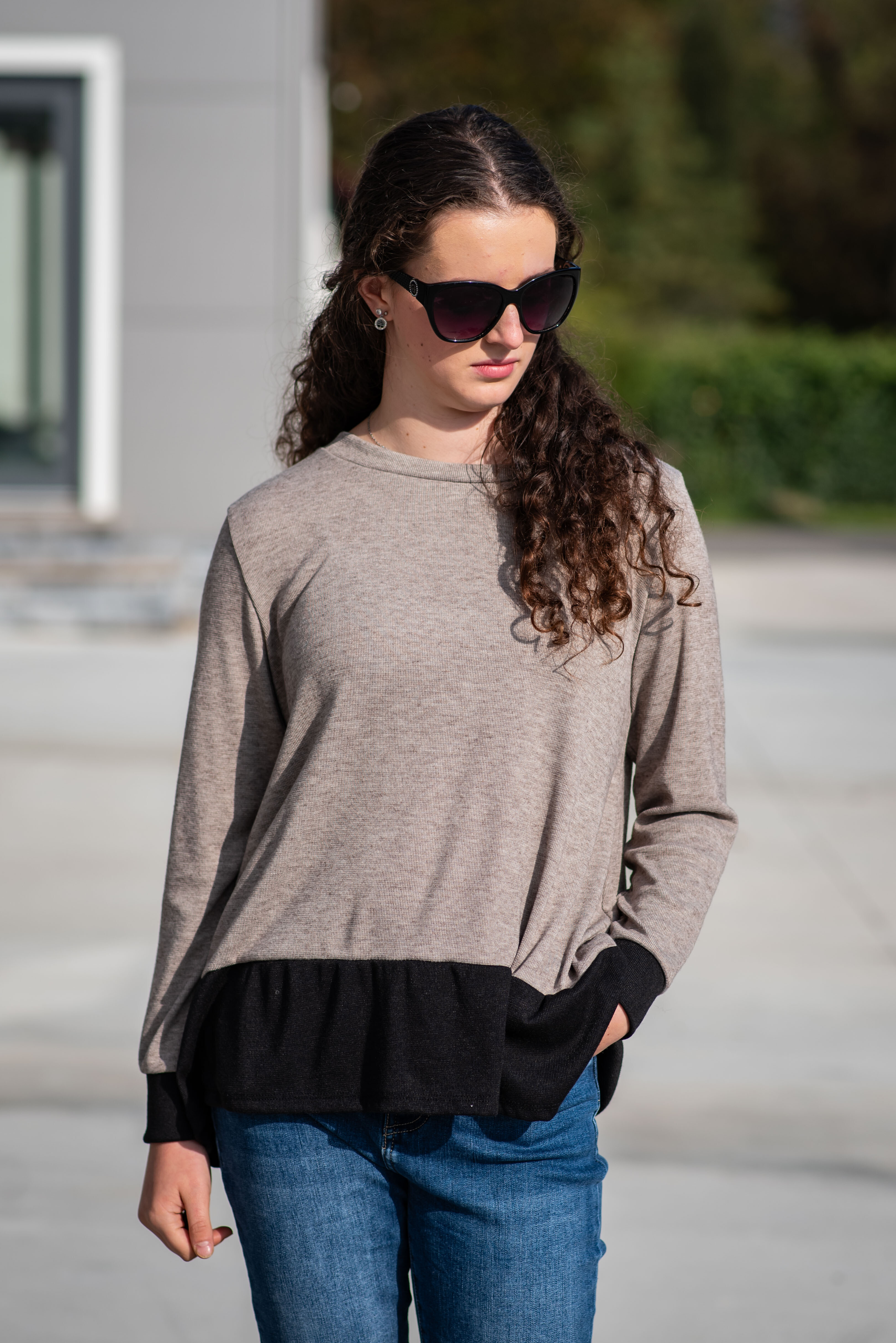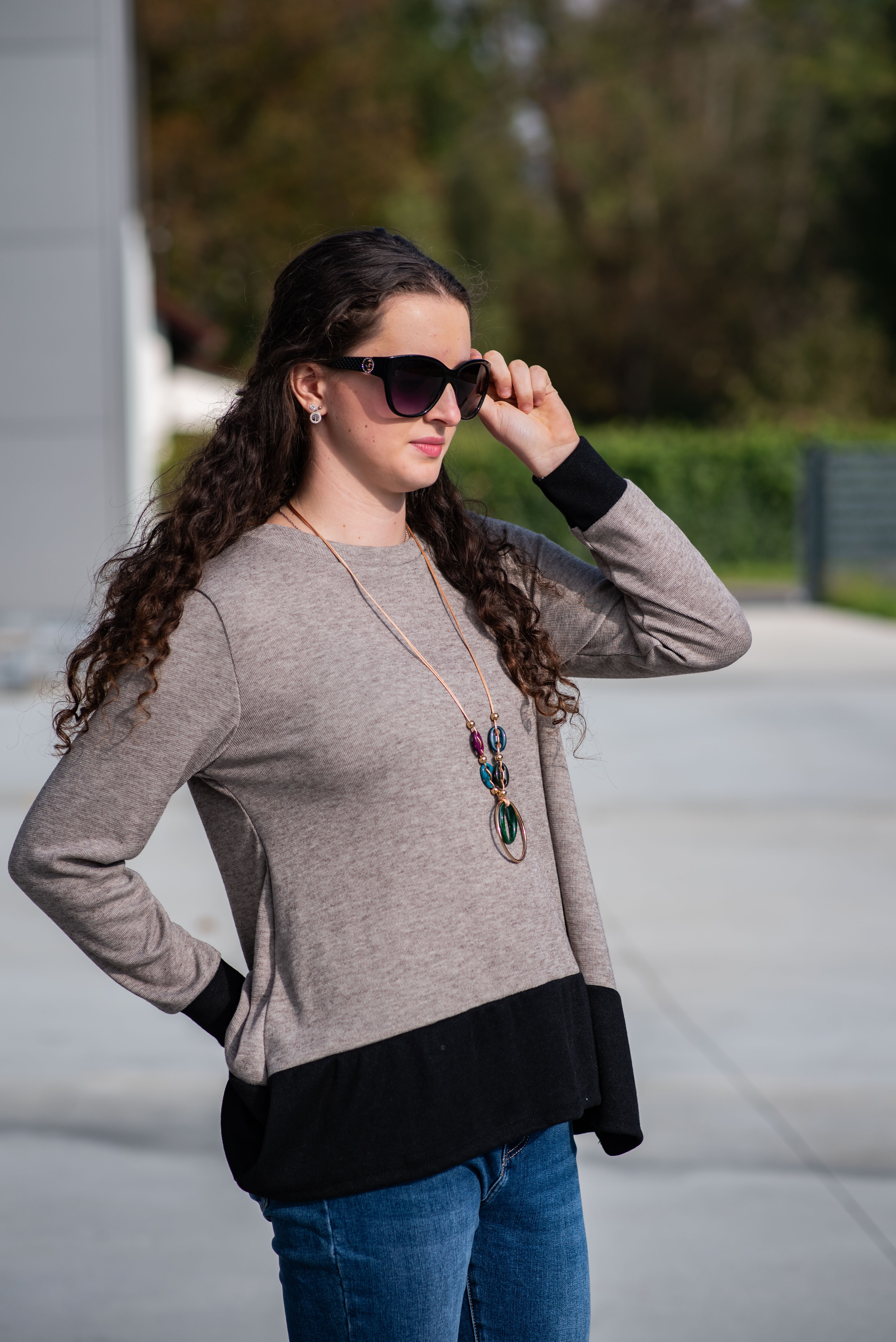 Halenka pro každodenní nošení. Halenka je střižená po stranách lehce do cípu a kombinovaná lemem na rukávech a ve spodní části.