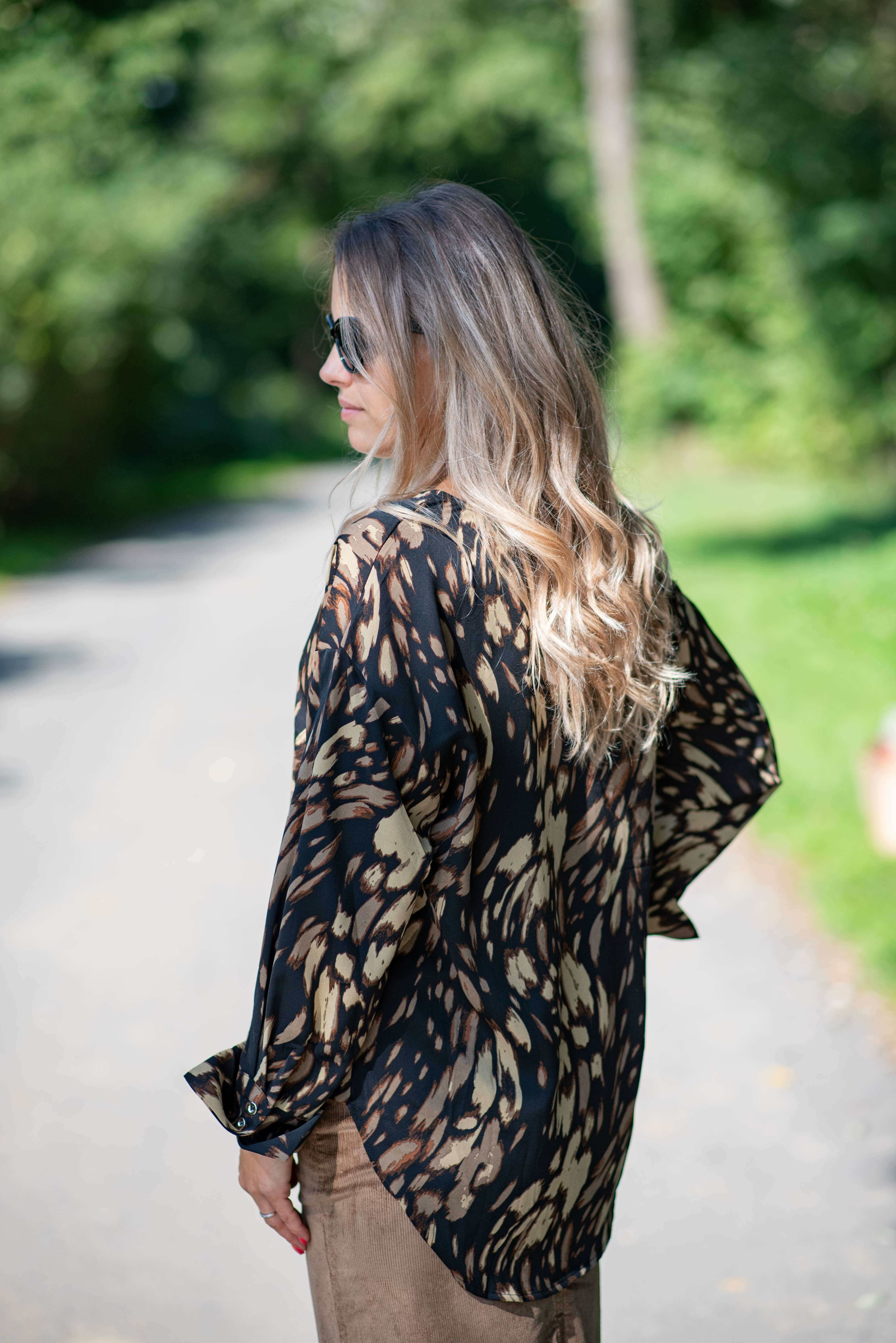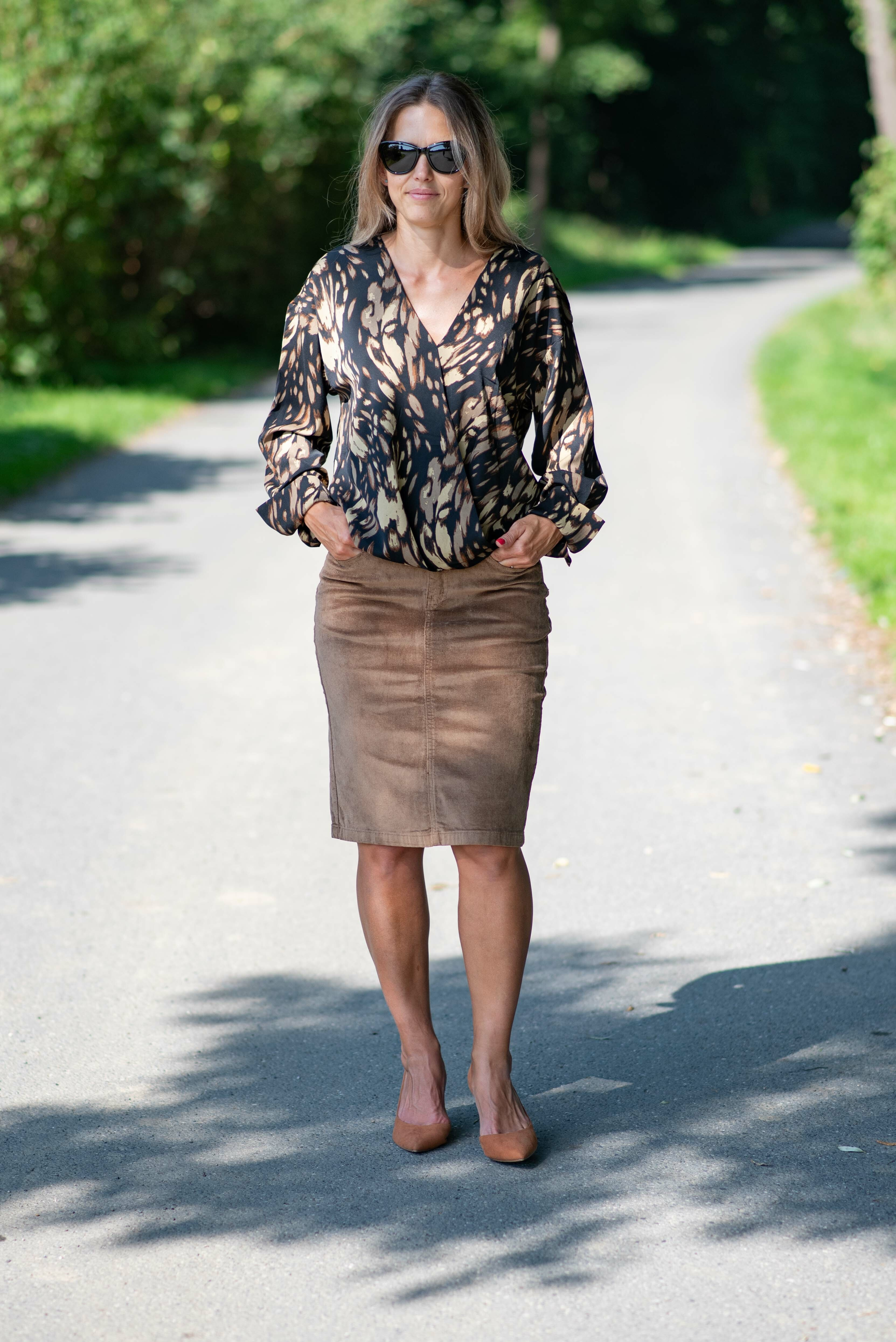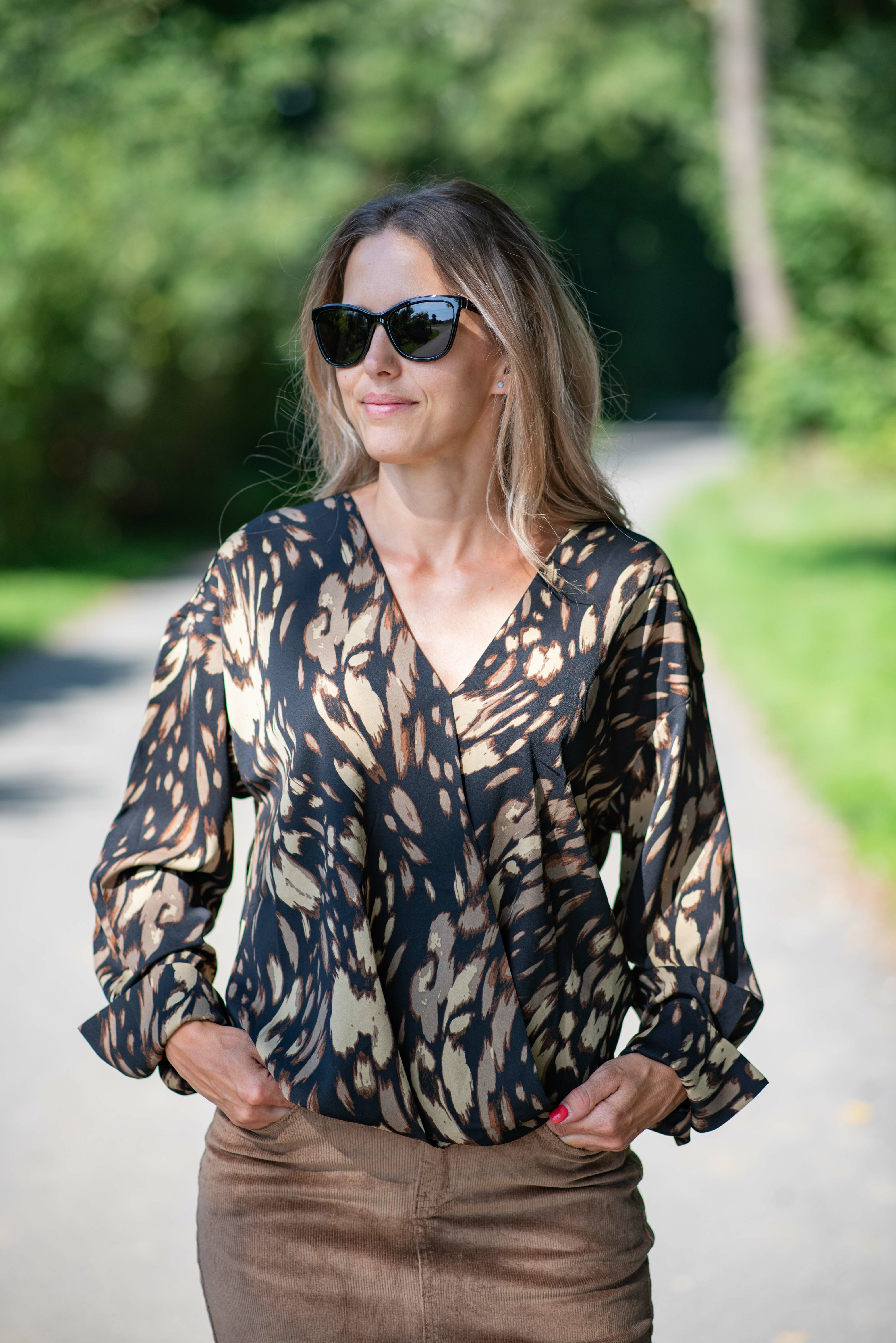 Halenka s překřížením na prsou a dlouhým rukávem.