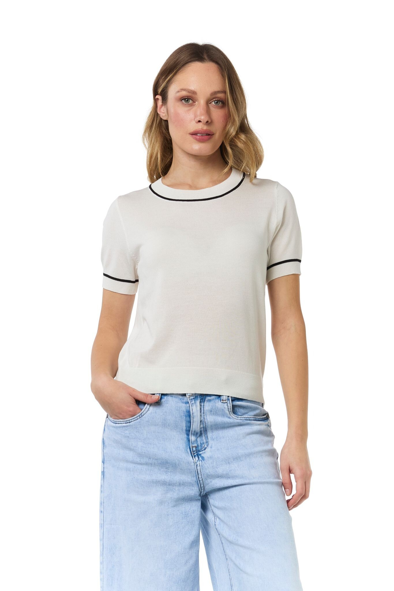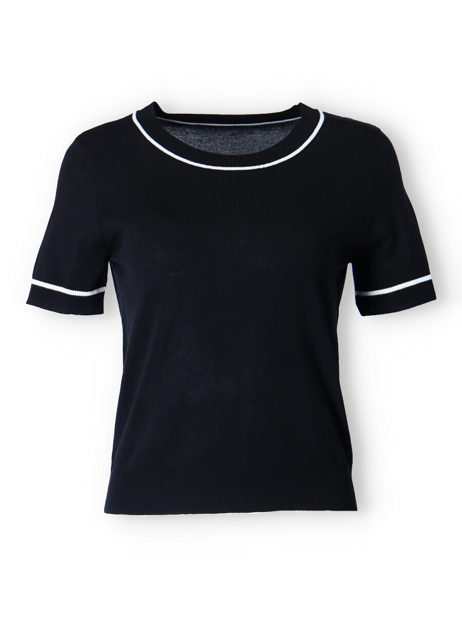 Dámský svetřík s krátkým rukávem a kulatým výstřihem.