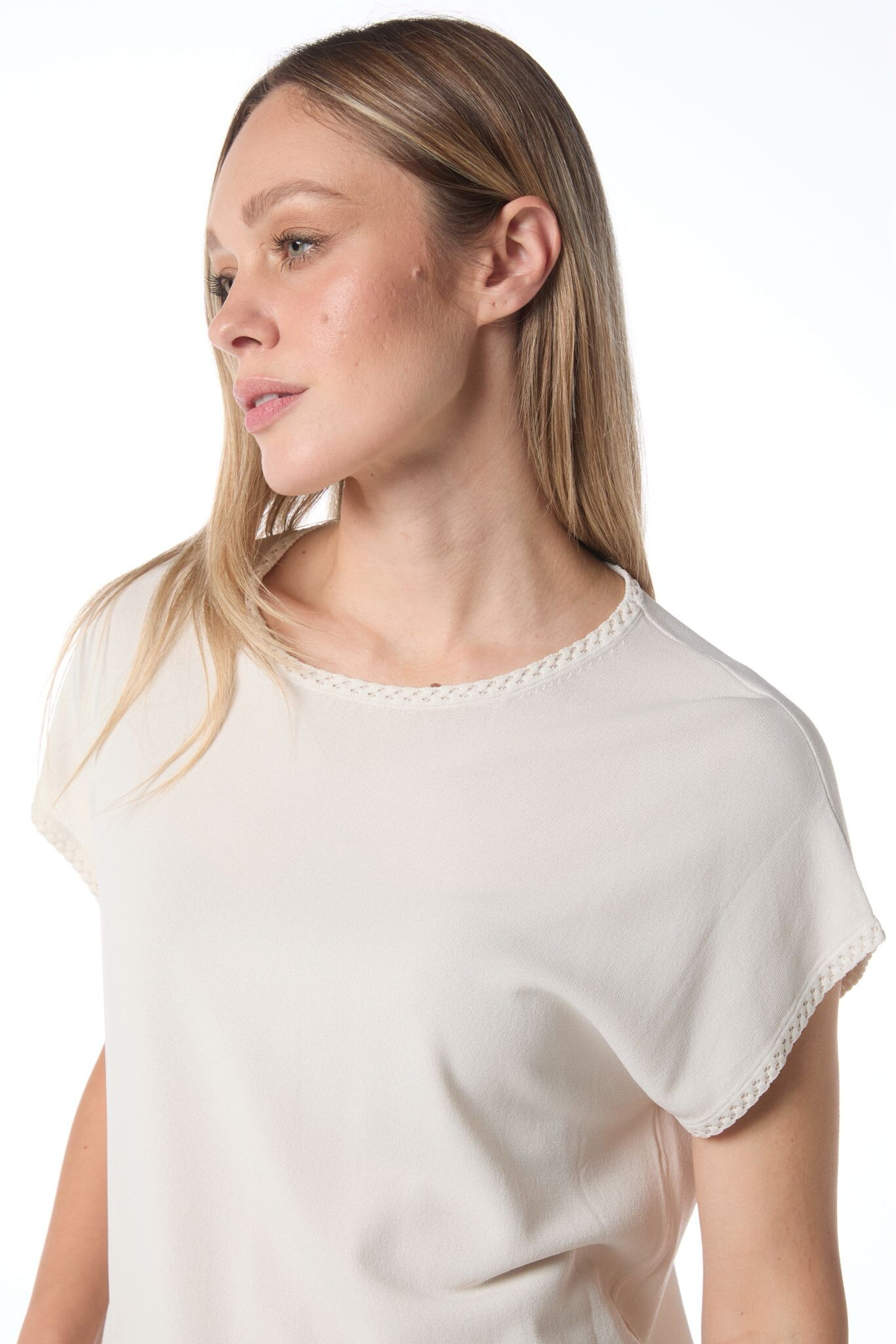 Elegantní halenka s krátkým rukávem. Halenka má kulatý výstřih a krátký rukáv zakončený copánkovým lemem.
