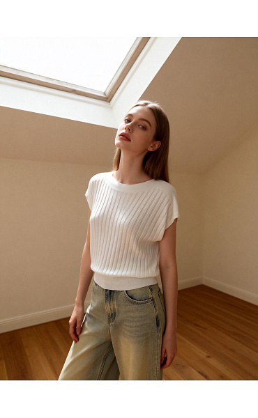 Elegantní halenka s krátkým rukávem. Halenka má lodičkový výstřih a je z pruhovaného úpletu.