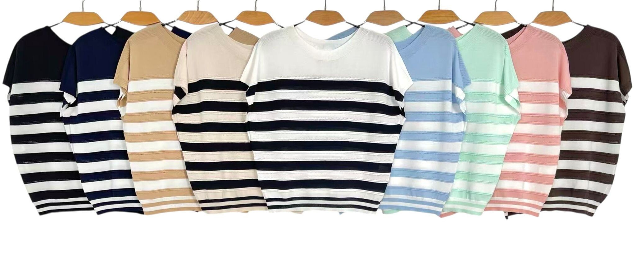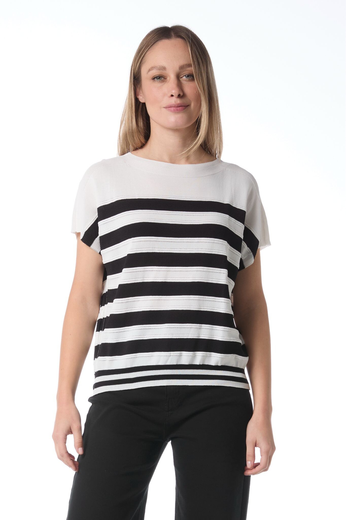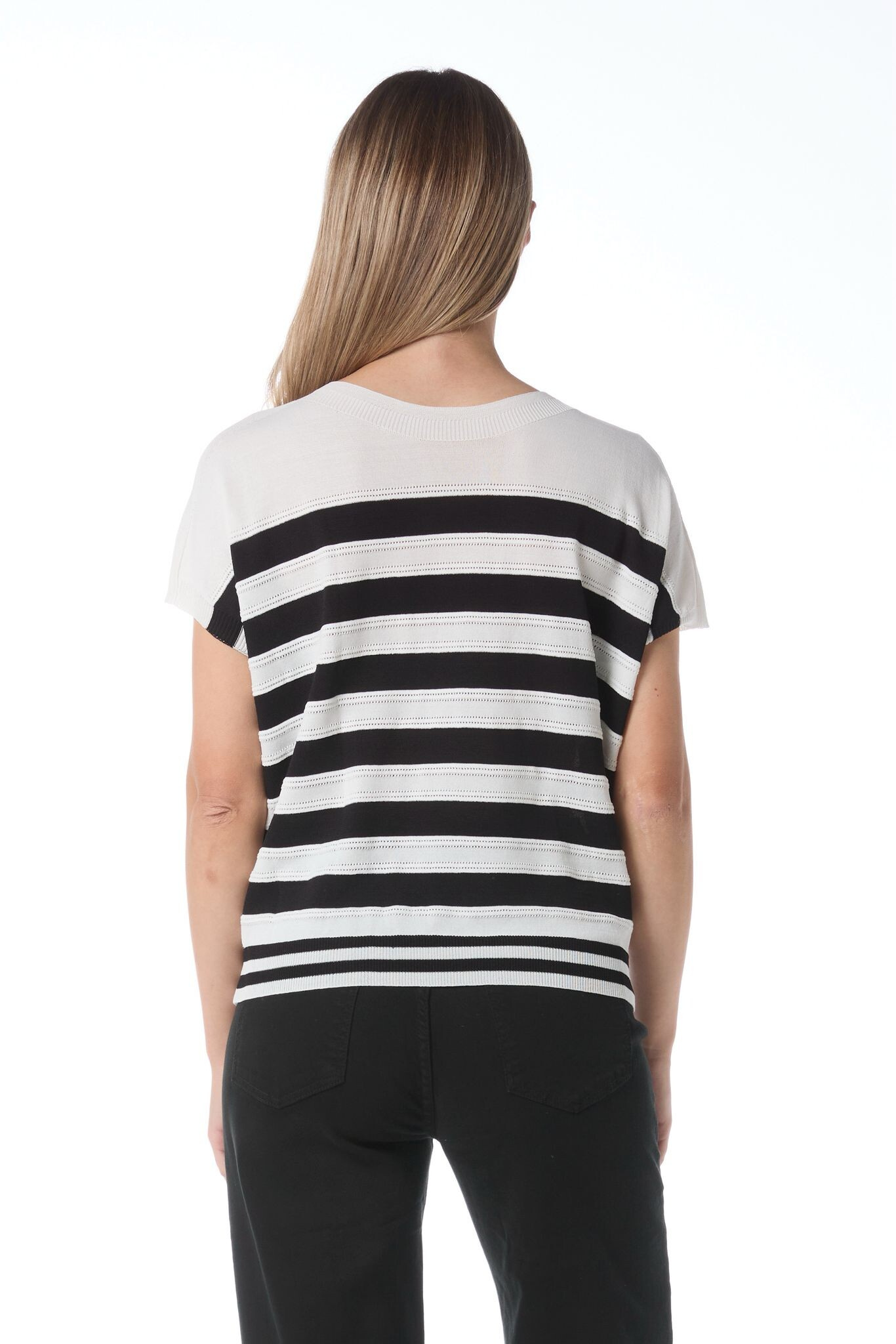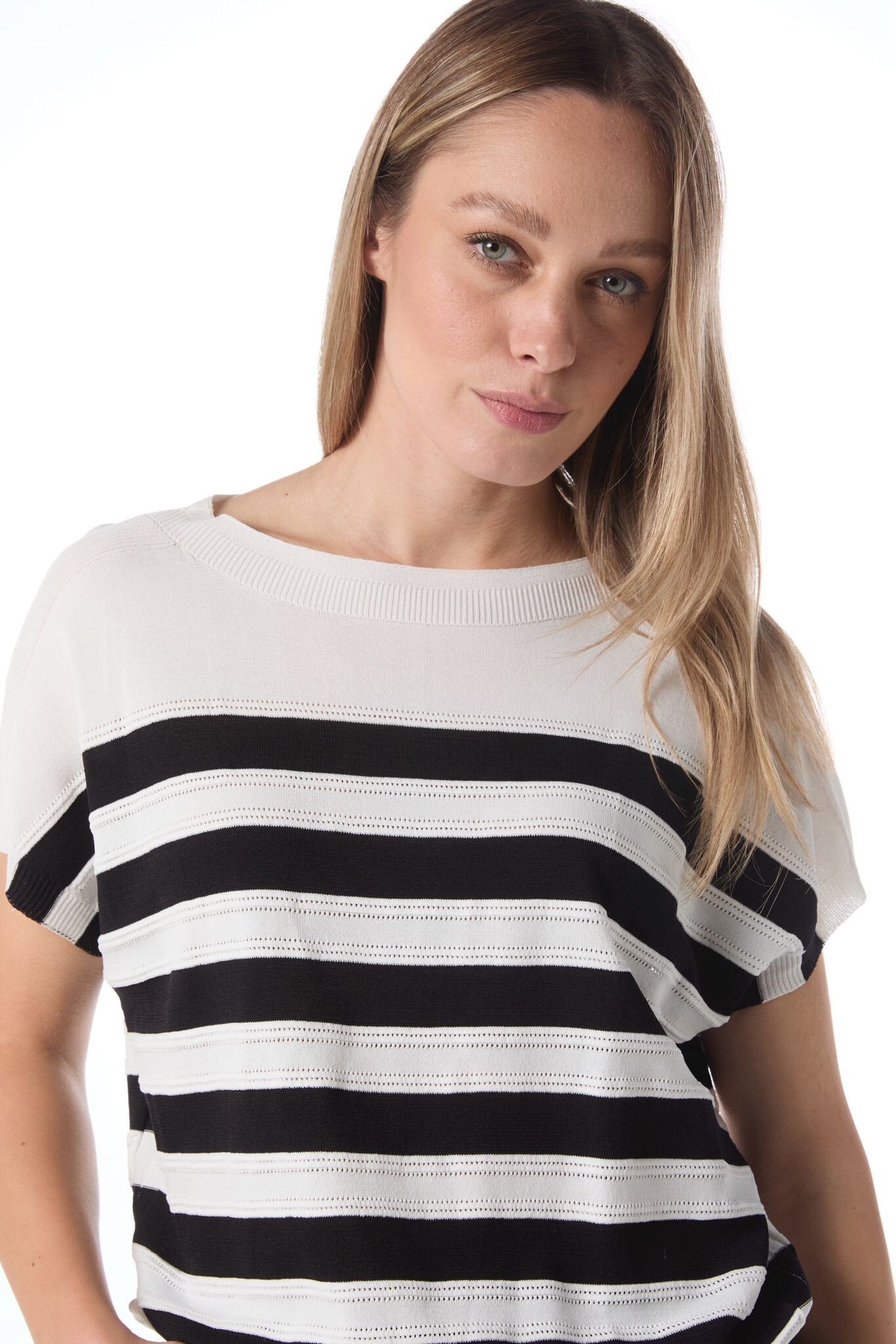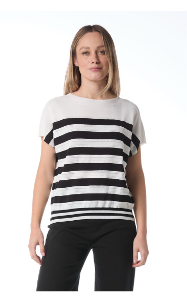 Elegantní halenka s proužkem s jemného dírkovaného úpletu. Halenka je volnějšího střihu, má krátký rukáv a kulatý výstřih.
