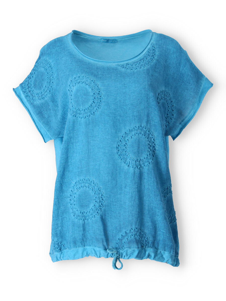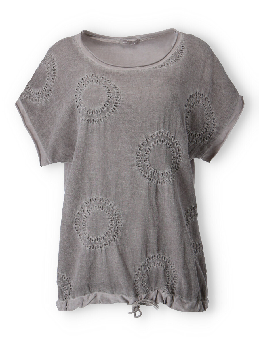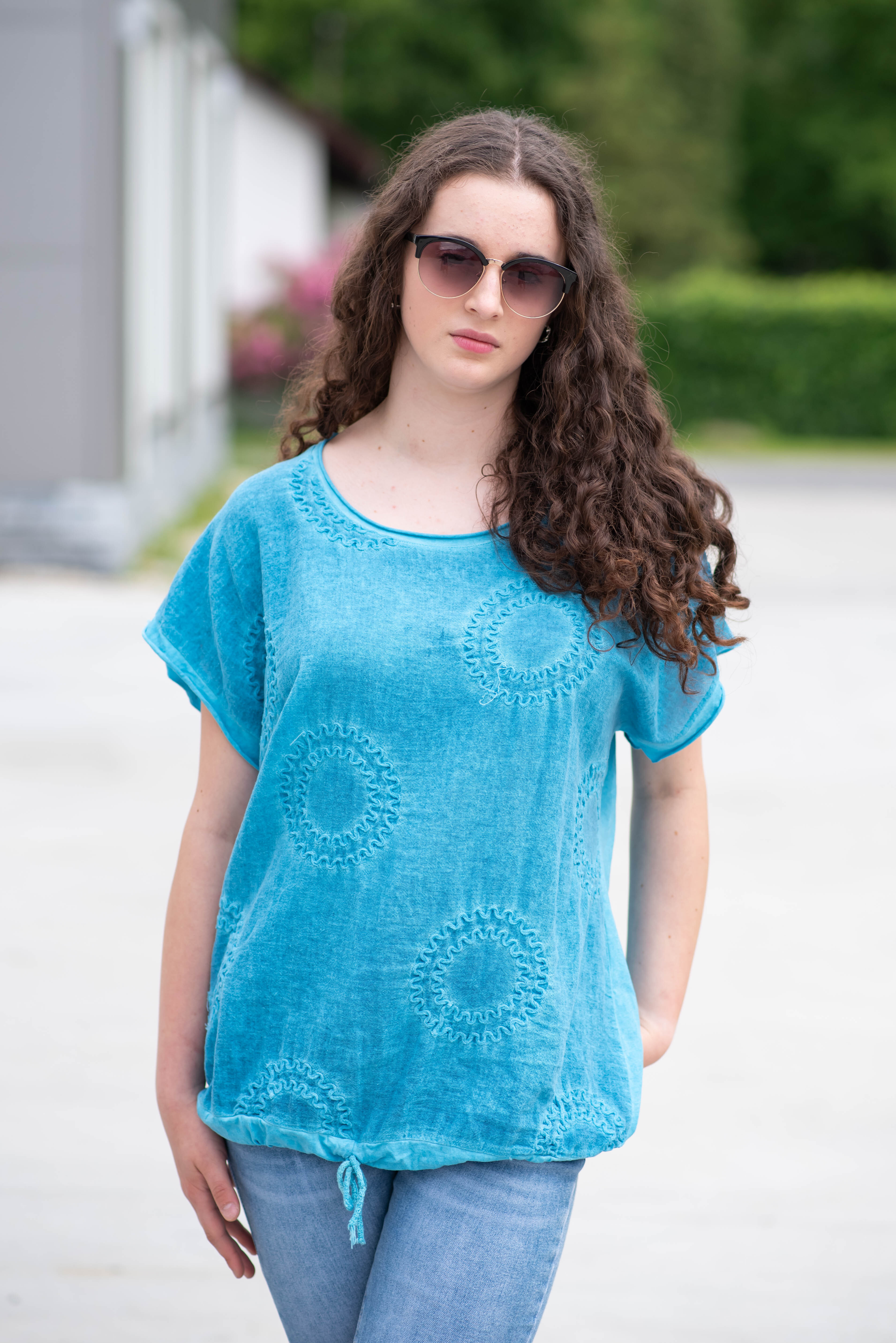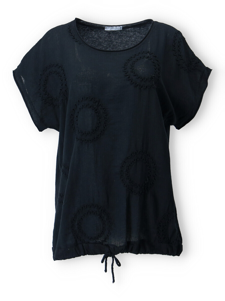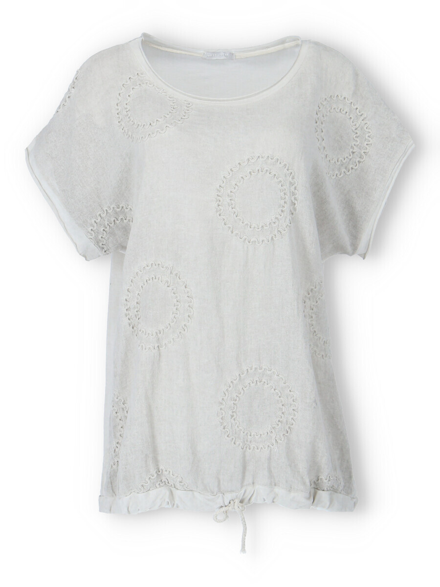 Dámská halenka s výšivkou na přední straně. Halenka/triko má krátký rukáv, kulatý výstřih a v oblasti pasu je možnost utažení na šňůrku. Vyrobeno v Itálii.
