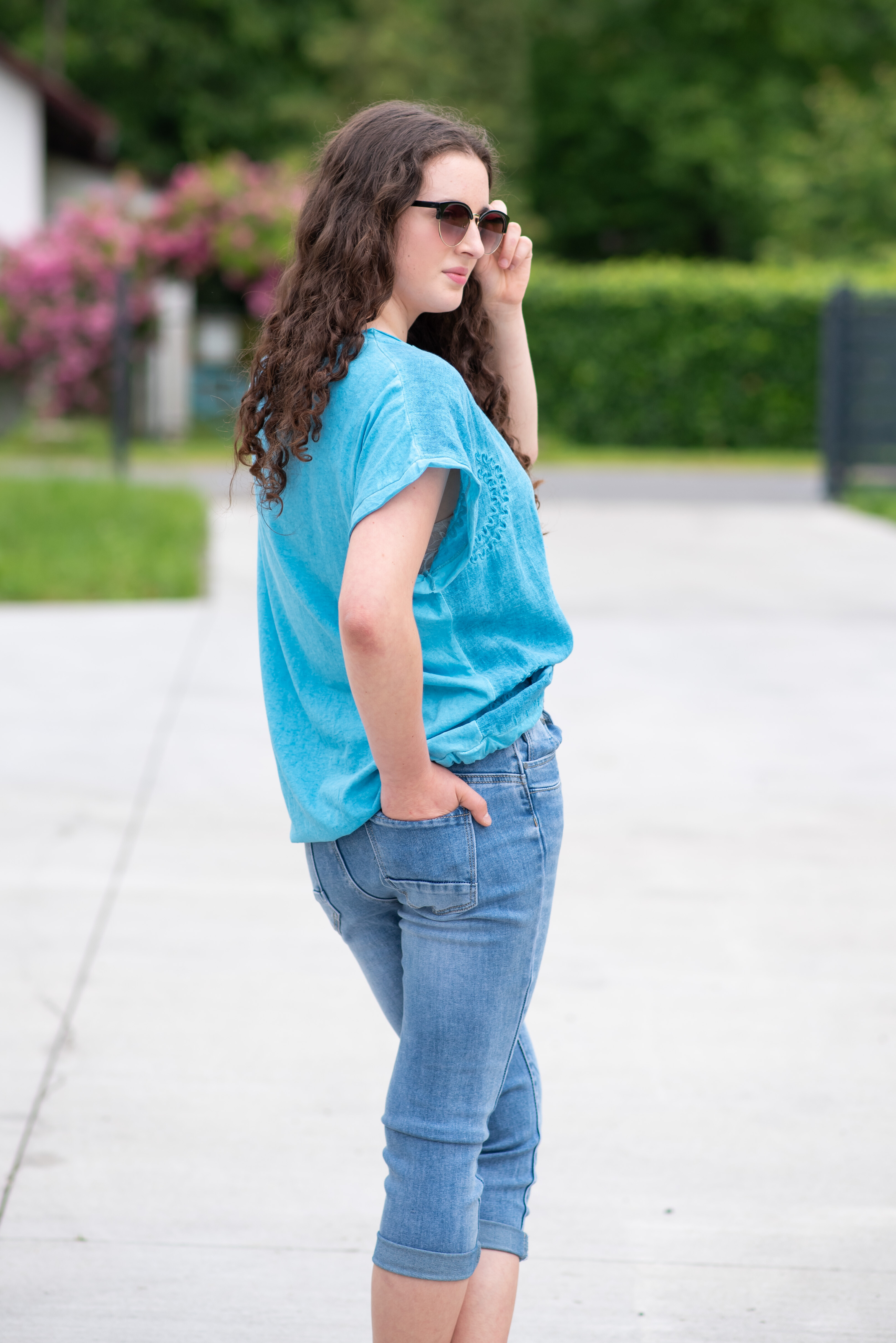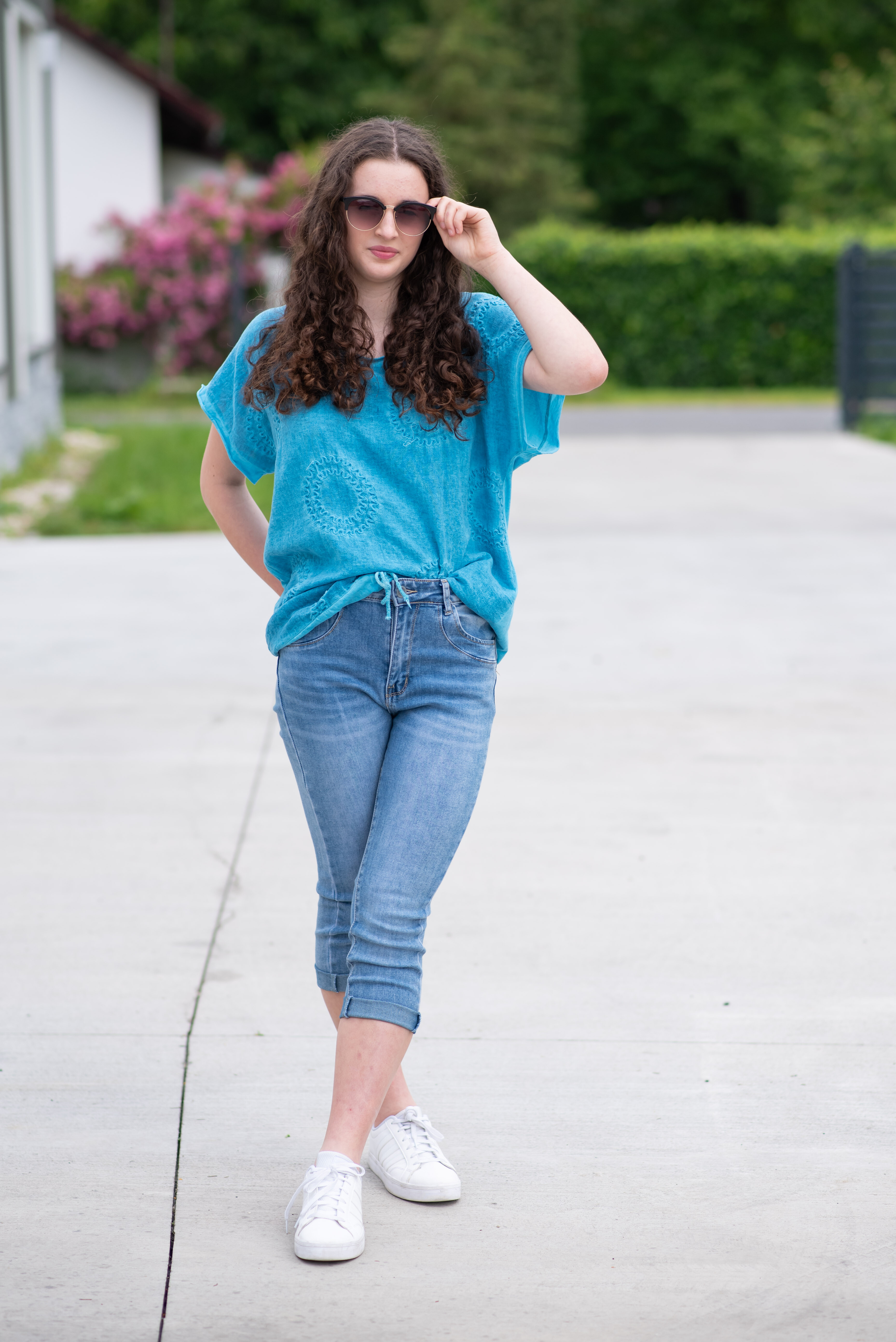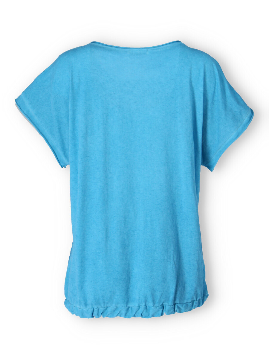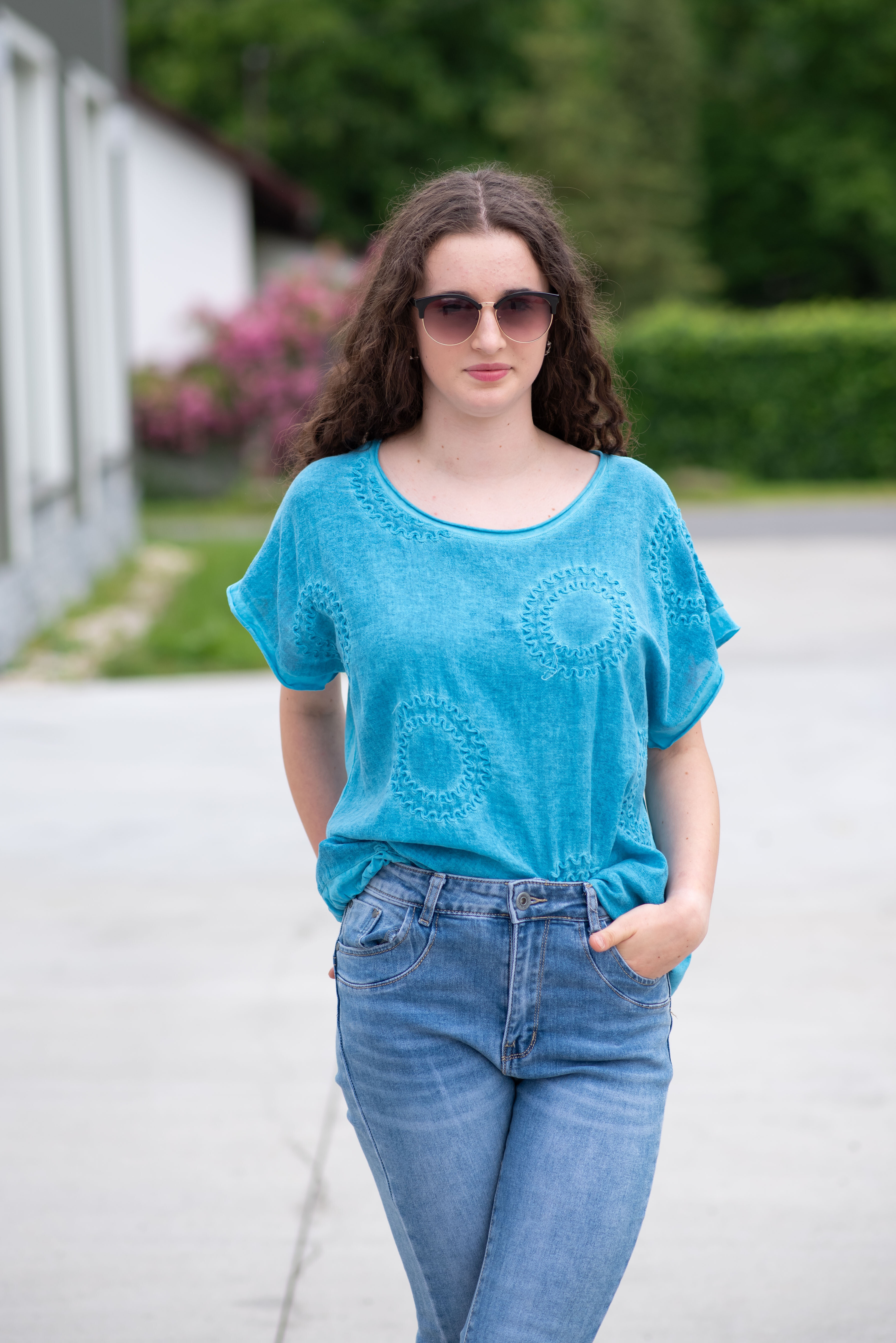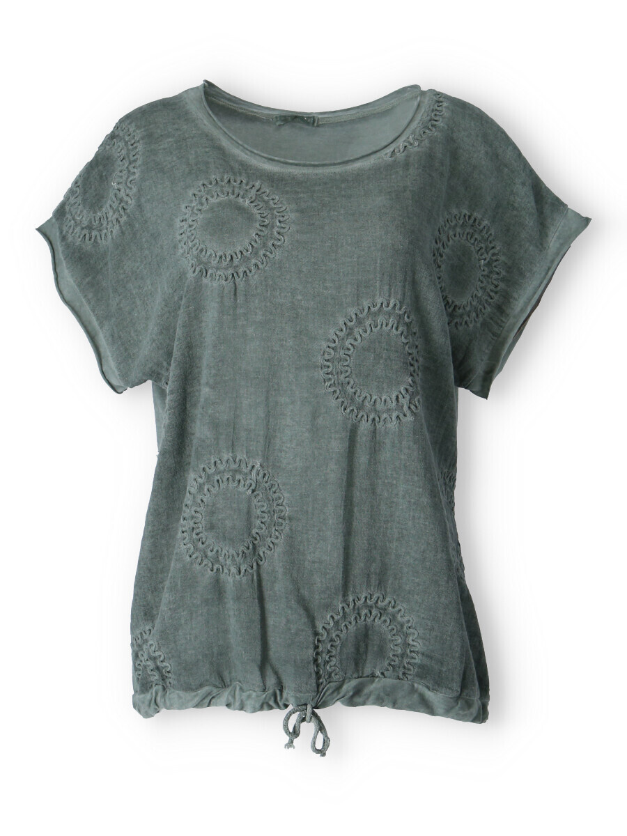 Dámská halenka s výšivkou na přední straně. Halenka/triko má krátký rukáv, kulatý výstřih a v oblasti pasu je možnost utažení na šňůrku. Vyrobeno v Itálii.