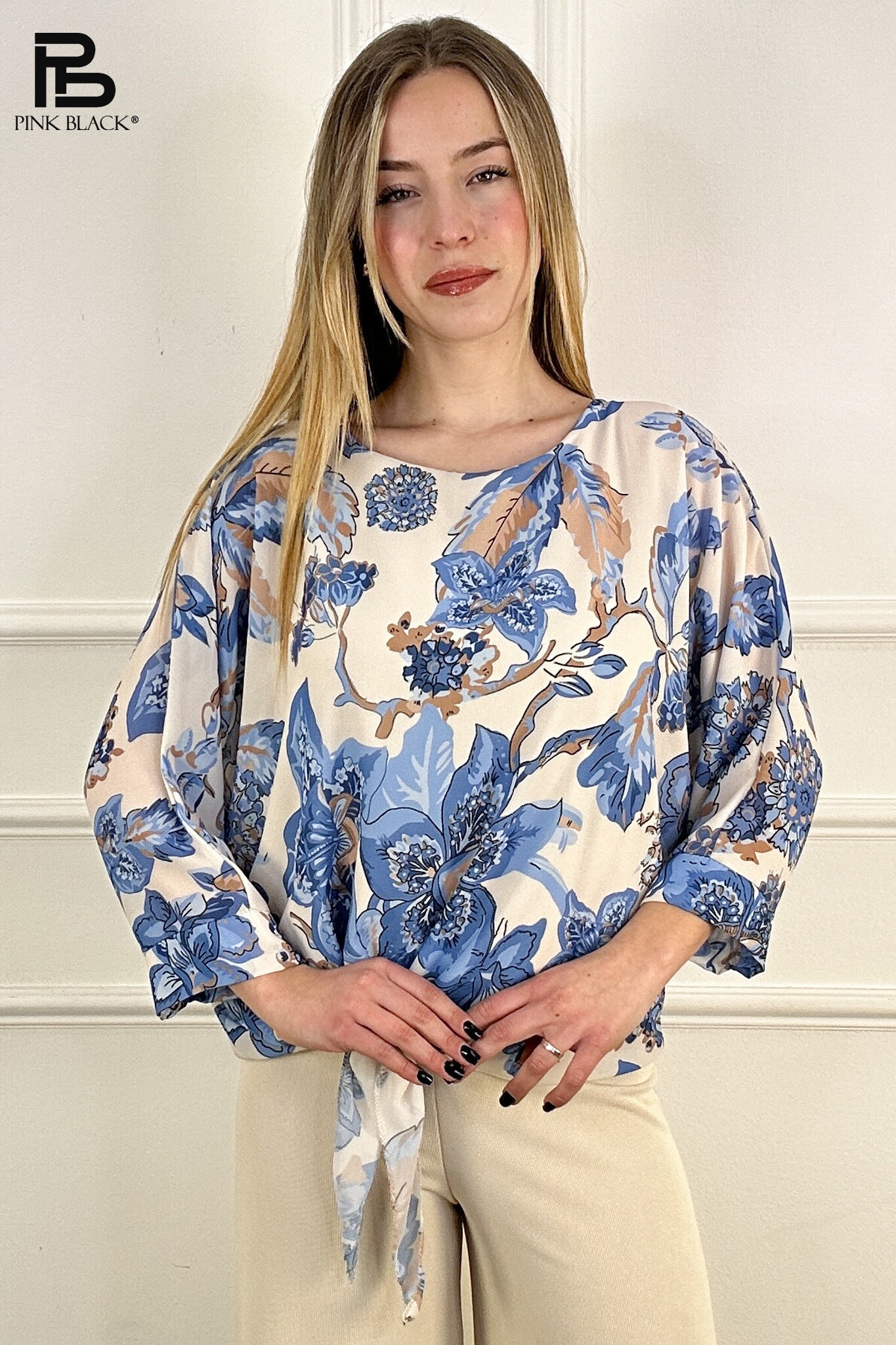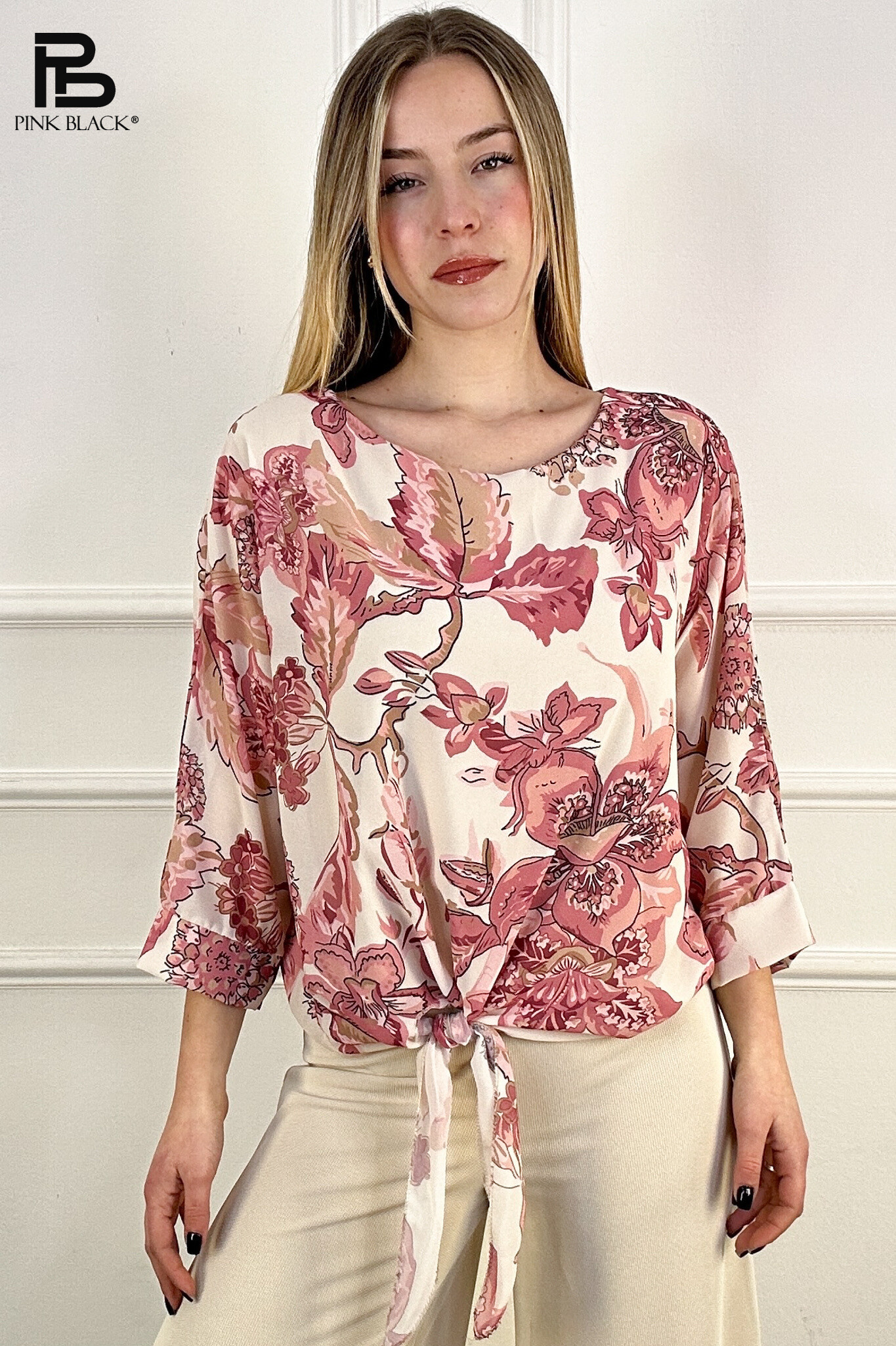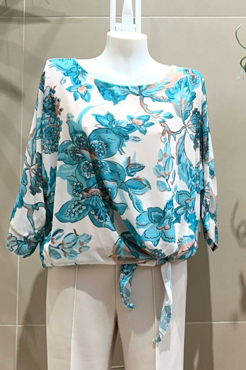 Módní halenka s potiskem, 3/4 rukáv, ve spodní částí s vázáním. Dovoz z Itálie.