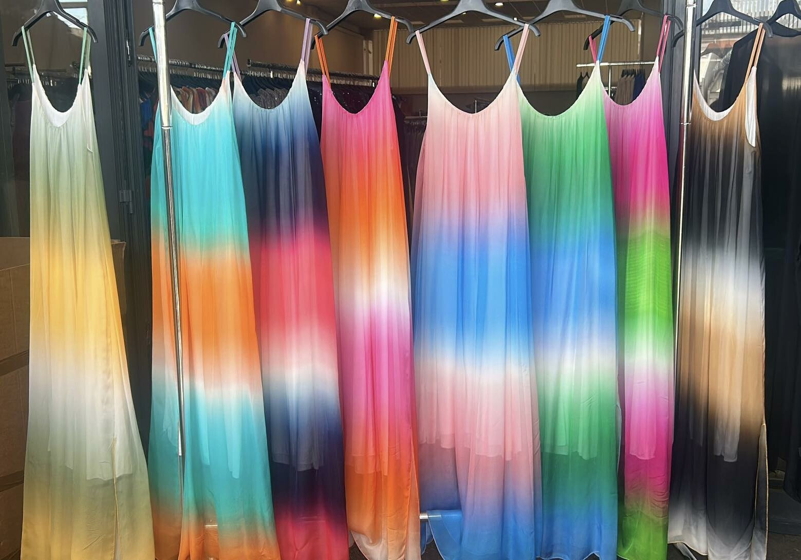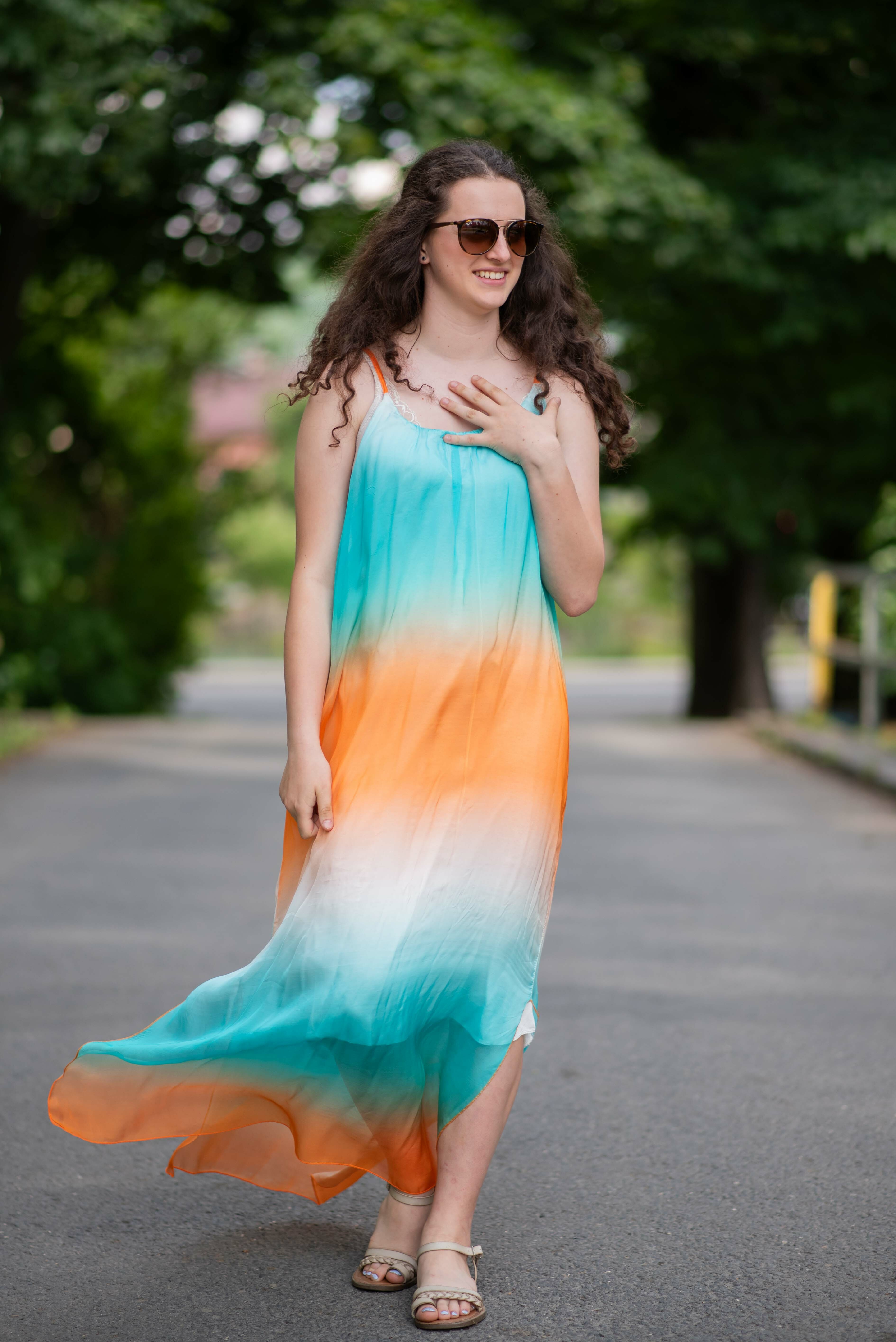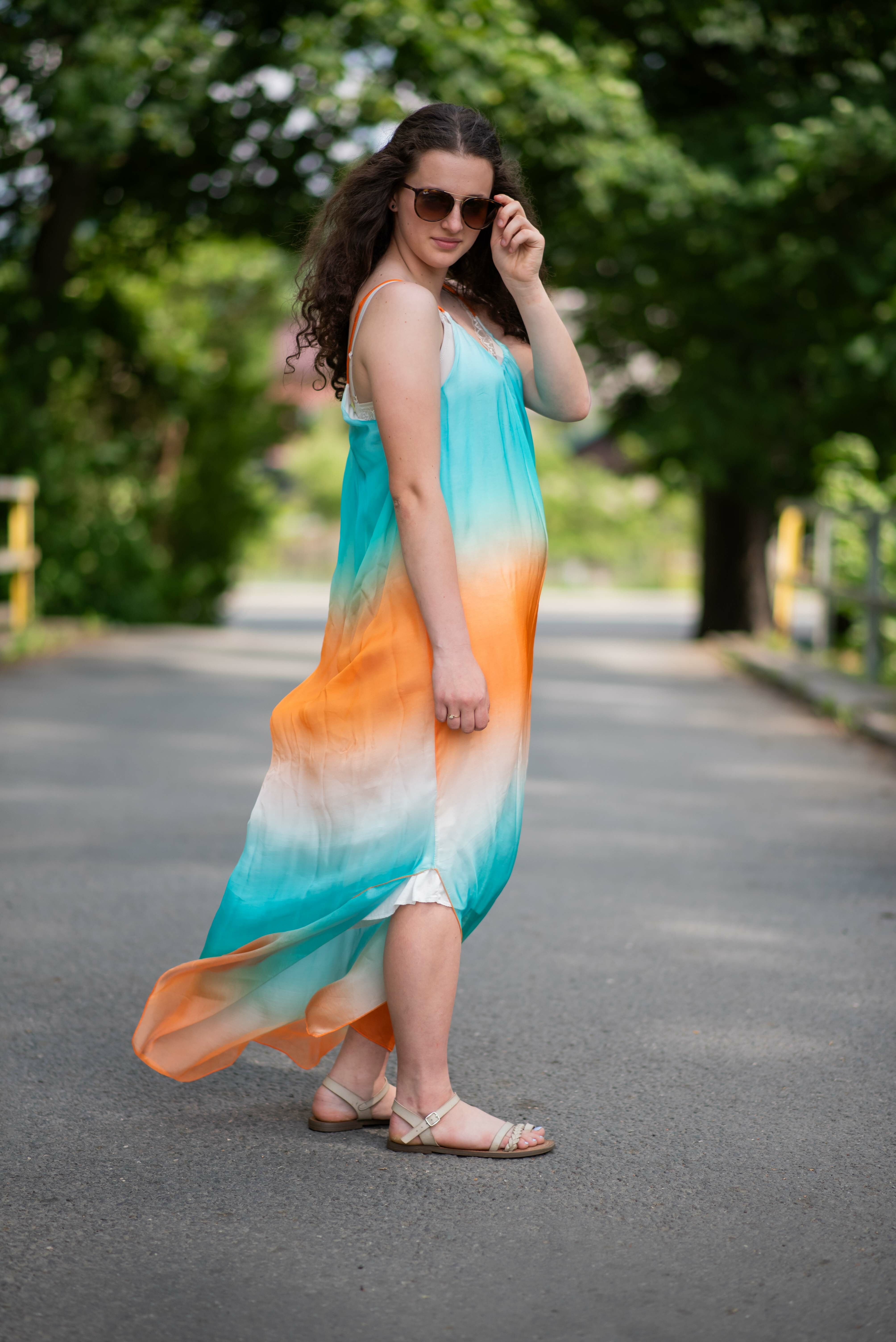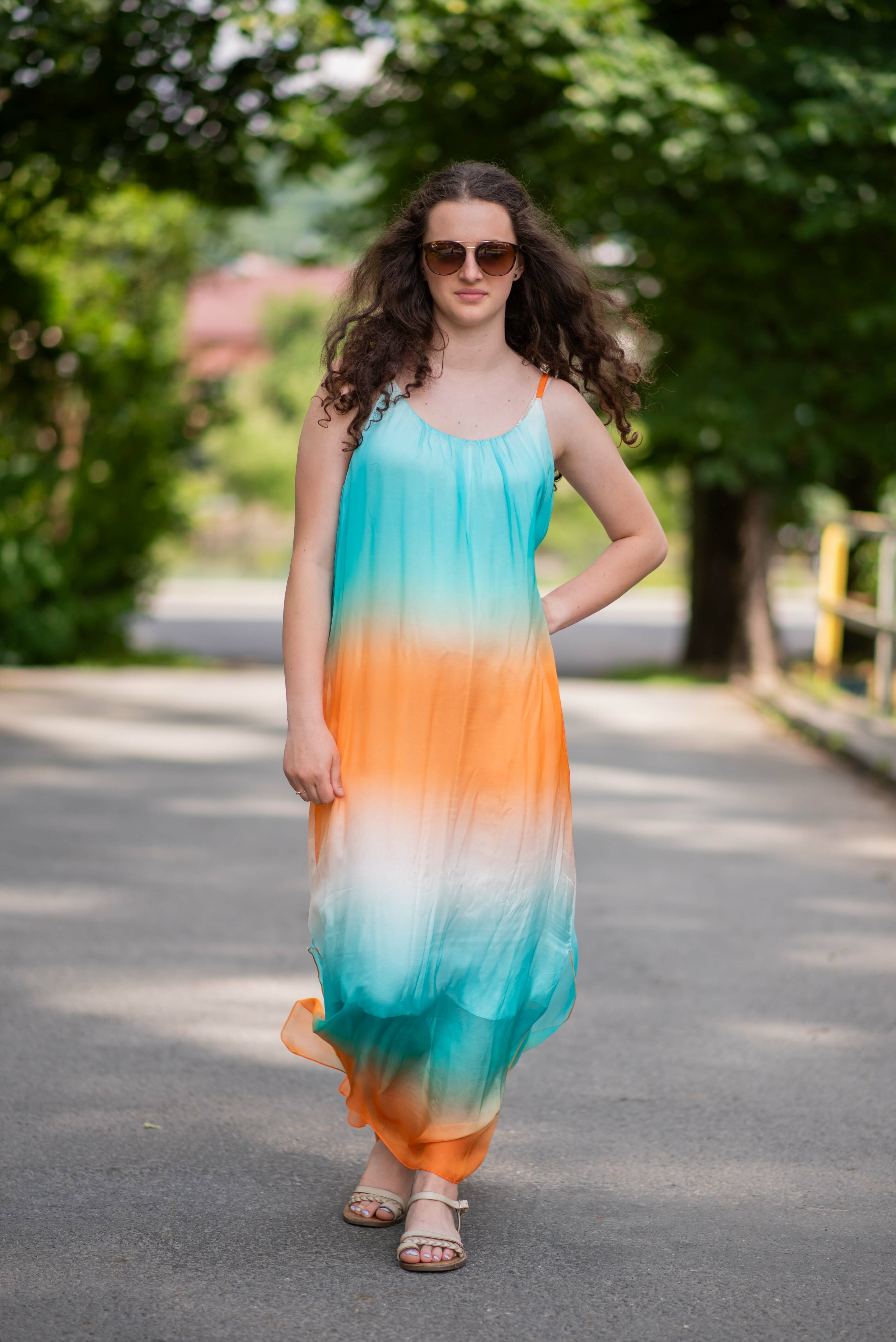 Letní hedvábné šaty ombré na tenké ramínka s regulací. Šaty jsou dlouhé, po stranách mají rozparky. Ideální kousek pro horké letní dny. (Barvy vybírejte podle vrchní části v oblasti hrudníku).