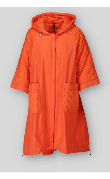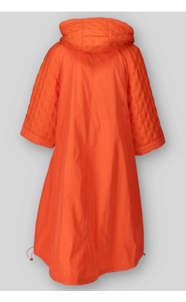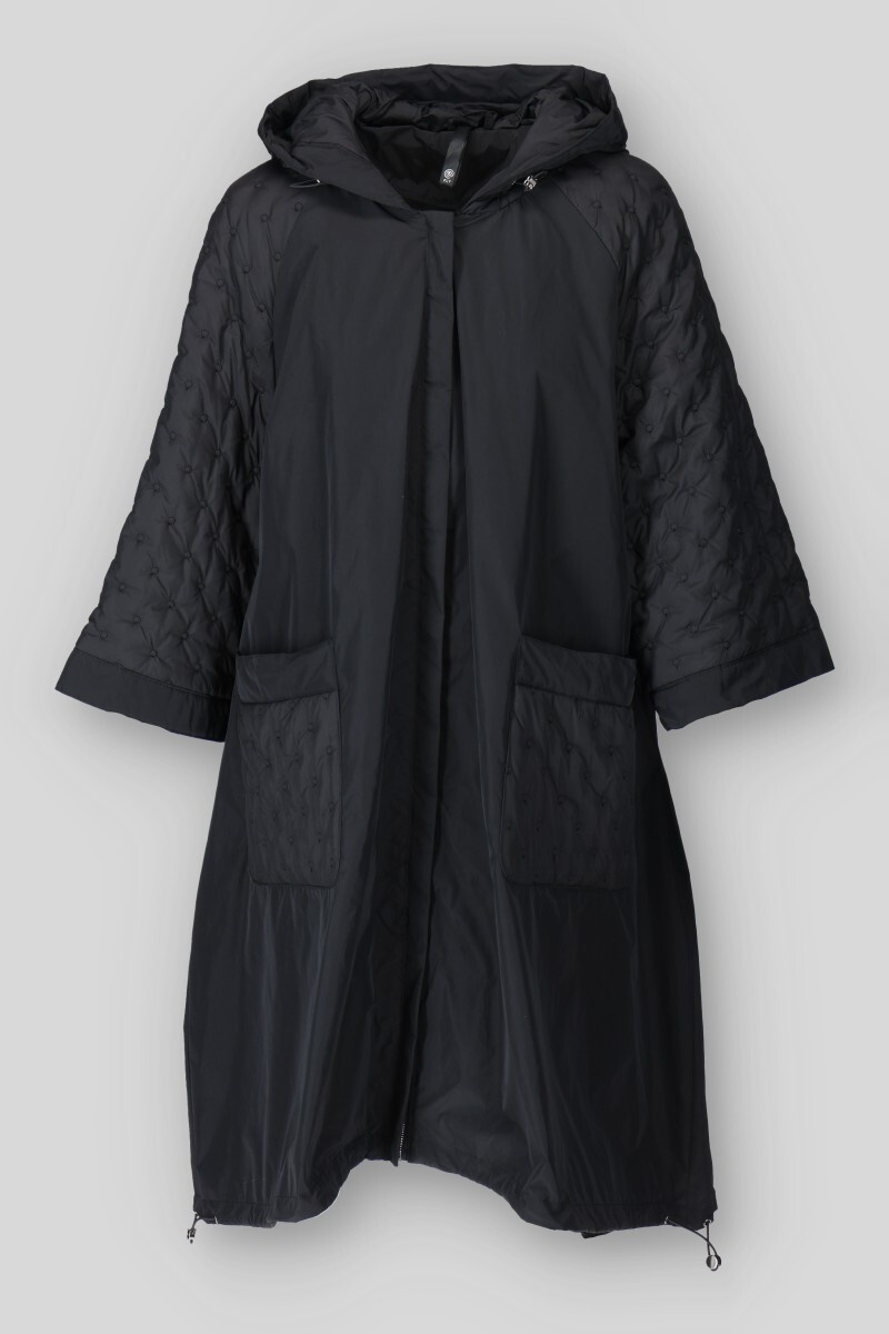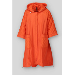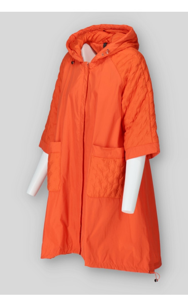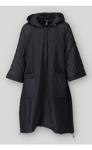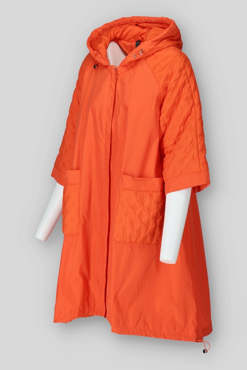 Přechodový dlouhý kabátek s kapucí. Kabátek má 3/4 rukáv, zapínání na zip a regulaci na utažení v kapucí a ve spodní části kabátu.