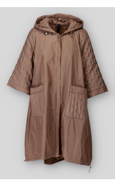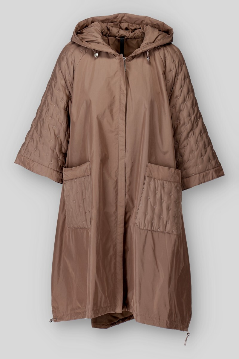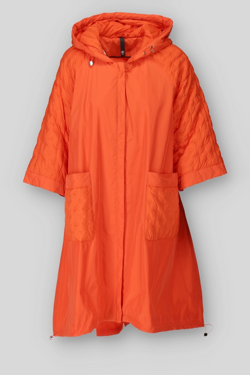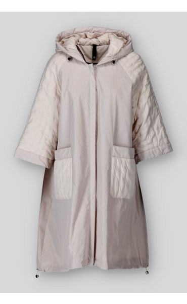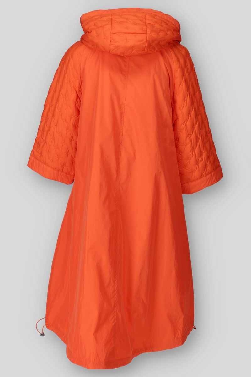 Přechodový dlouhý kabátek s kapucí. Kabátek má 3/4 rukáv, zapínání na zip a regulaci na utažení v kapucí a ve spodní části kabátu.