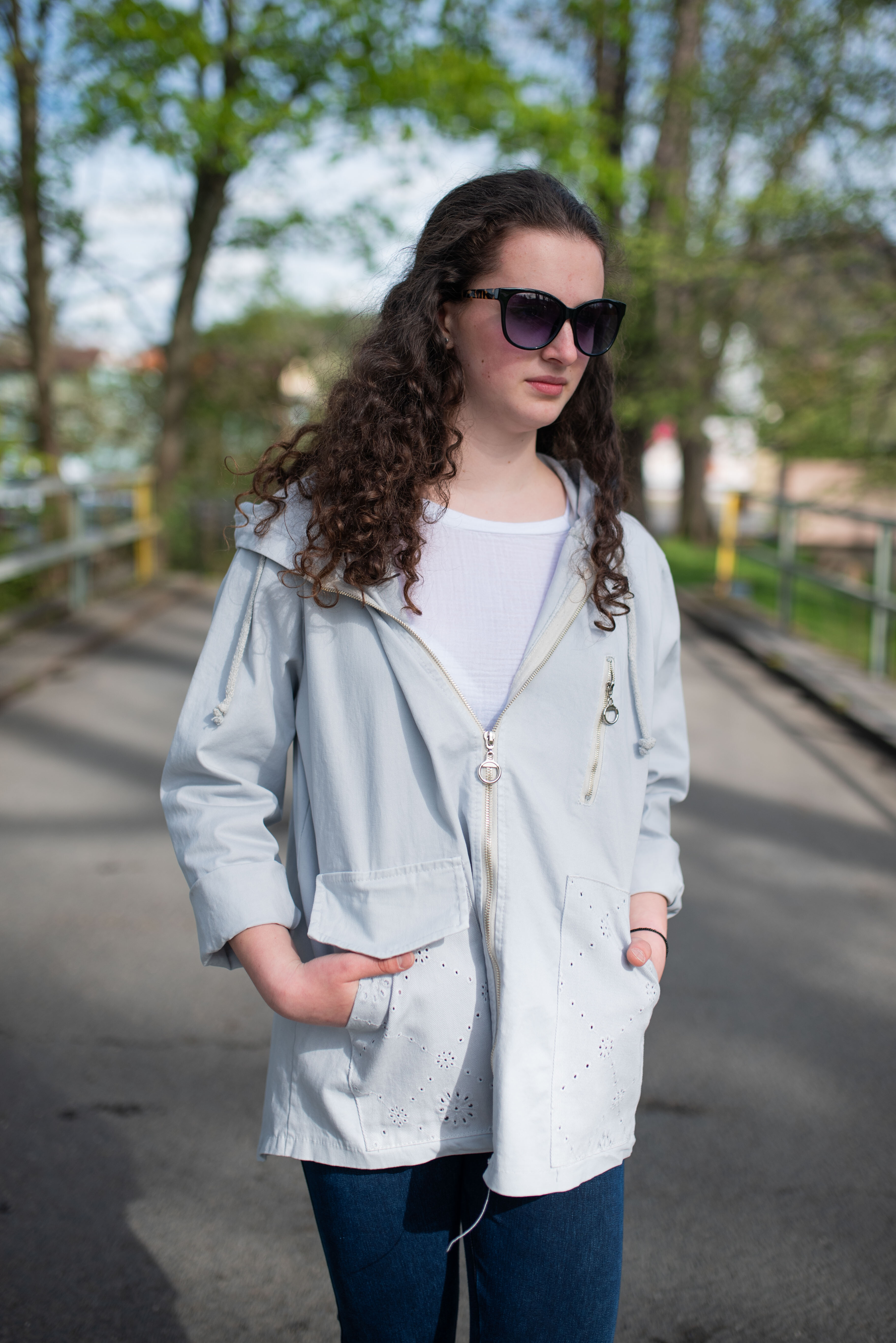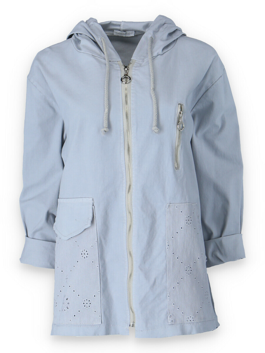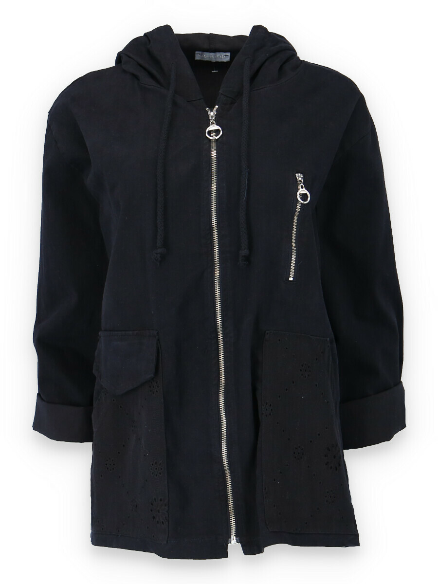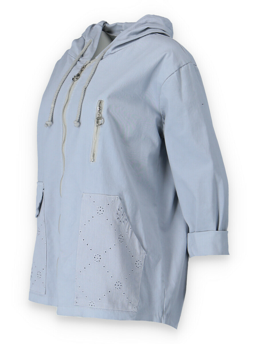 Lehká bavlněná jarní bunda/kabátek, s kapucí, přední kapsy, výšivky na kapsách