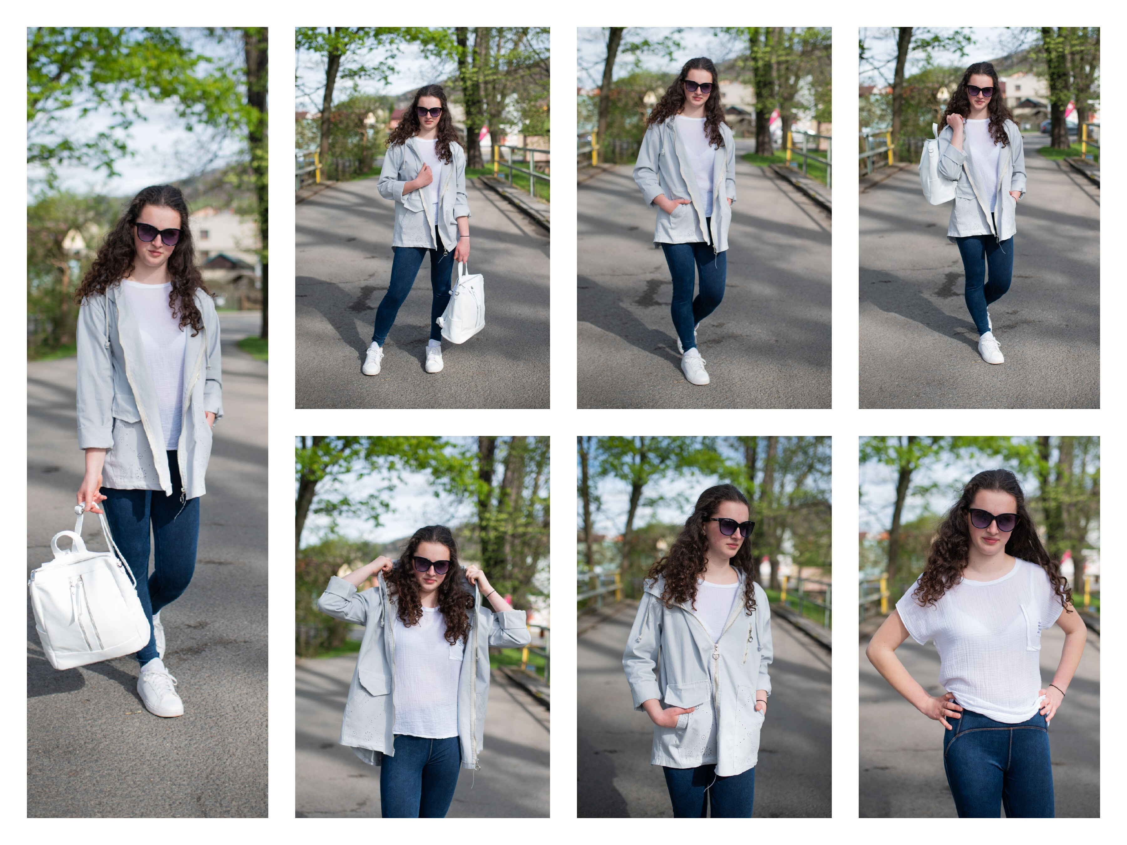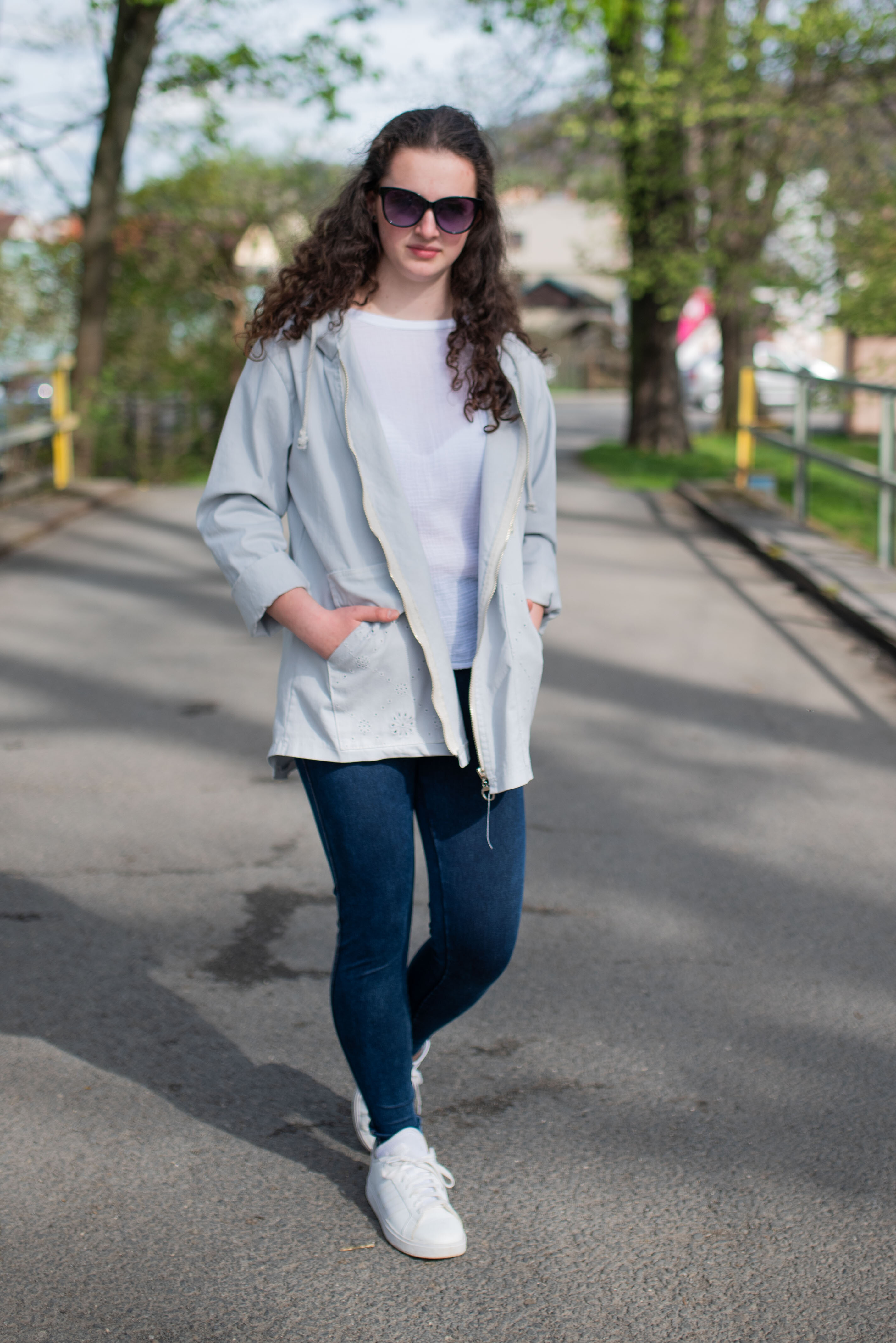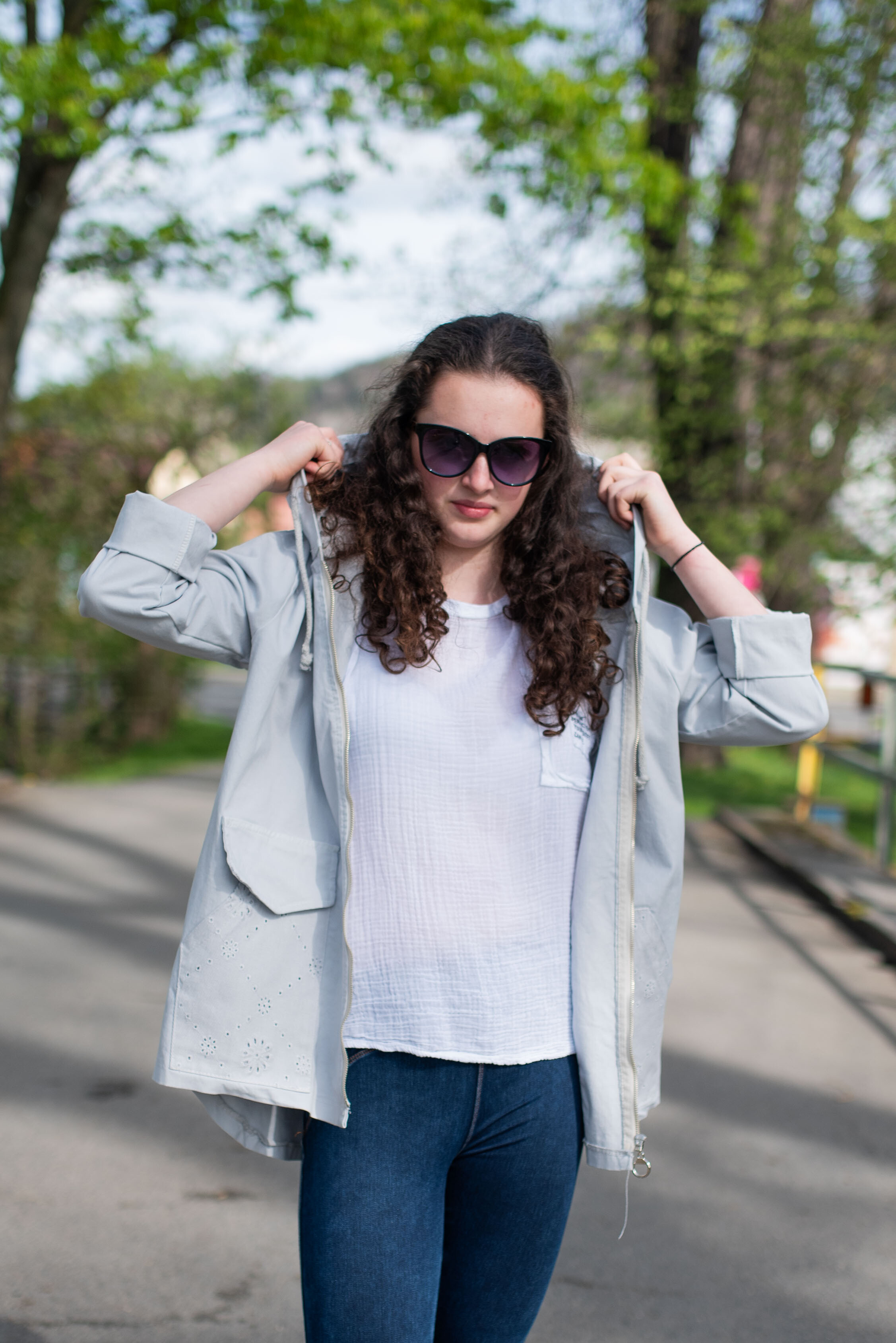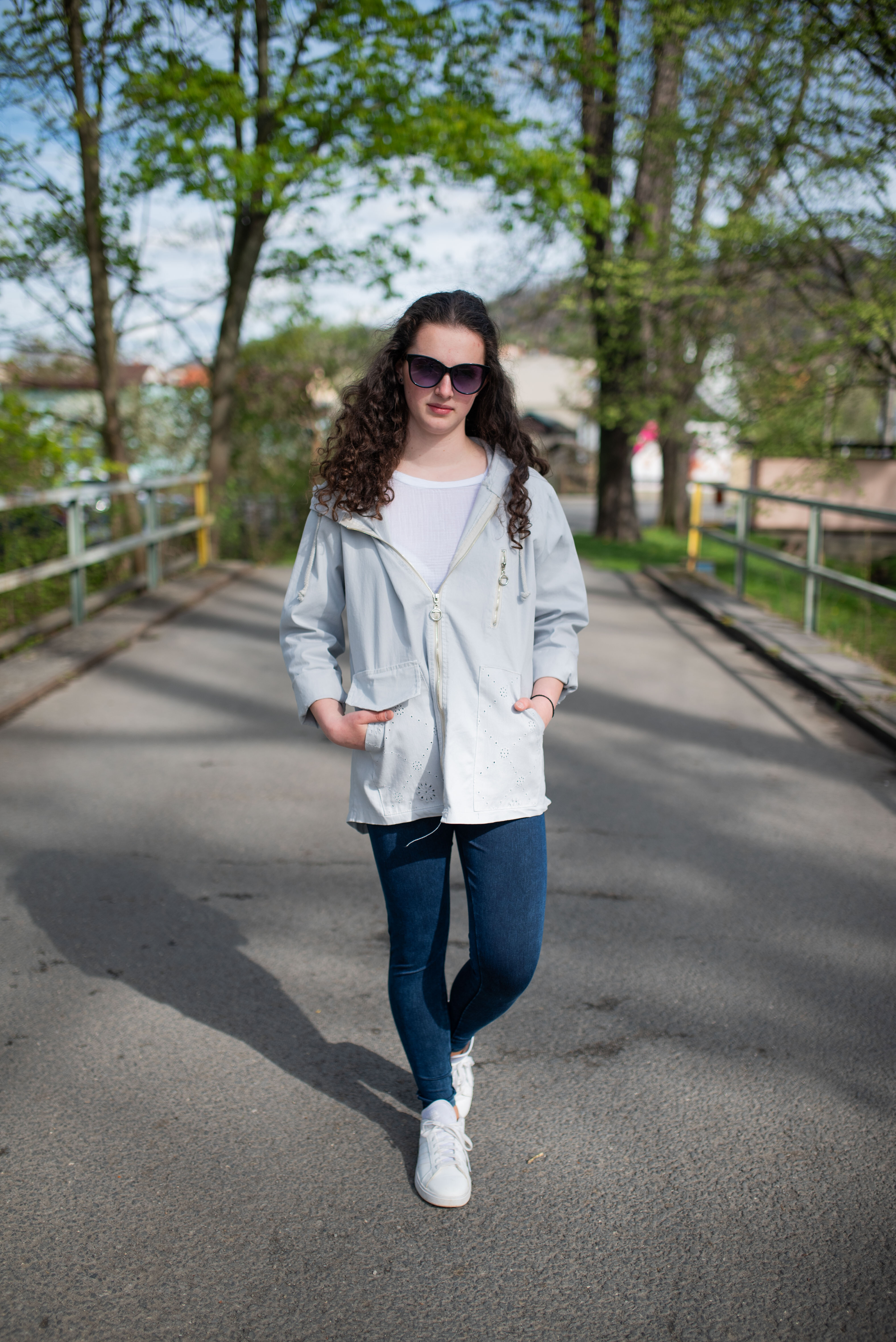 Lehká bavlněná jarní bunda/kabátek, s kapucí, přední kapsy, výšivky na kapsách