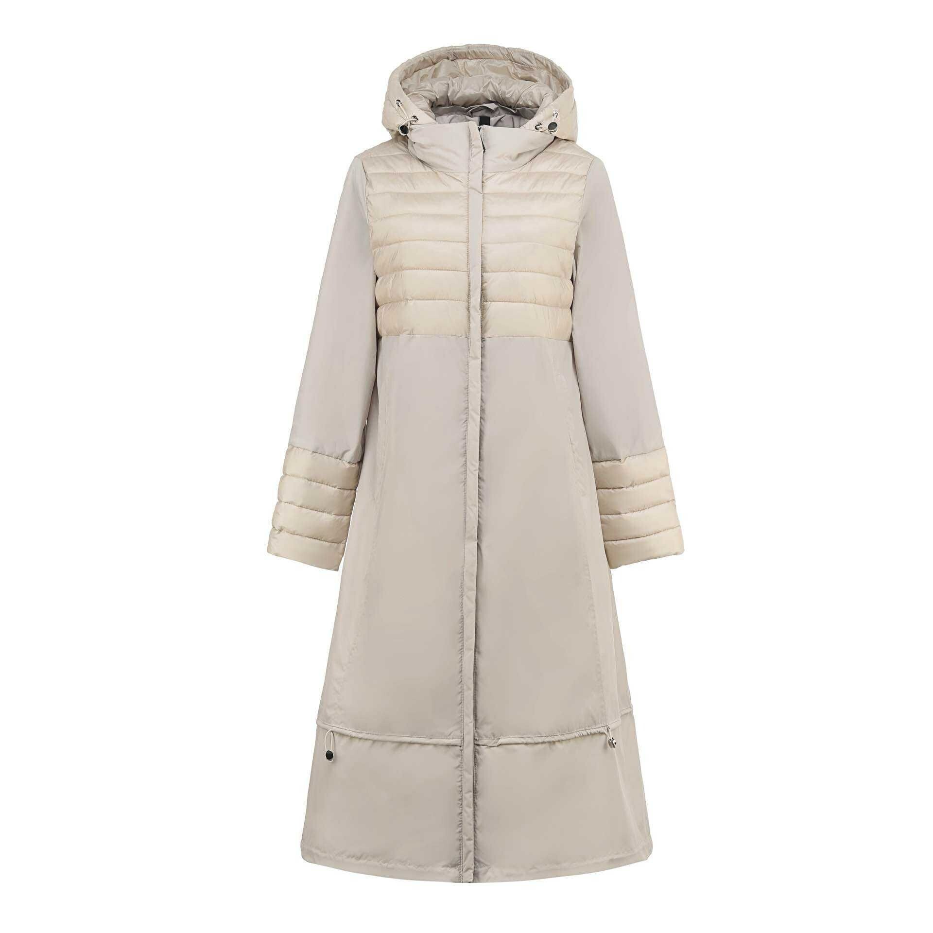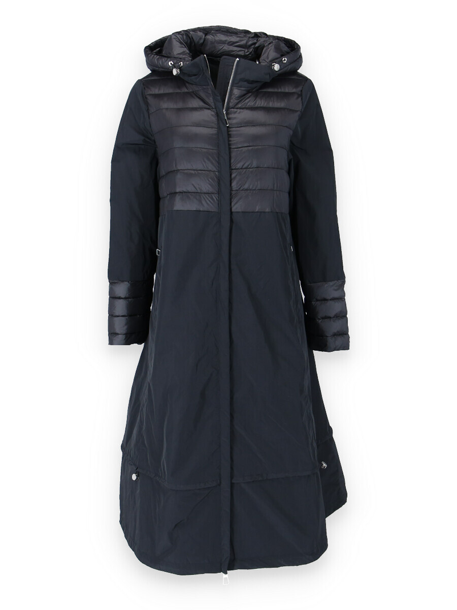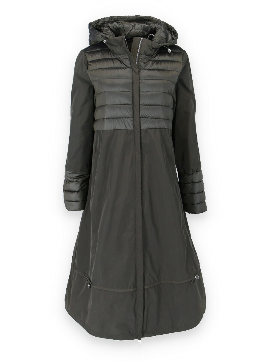 Dlouhý kabátek s odnímatelnou kapucí na zip. Kabátek na předení straně kapsy a ve spodní části regulaci na šňůrku.