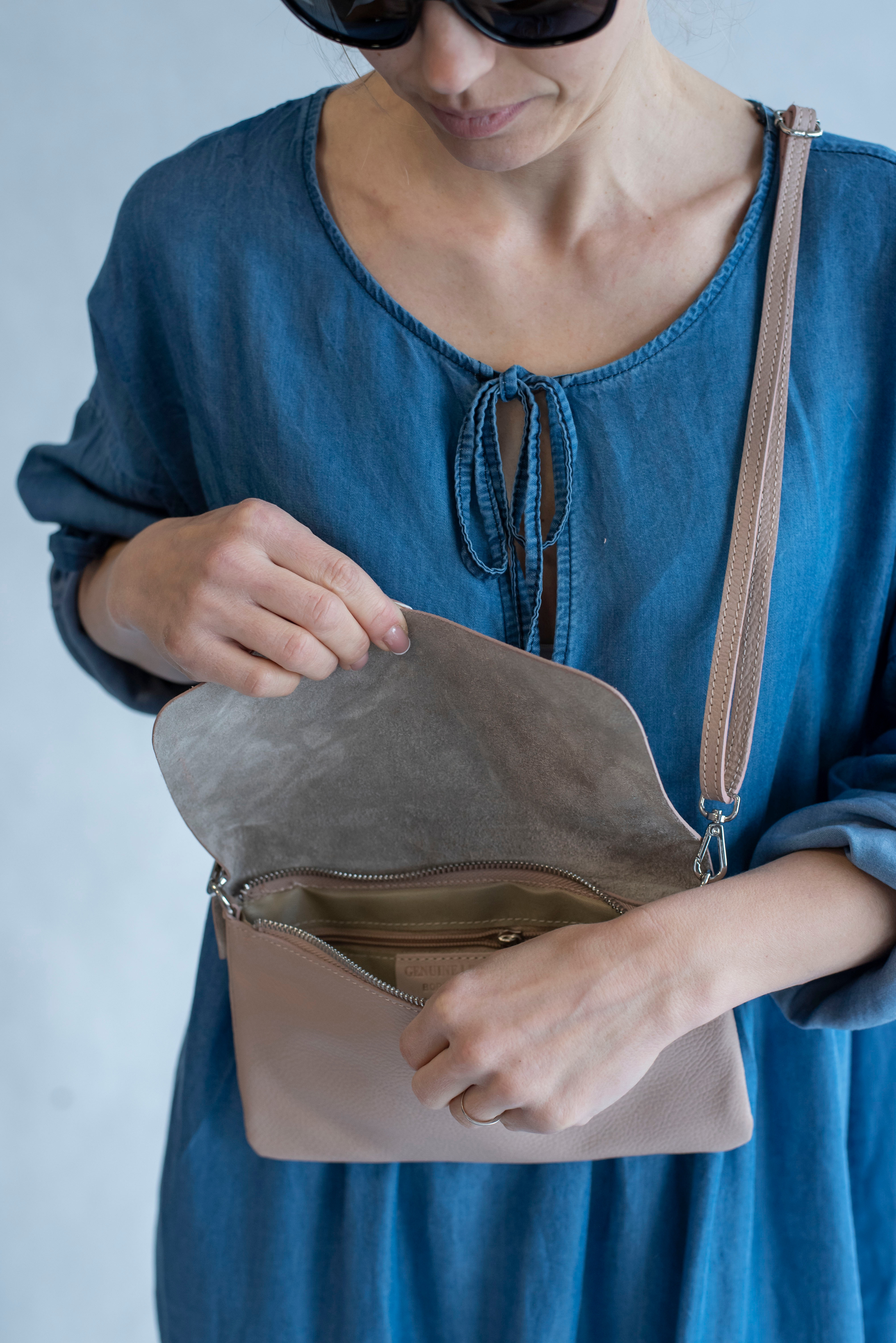 Dámská malá kožená kabelka typu psaní, s klopou, vnitřní uzávěr na zip s další vnitřní uzavíratelnou kapsou na zip
