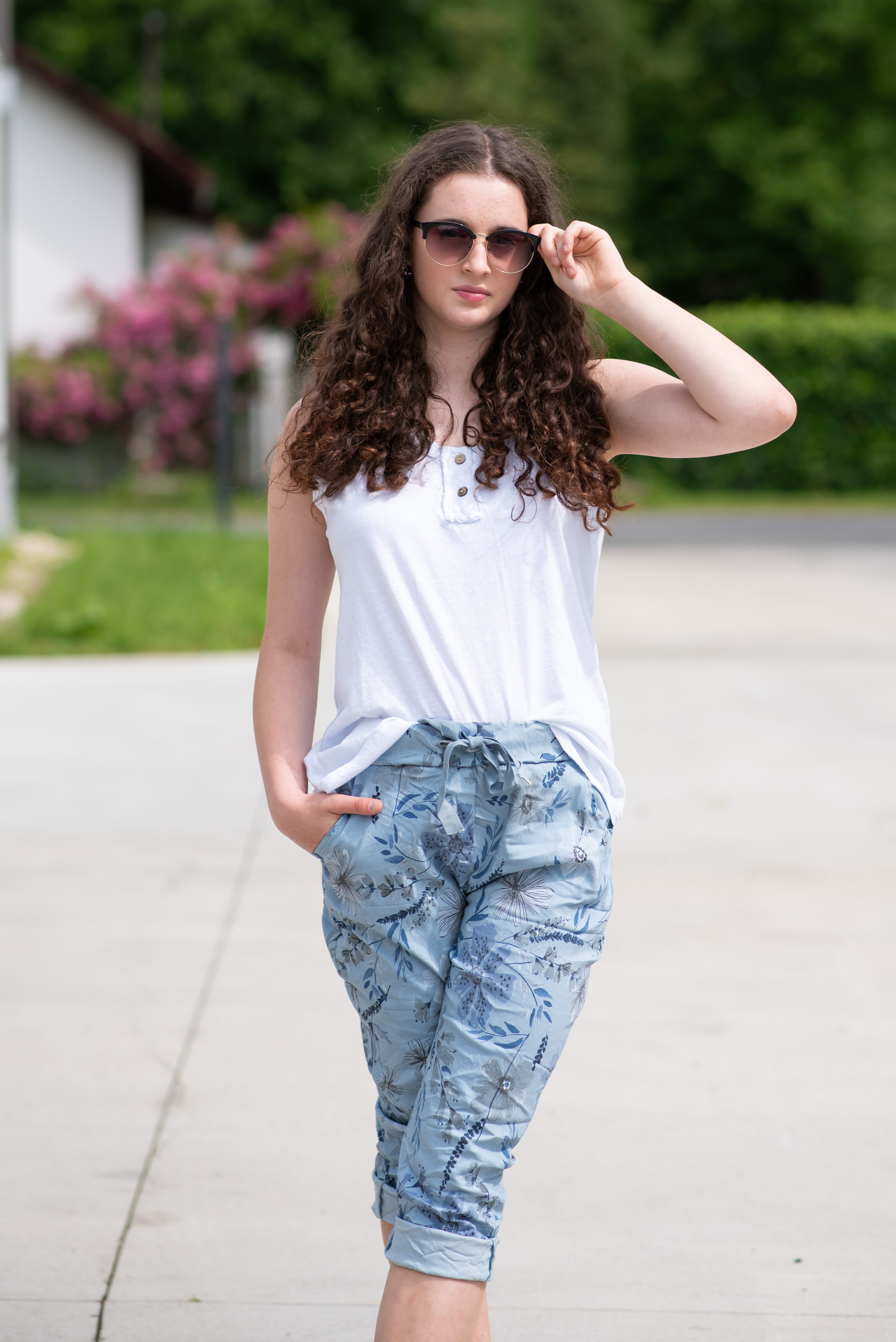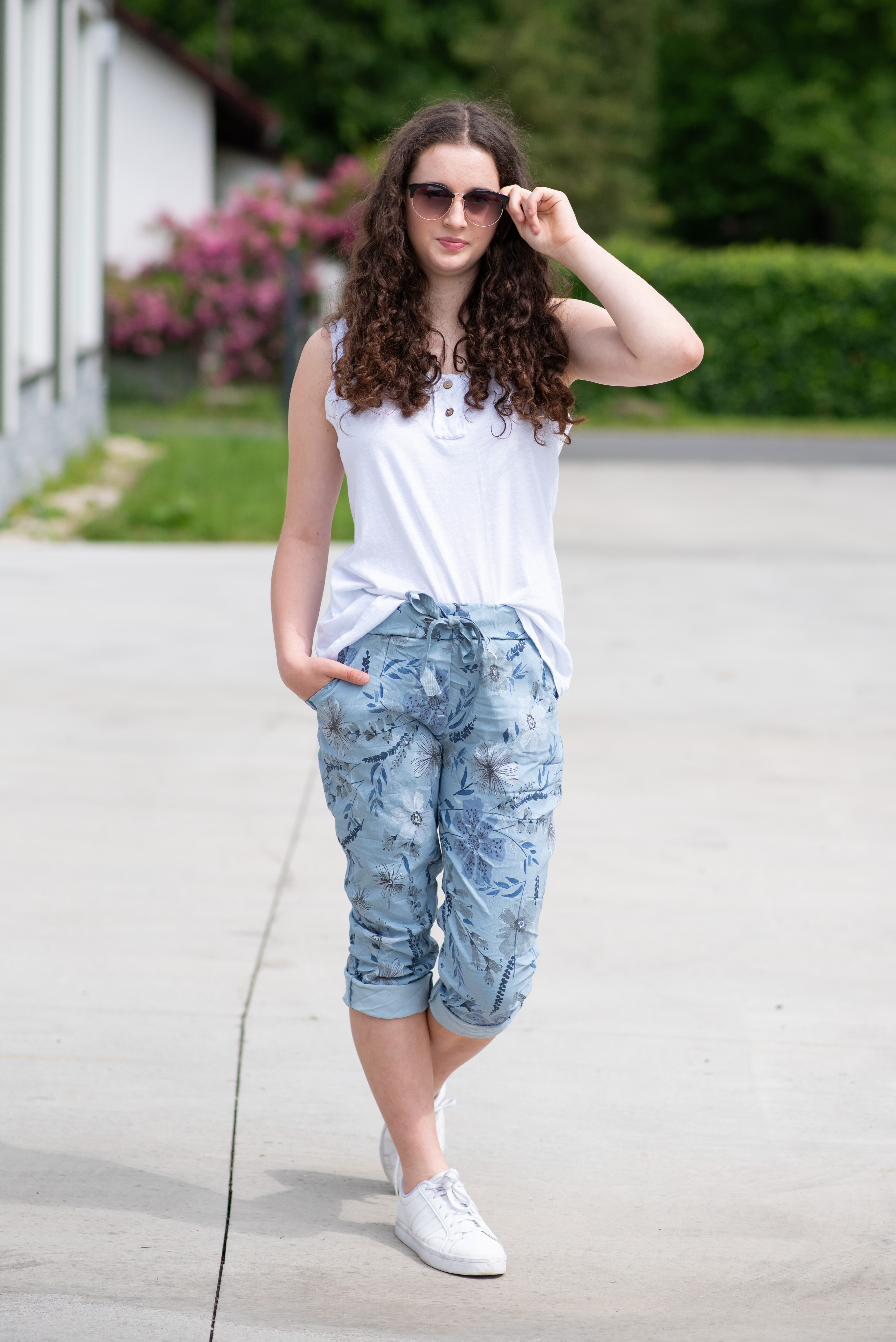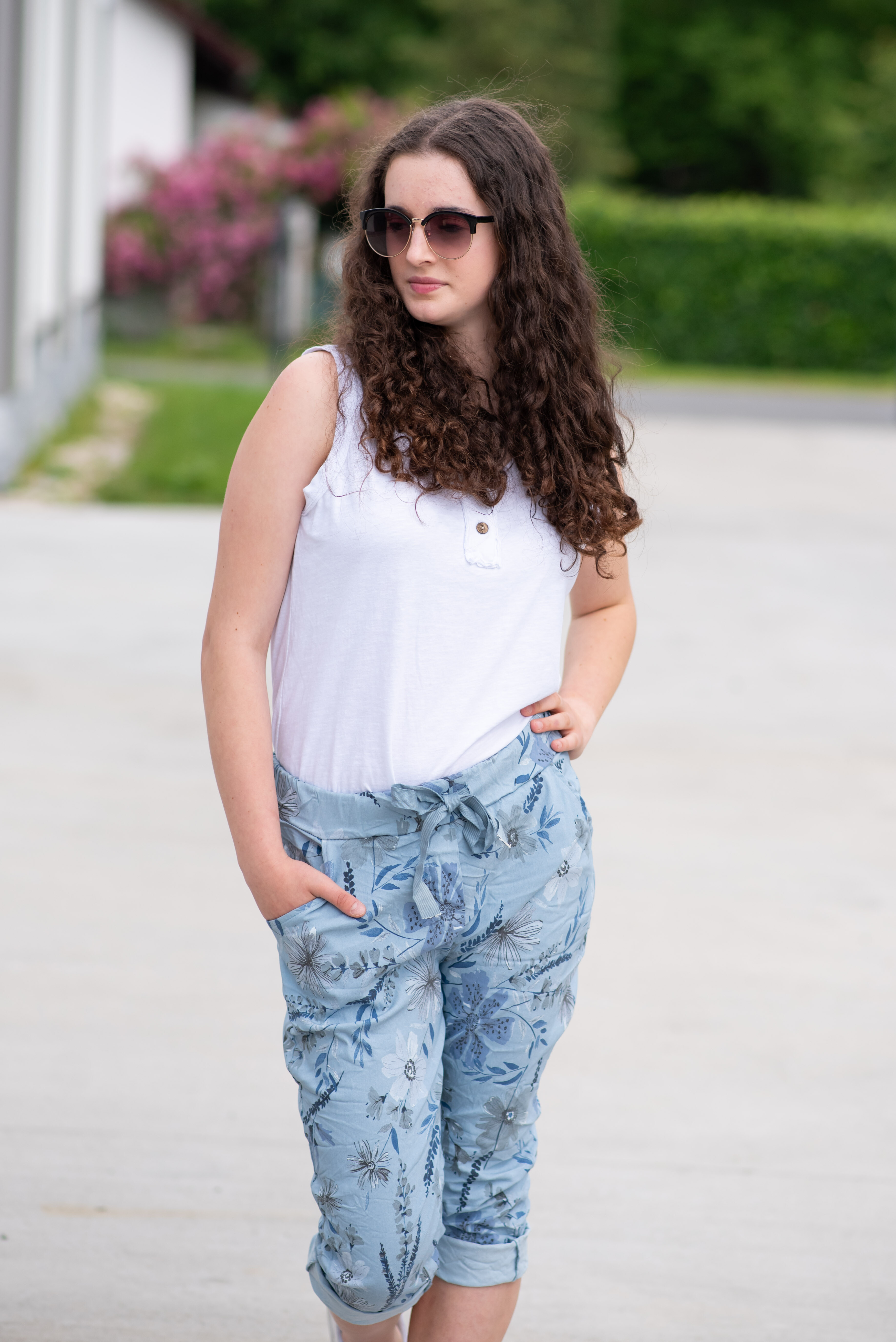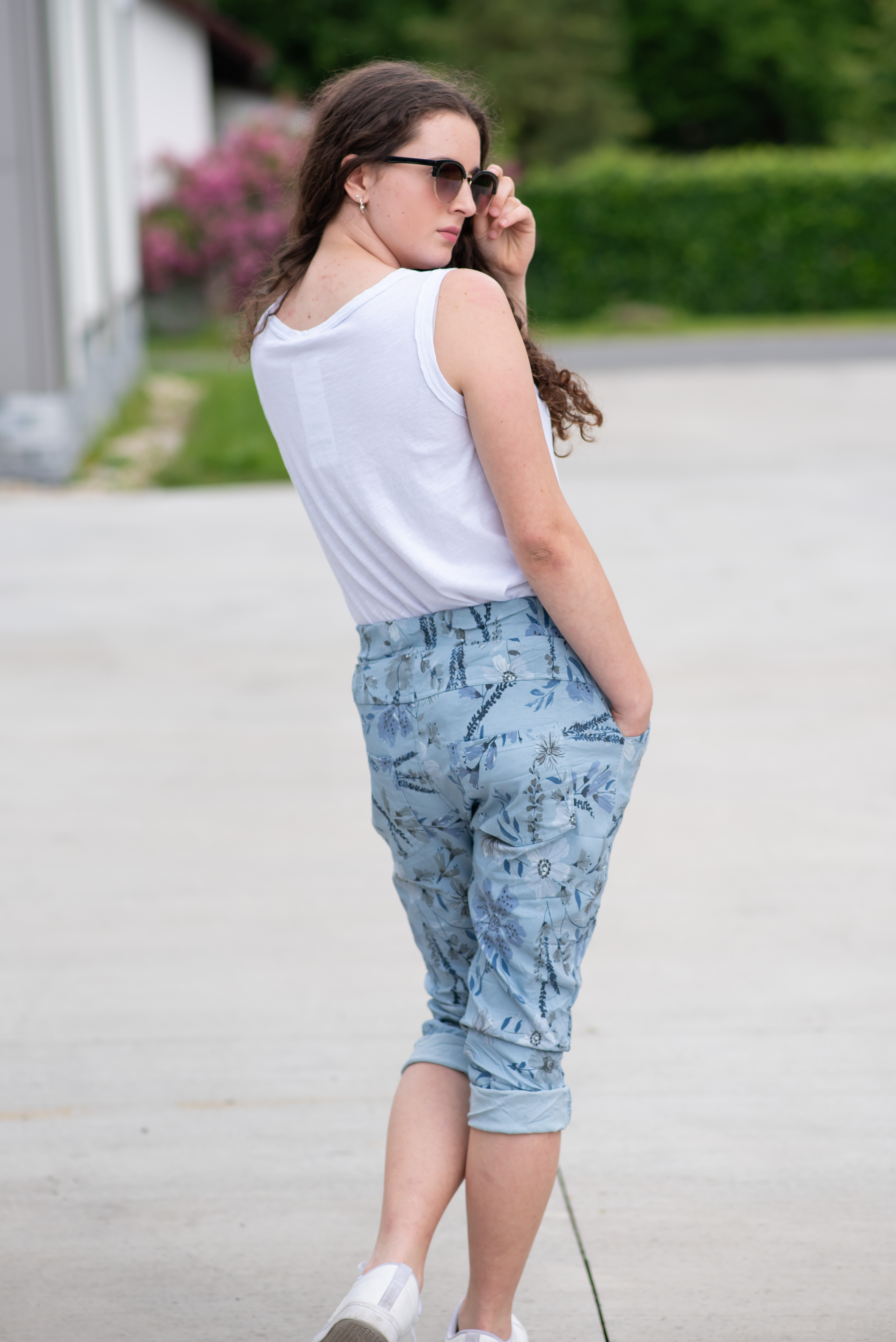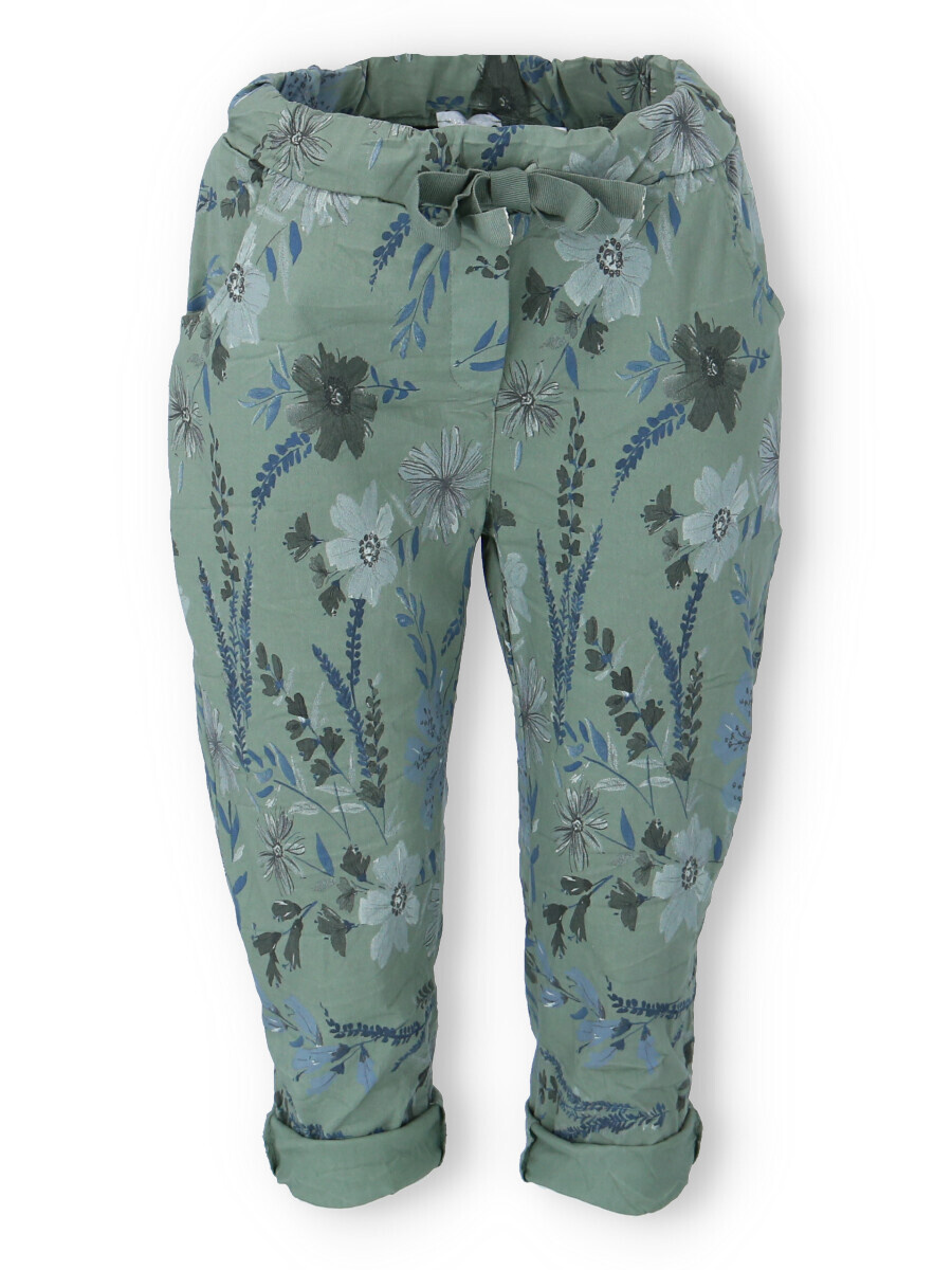 Trendy volnočasové capri kalhoty s potiskem do gumy. Capri všité kapsy.