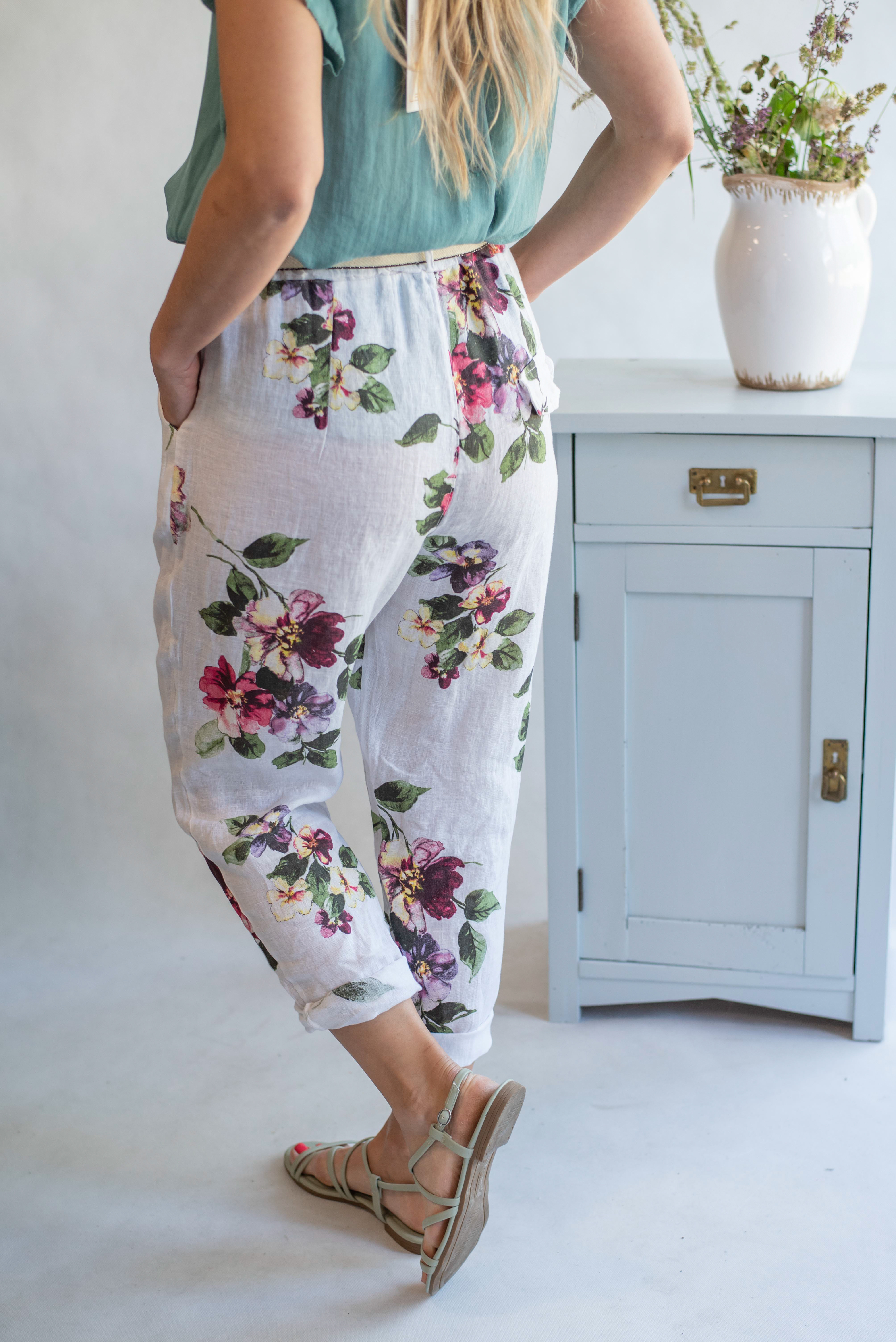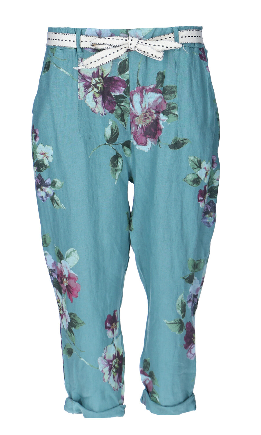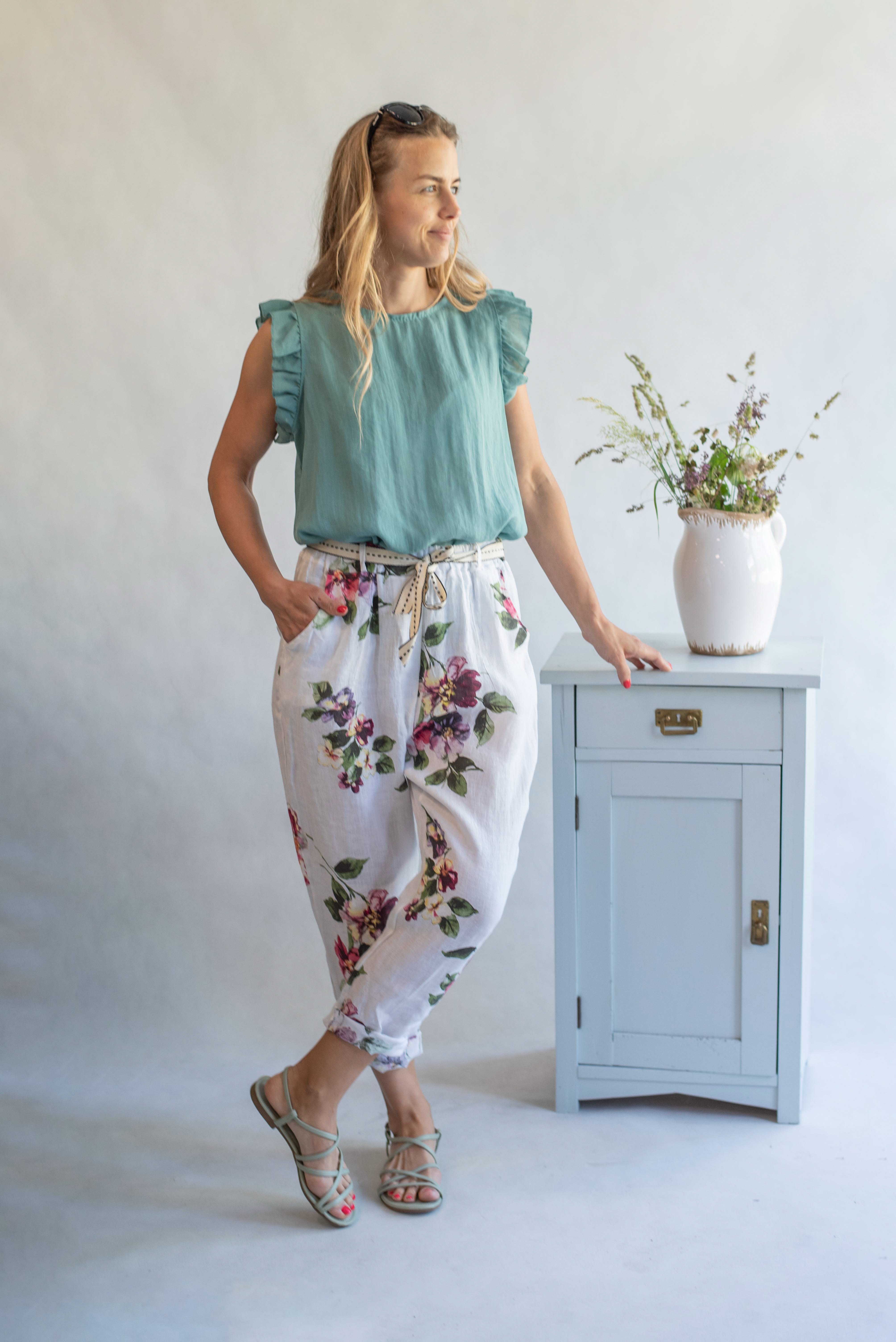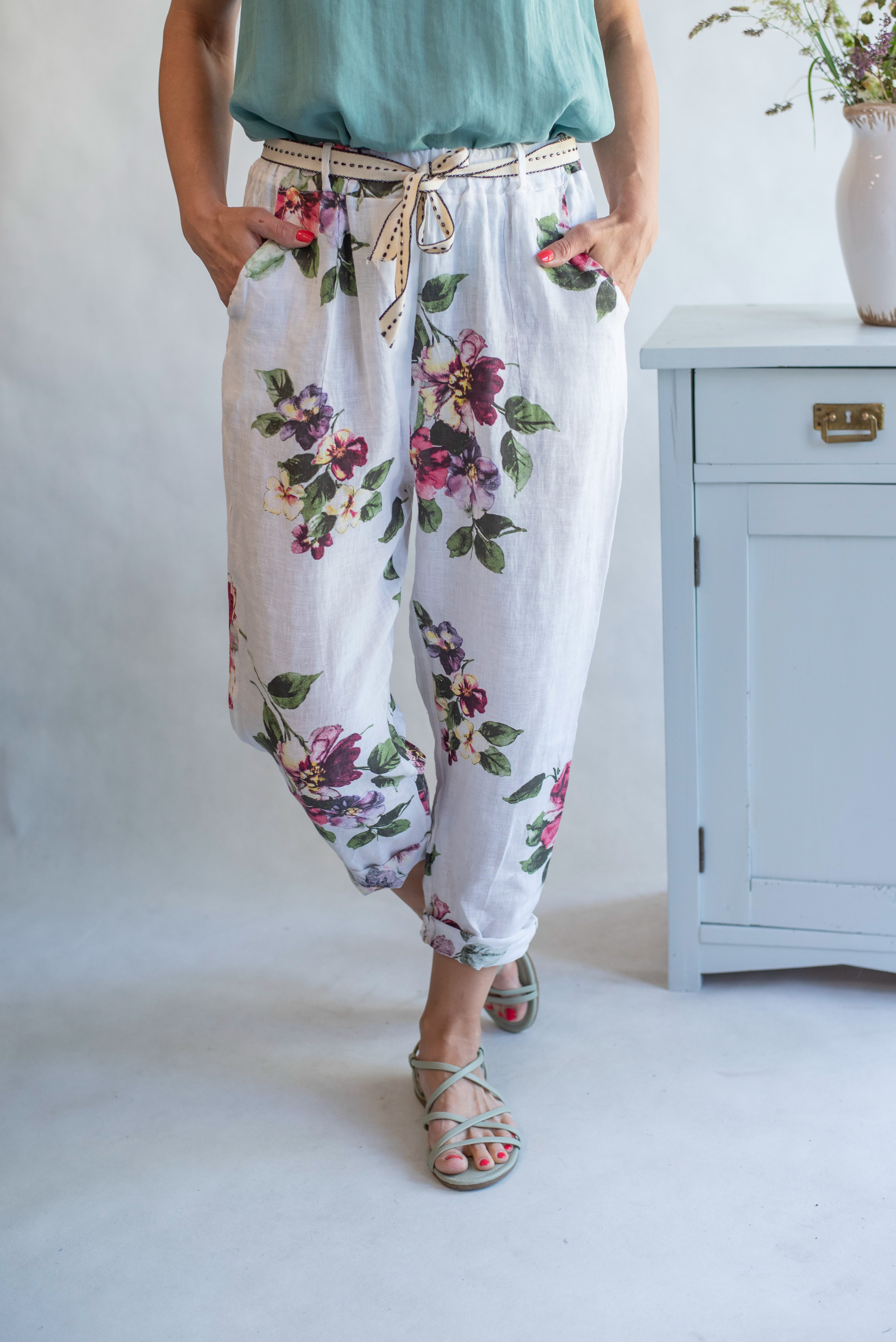 Módní letní capri kalhoty lněné s pasem do gumy.