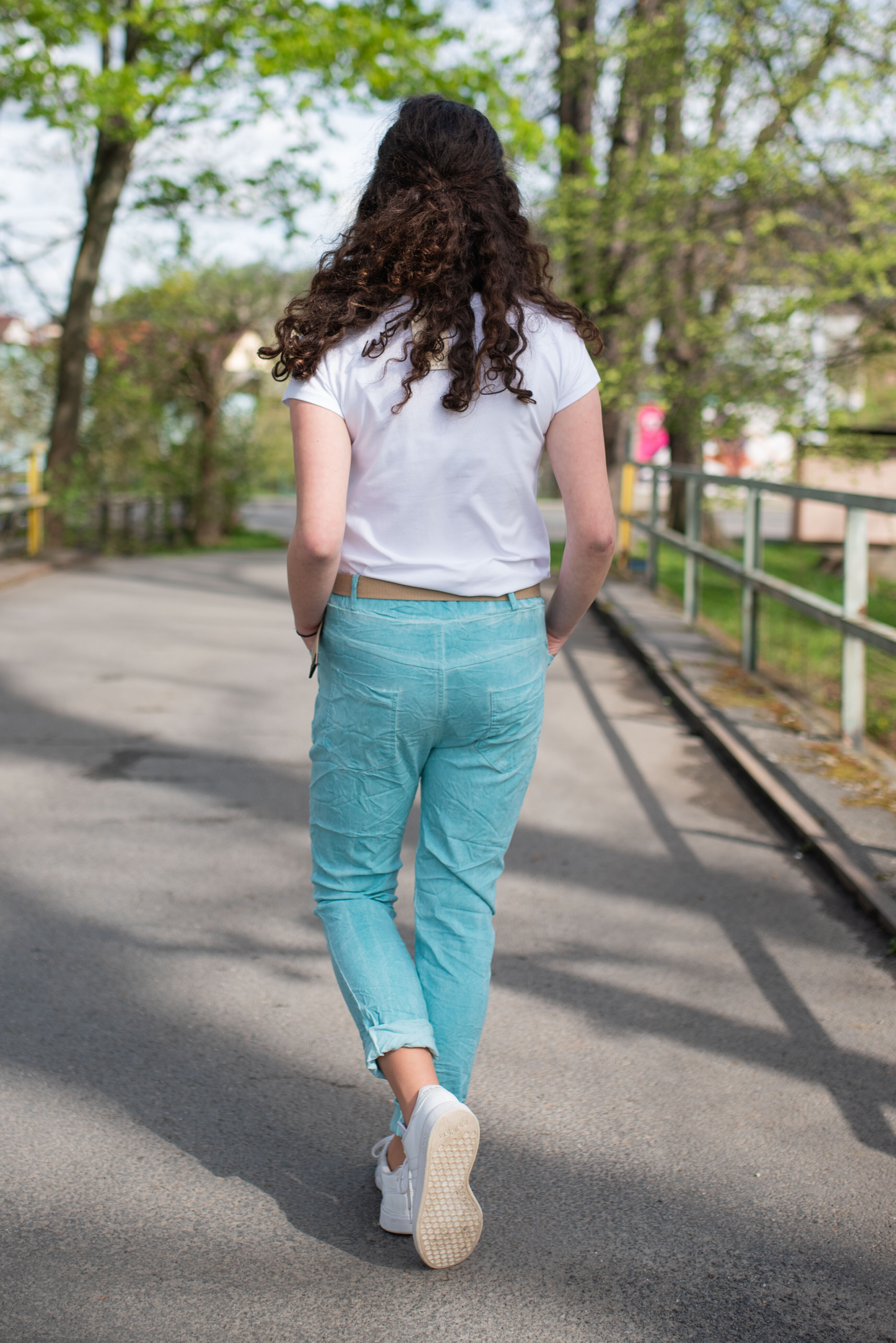 Módní kalhoty pohodlného střihu, elastický pas doplněný páskem, postranní kapsy