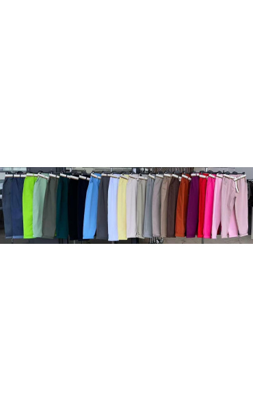 Dámské kalhoty v pase do gumy, doplněny stylovým páskem. Kalhoty mají po stranách všité kapsy.