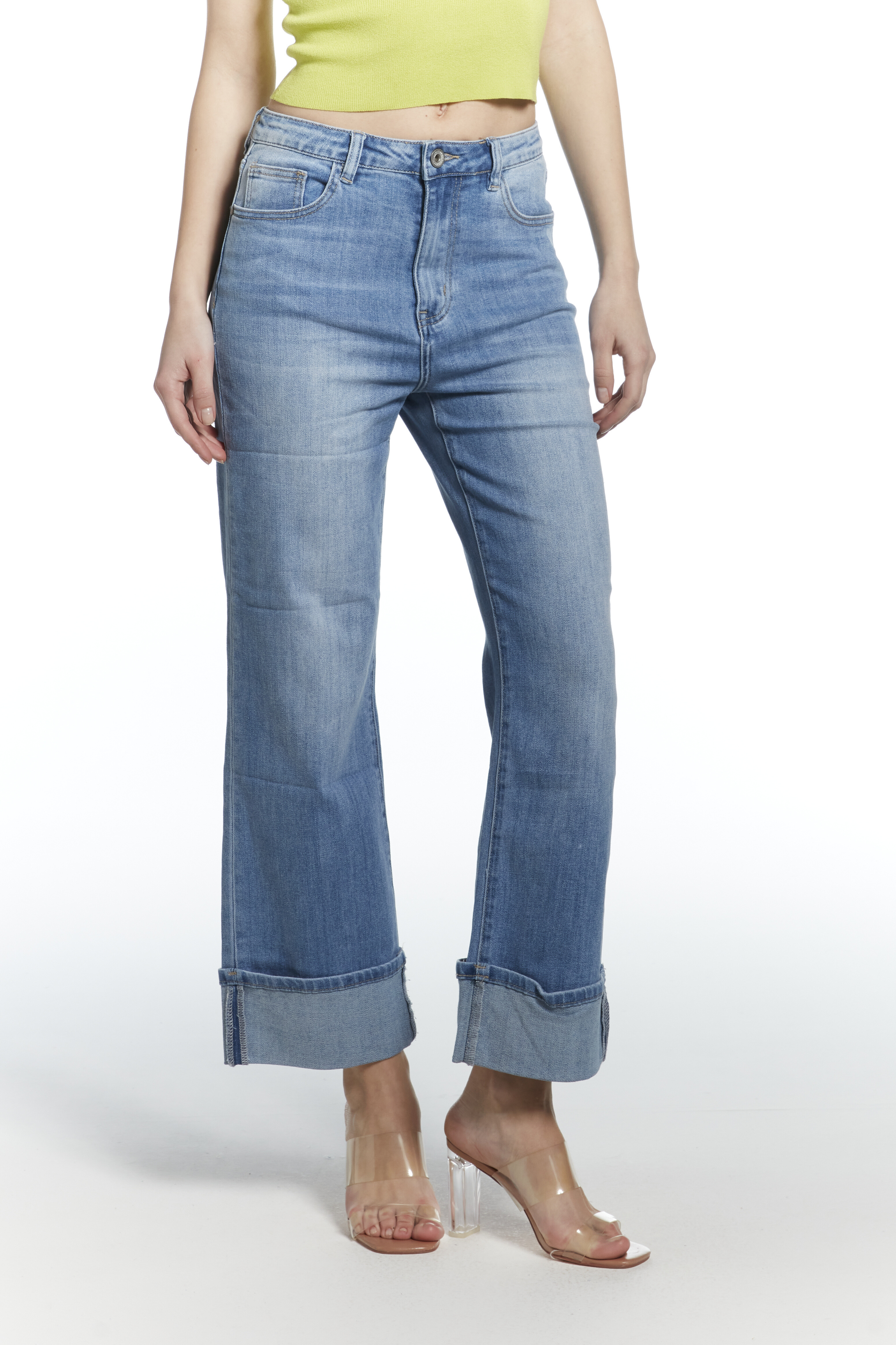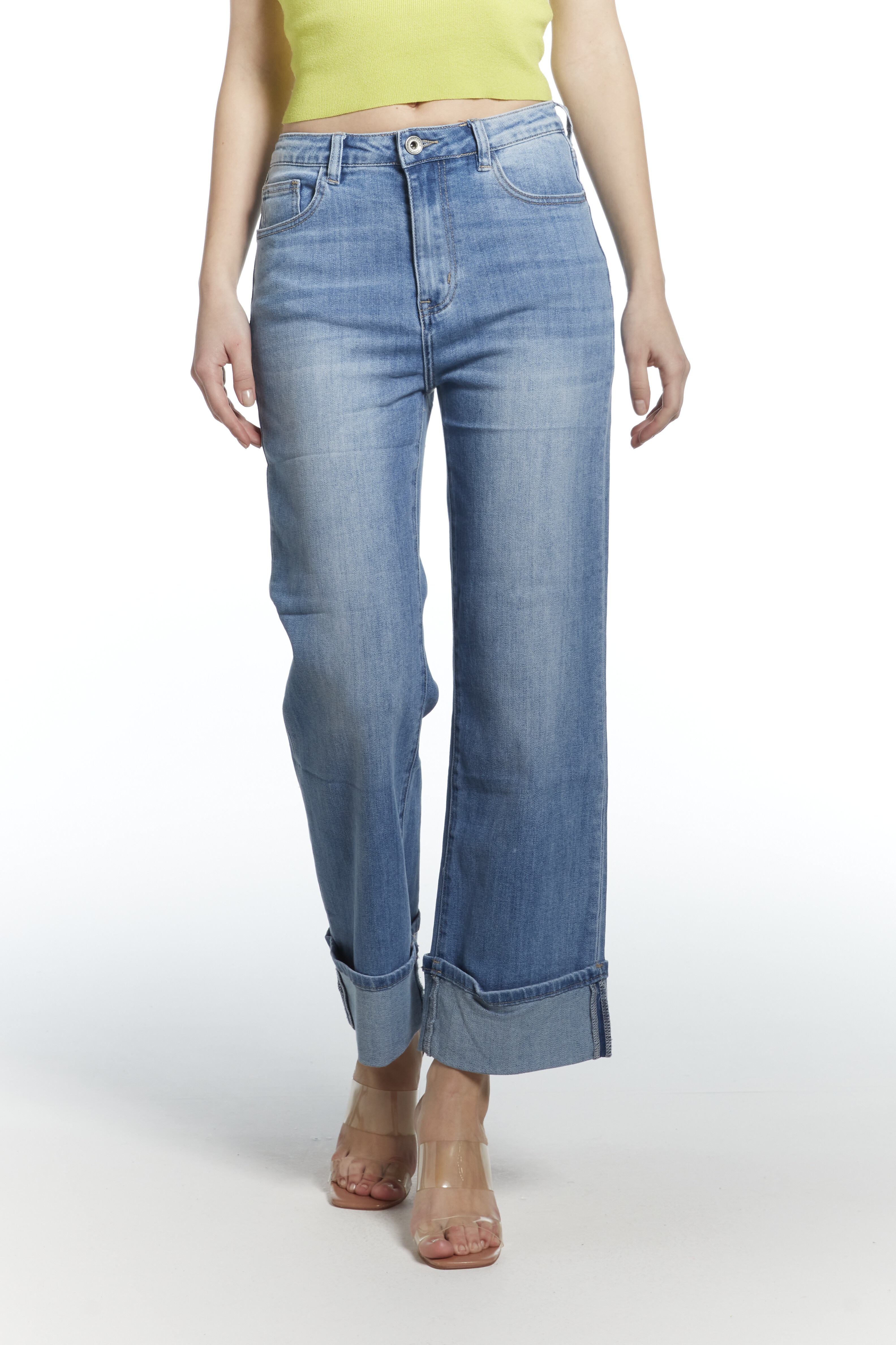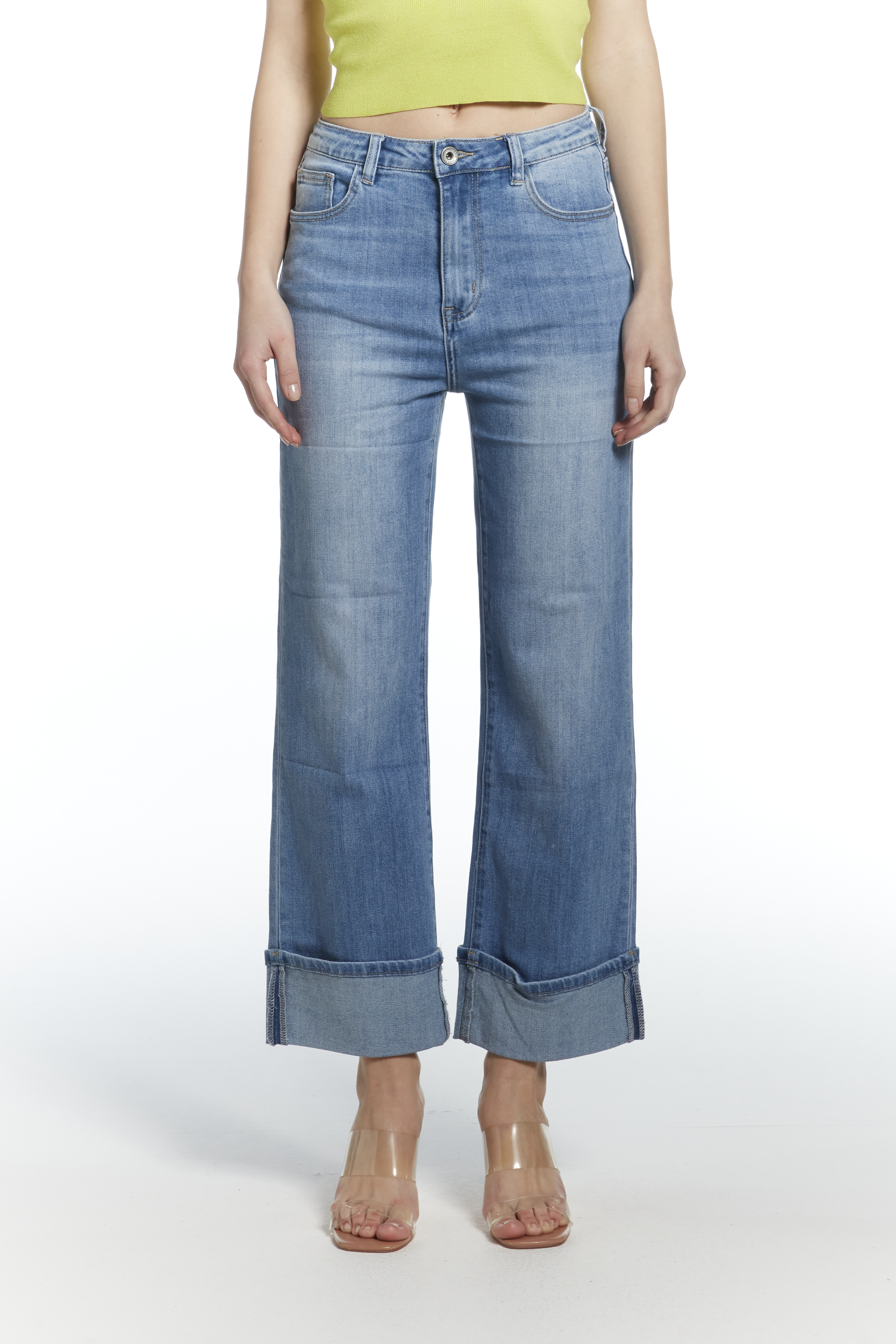 Módní džínové kalhoty a extra širokou nohavicí a vysokým pasem, zkrácená délka lem, vyrobeno Itálie
